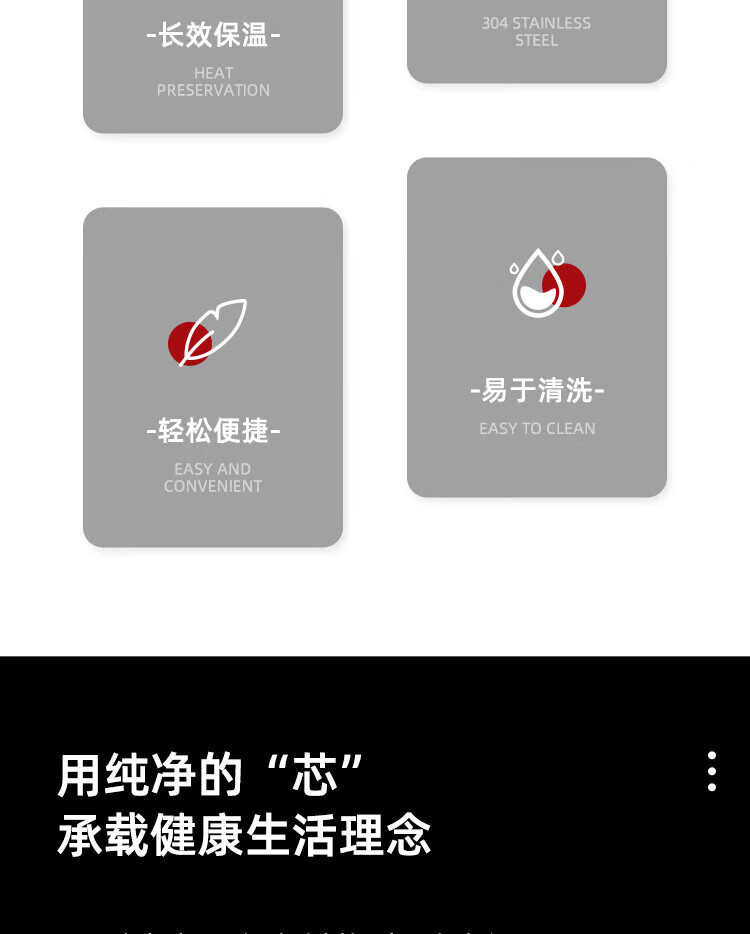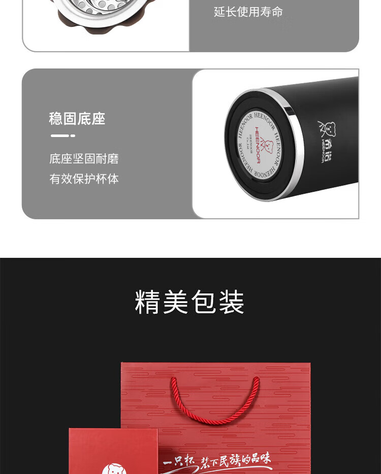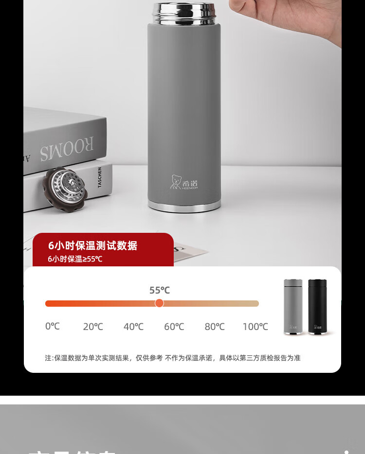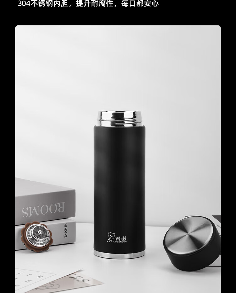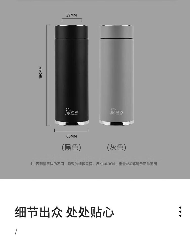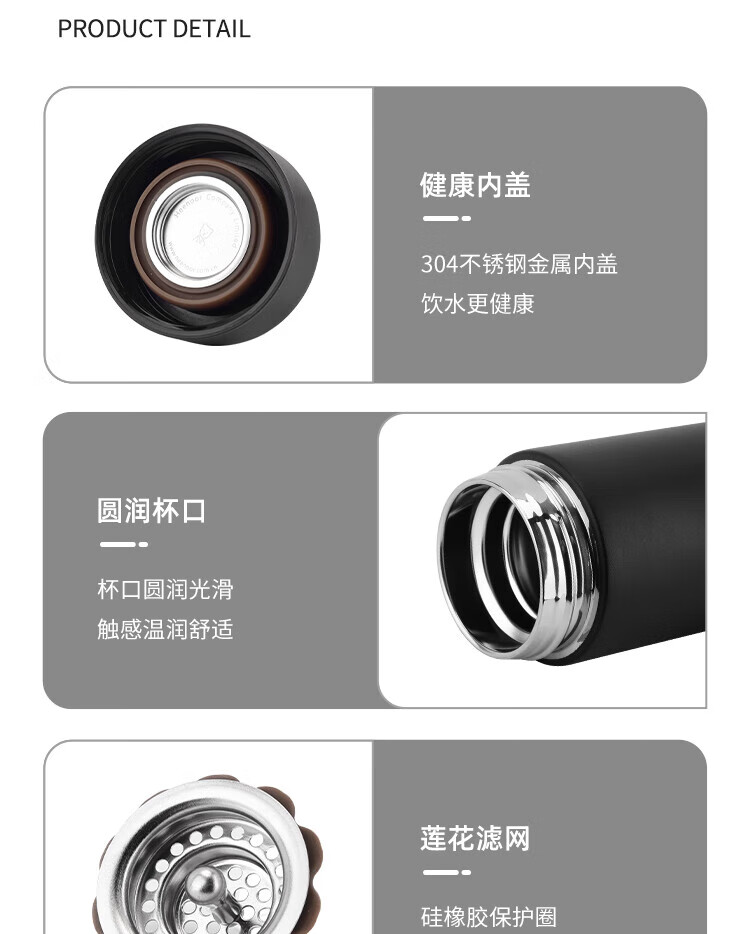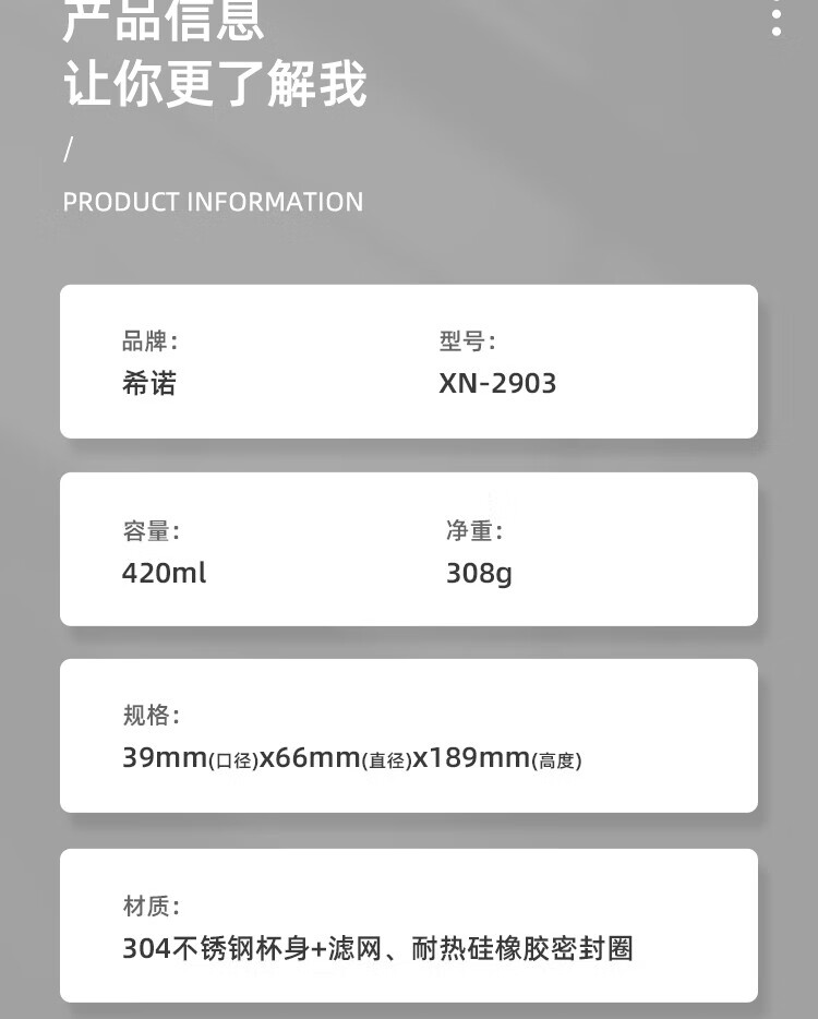 容量 XN-2903:420ml 规格(mm) XN-2903:39(杯口直径)x66(直径)x189(高度) 杯体 304不锈钢内胆 杯盖 进口食品级PP、304不锈钢内盖 滤网 304不锈钢、进口食品级硅胶 密封圈 进口食品级硅胶 重量 XN-2903:0.31kg 颜色 XN-2903:黑色