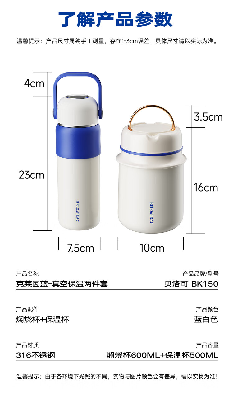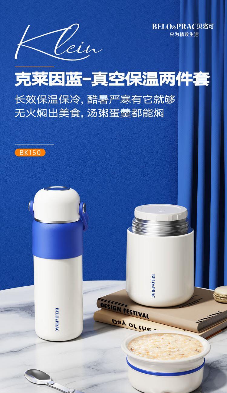 品 牌: 贝洛可 产品型号:BK150 产品容量:焖烧杯600ml&保温杯500ml 产品材质:316不锈钢 彩盒尺寸:22.5*12.5*25cm 外箱尺寸:64*46.5*52cm 装 箱数:20套 执行标准:GB4806.9-2016