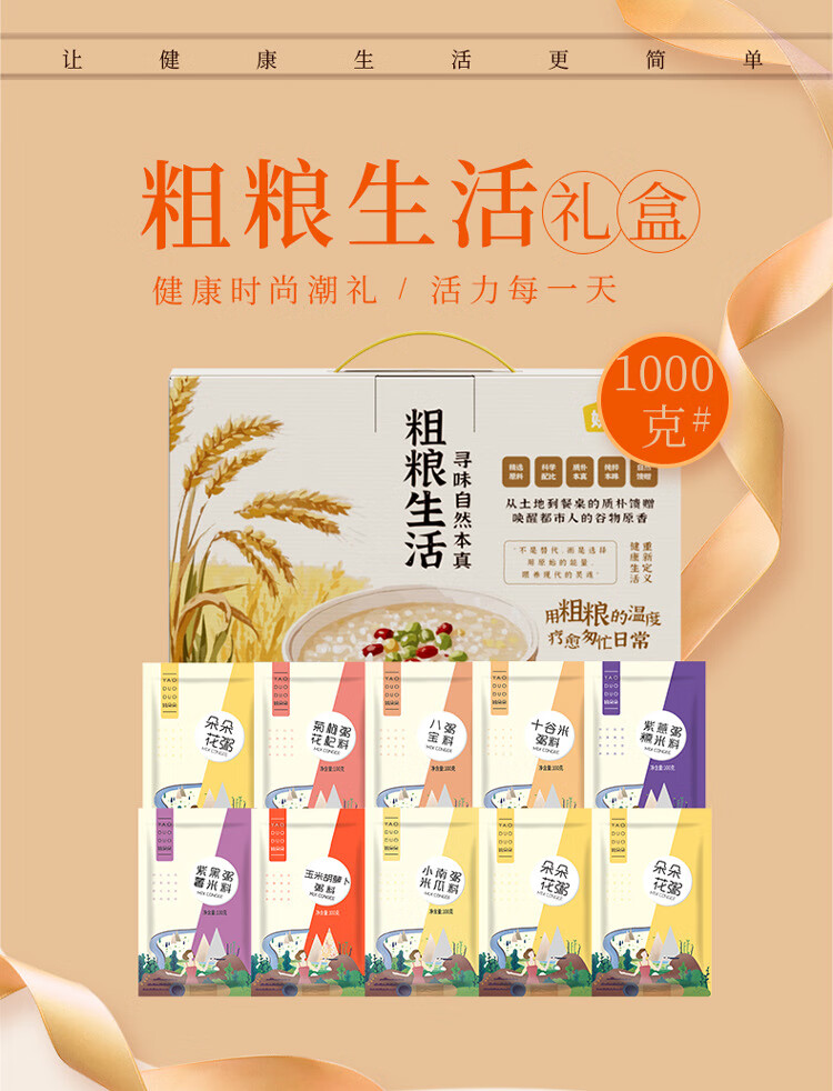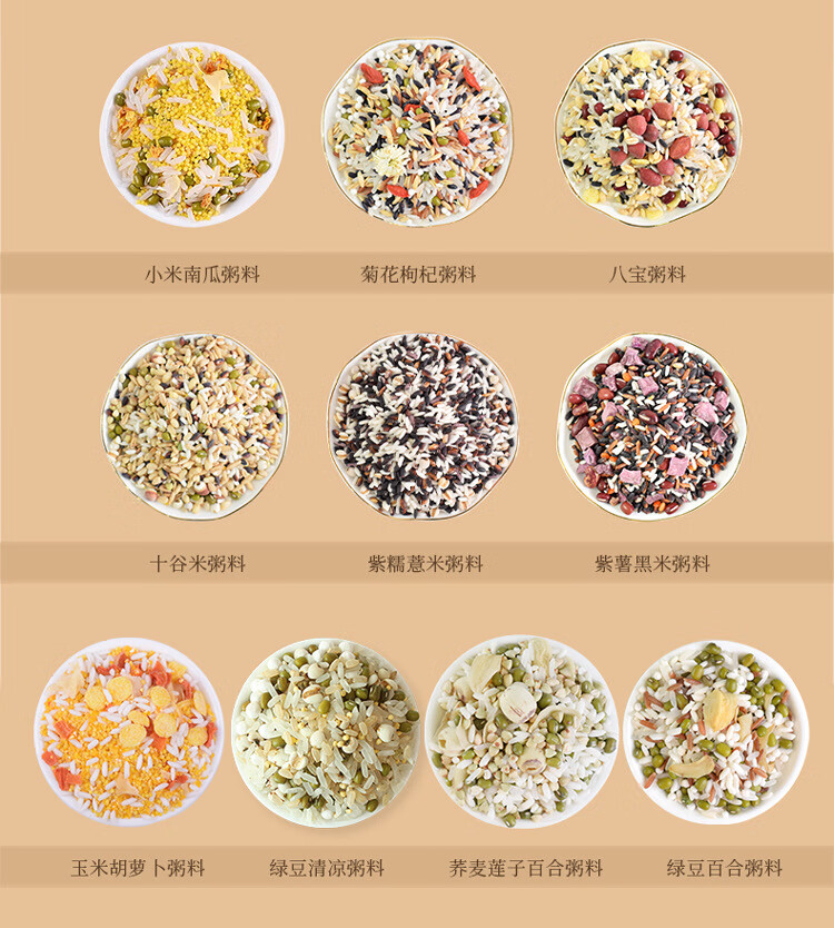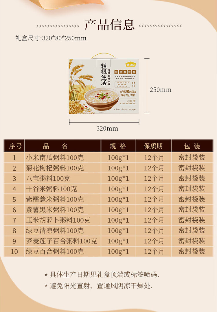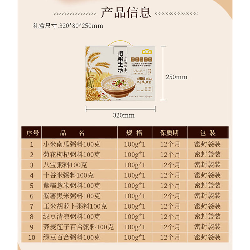 小米南瓜粥料100克 菊花枸杞粥料100克 八宝粥料100克 十谷米粥料100克 紫糯薏米粥料100克 紫薯黑米粥料100克 玉米胡萝卜粥料100克 红豆薏米粥料100克 荞麦莲子百合粥料100克 绿豆百合粥料100克 粗粮生活礼盒-定制款