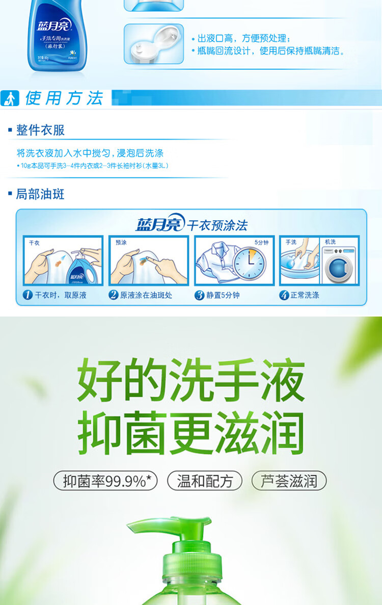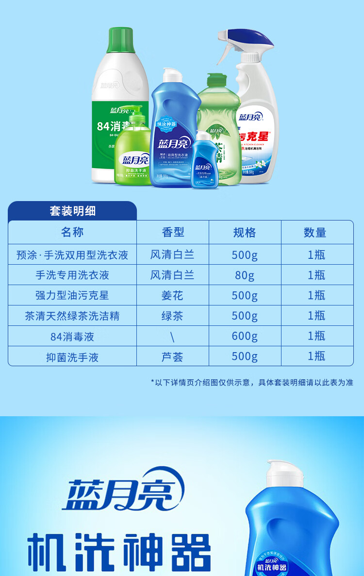 预涂手洗双用型洗衣液翻盖装500g*1 强力型油污克星500g*1 茶清洗洁精500g*1 84消 毒液600g*1 芦荟抑 菌洗手液500g*1 手洗神器旅行装80g*1