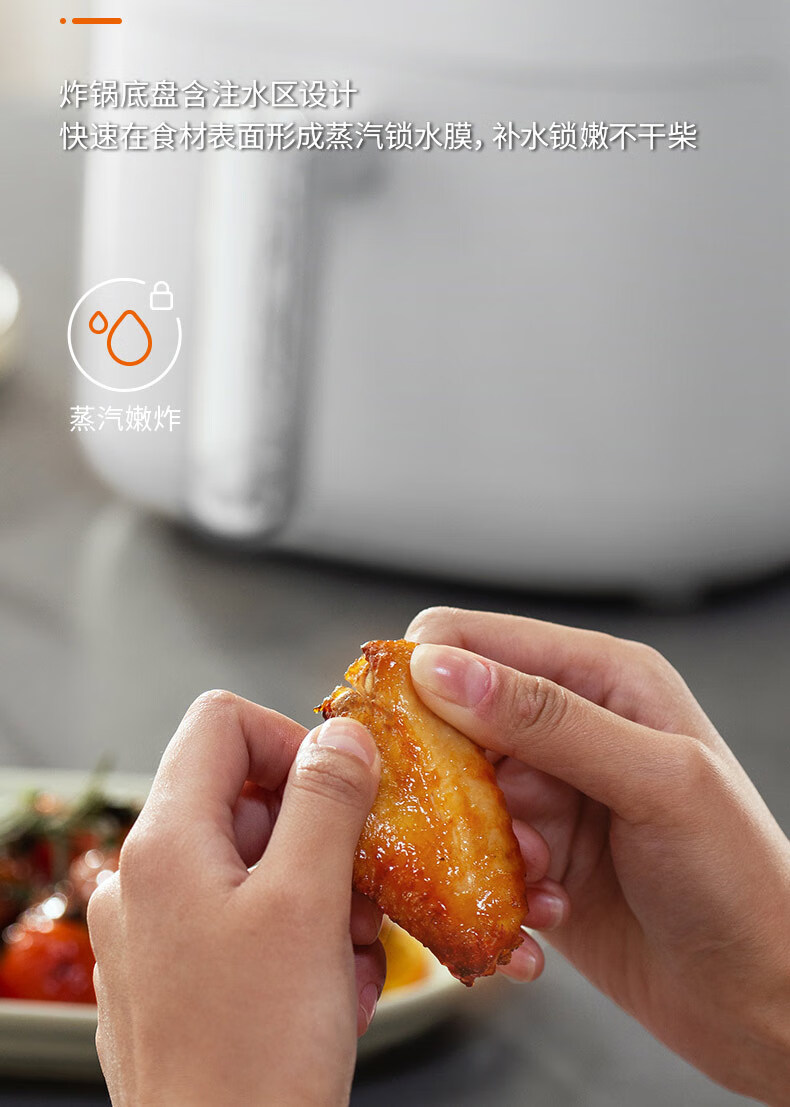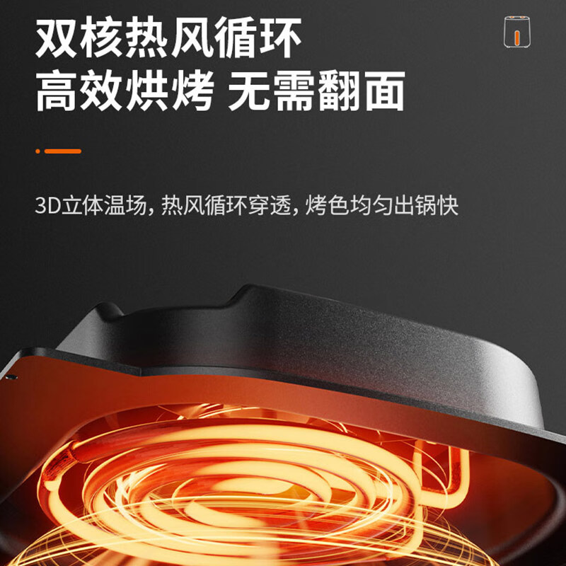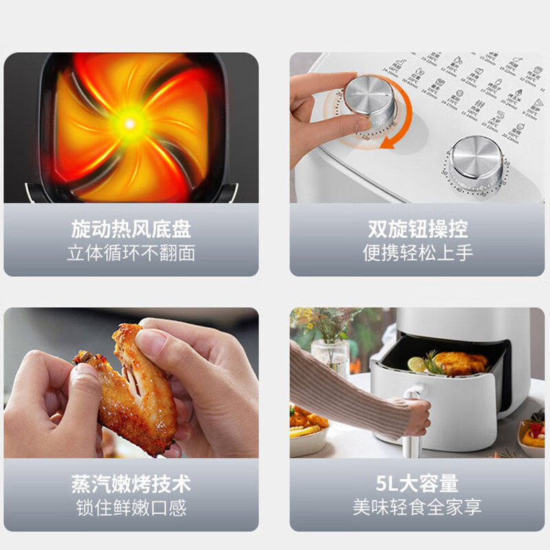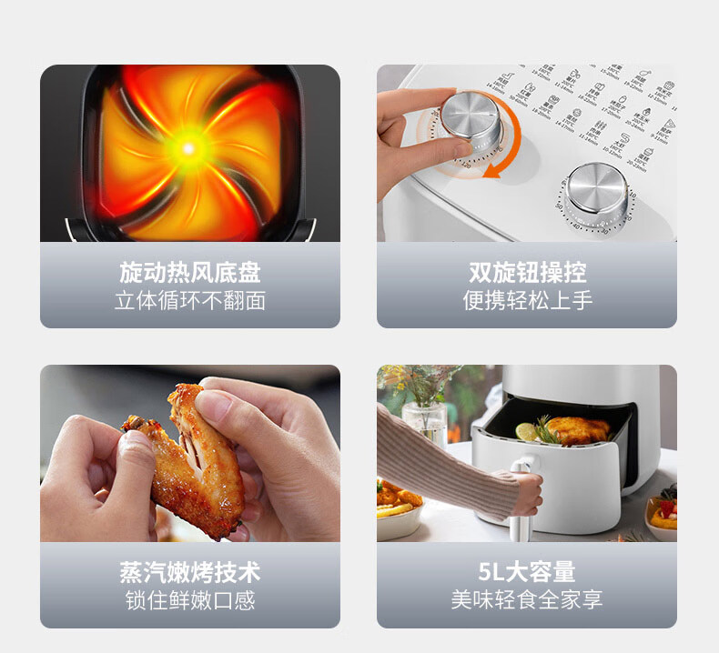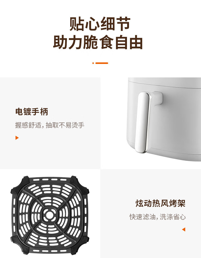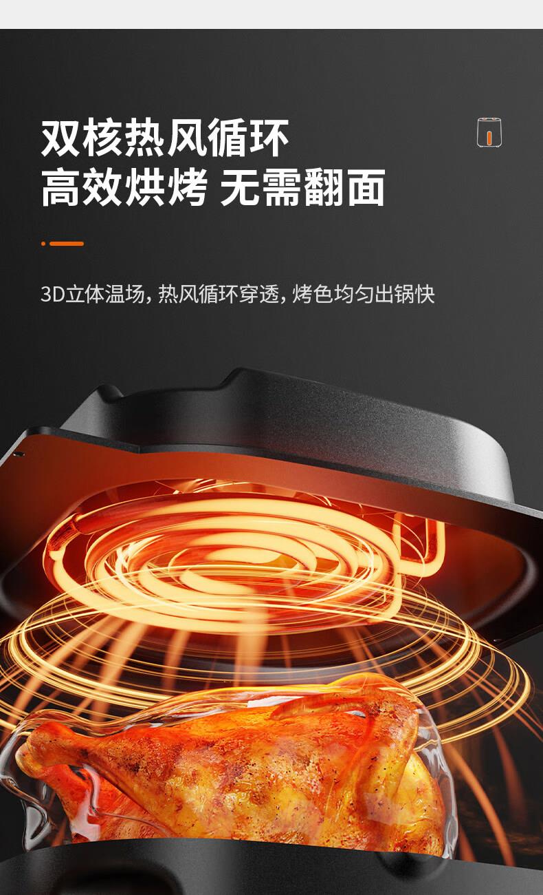 1、5L容量 2、无油煎炸,360°导风风道更高速,底部漩涡热 流更均匀 3、烤架式炸篮易清洁,隐藏式发热管更安