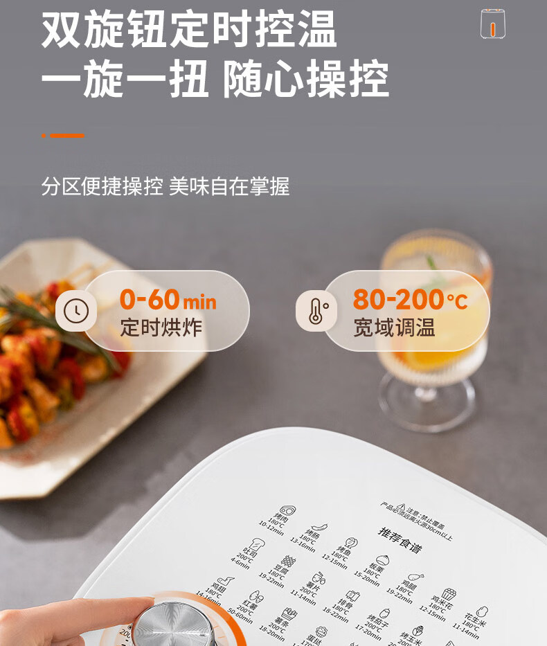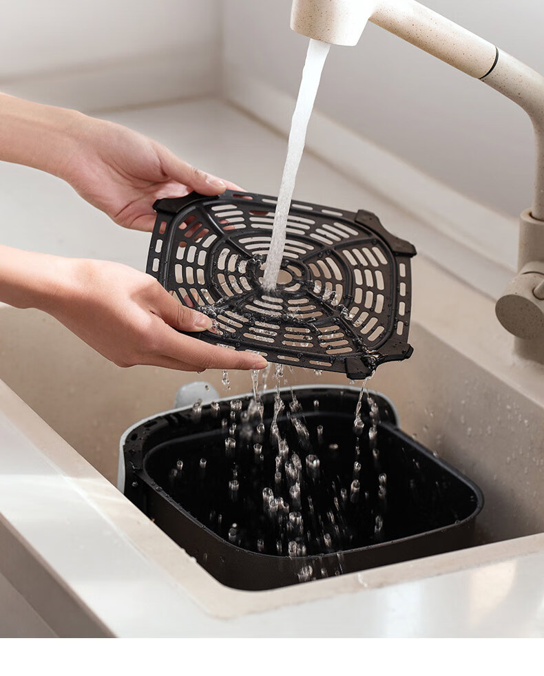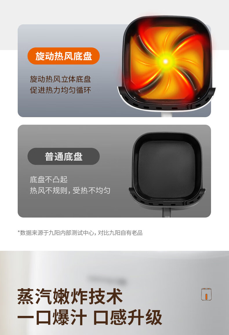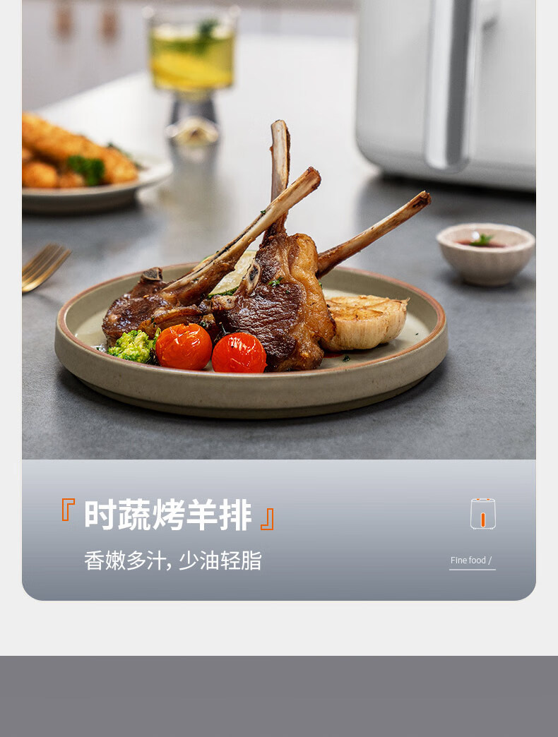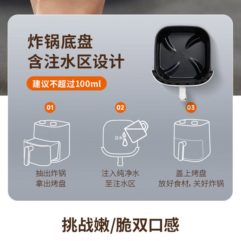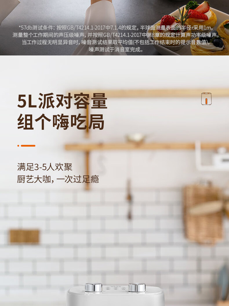 1、5L容量 2、无油煎炸,360°导风风道更高速,底部漩涡热 流更均匀 3、烤架式炸篮易清洁,隐藏式发热管更安