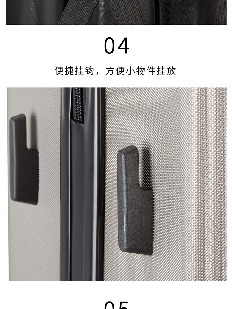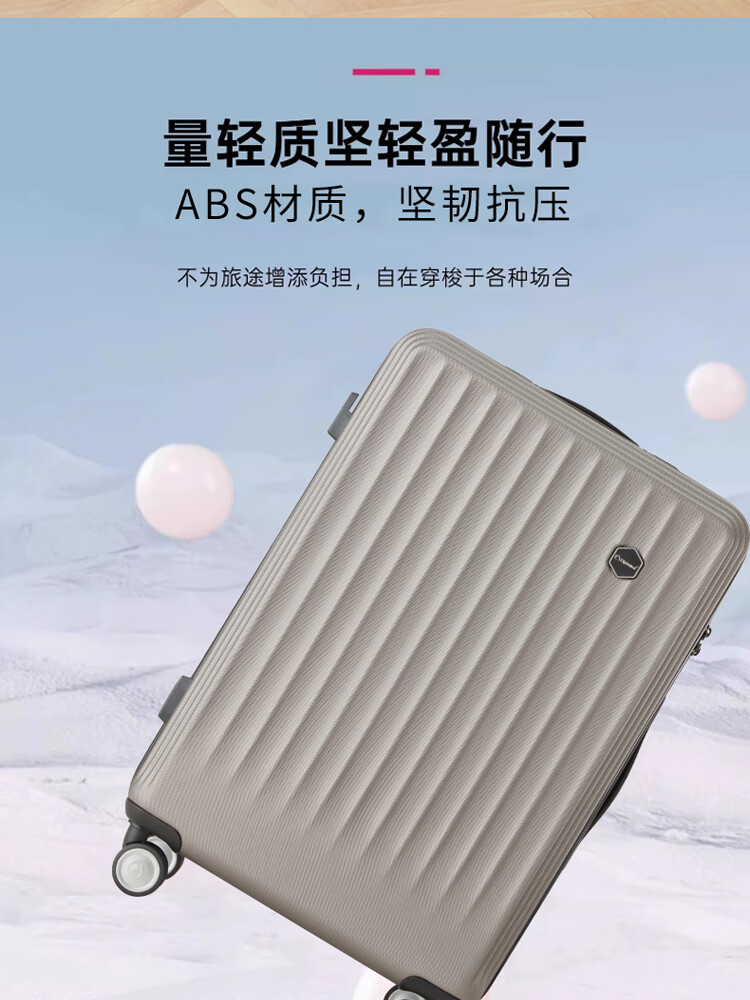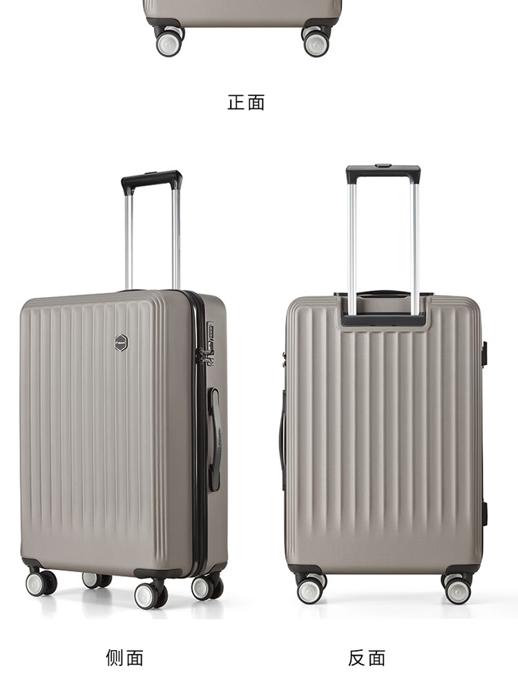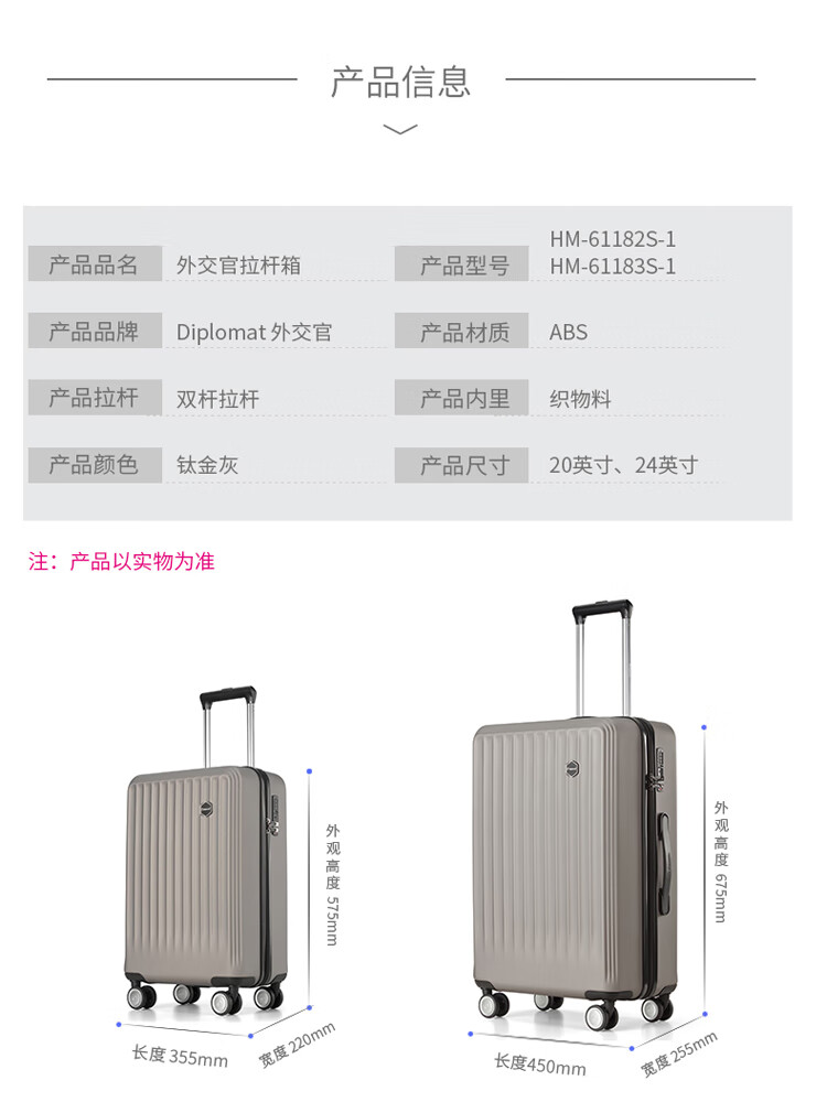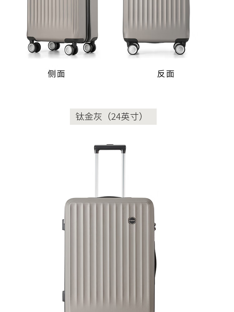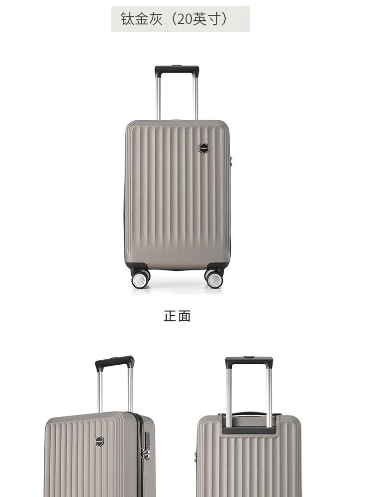 产品材质:ABS 产品颜色:钛金灰 外观尺寸:355*220*575mm /20英寸 产品条码:6958698326008 /20英寸 产品包装:邮购盒