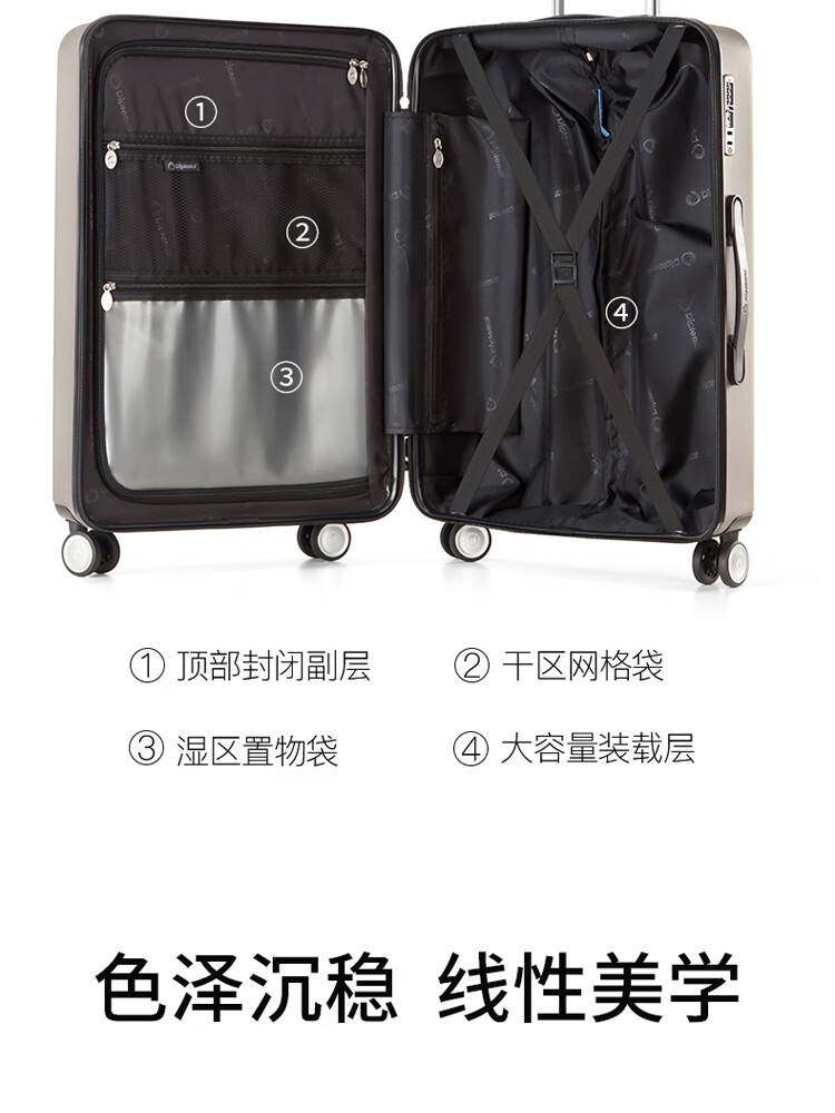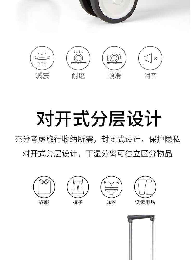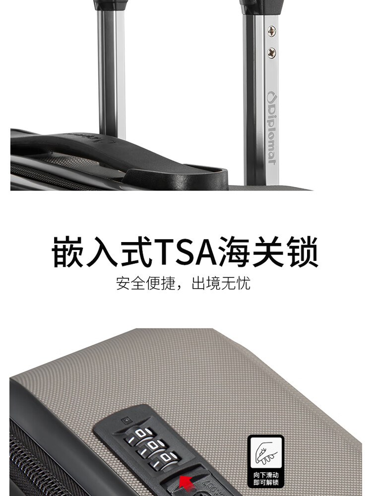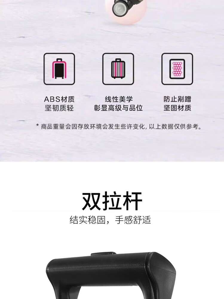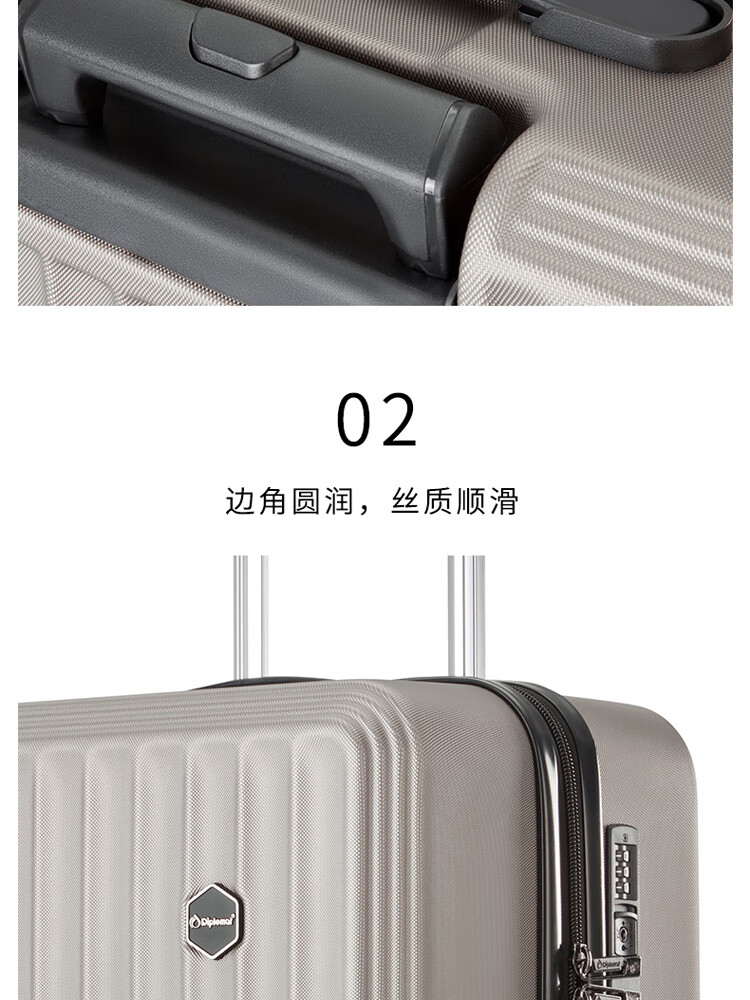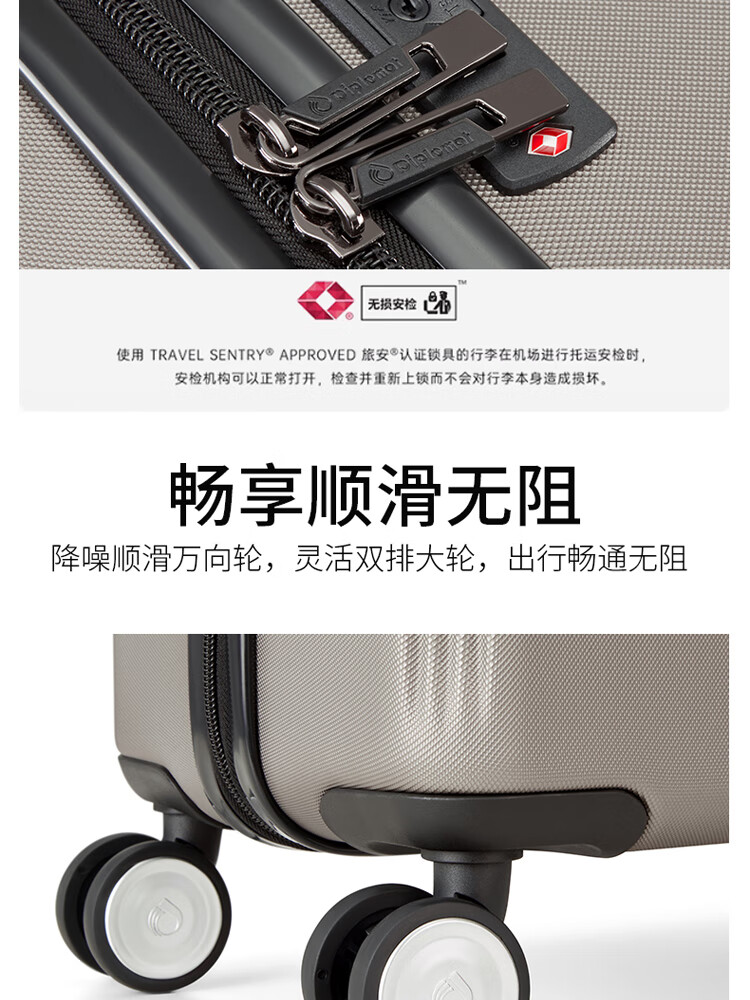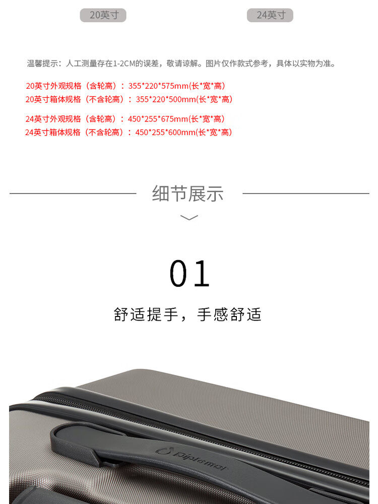 产品材质:ABS 产品颜色:钛金灰 外观尺寸:355*220*575mm /20英寸 产品条码:6958698326008 /20英寸 产品包装:邮购盒