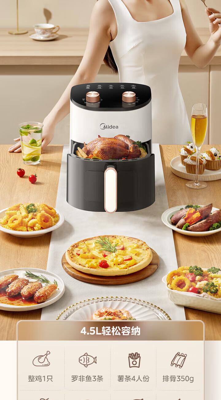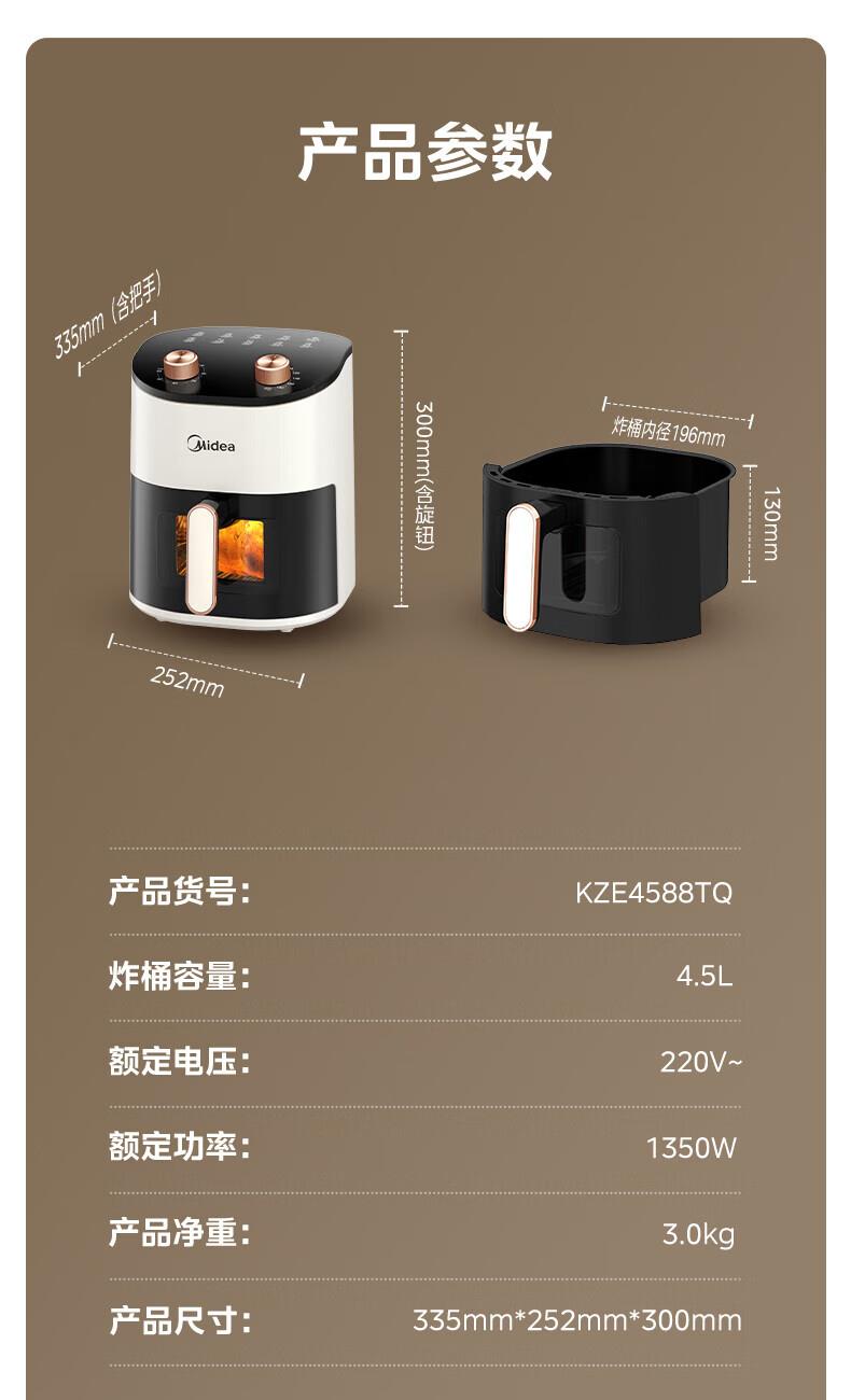 容量:4.5L 额定功率:1350W定额电压:220V~操控方式:双旋钮操作开门方式:抽拉式 毛重:3.7 kg包装尺寸:300 x 300 x 348 mm