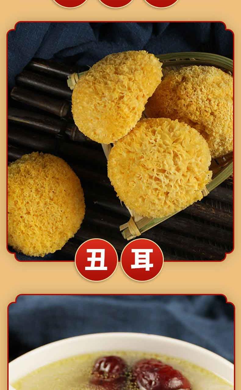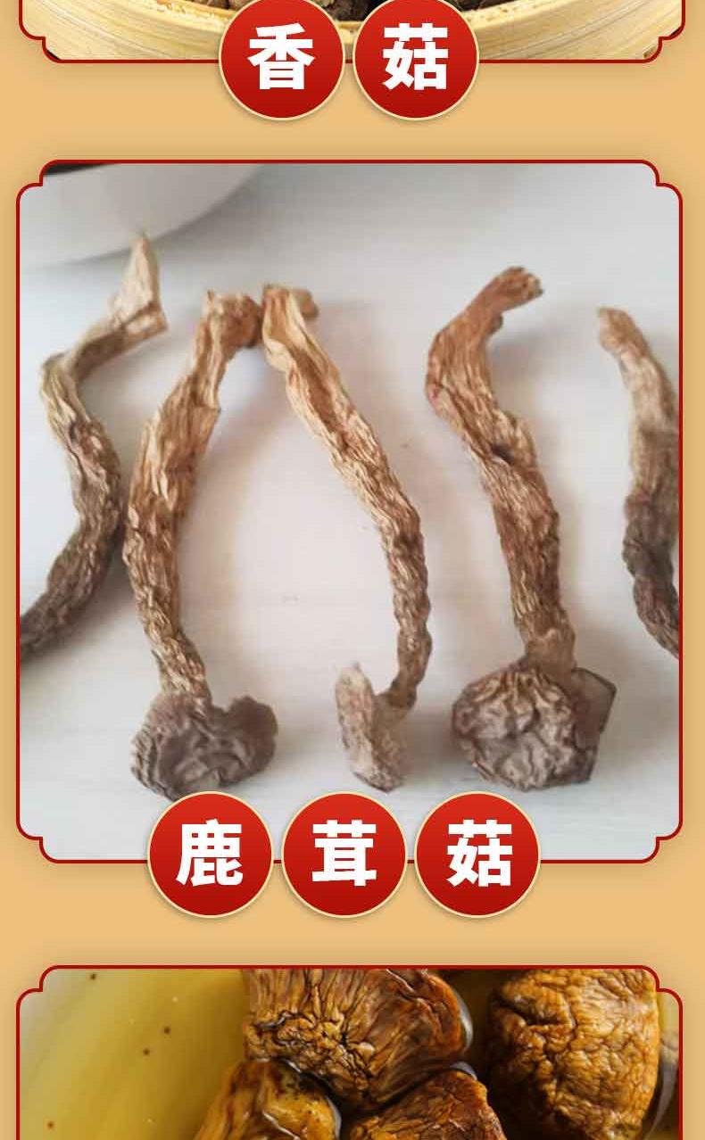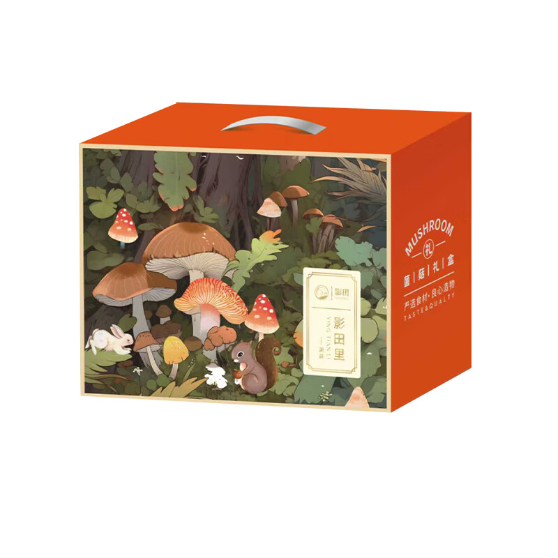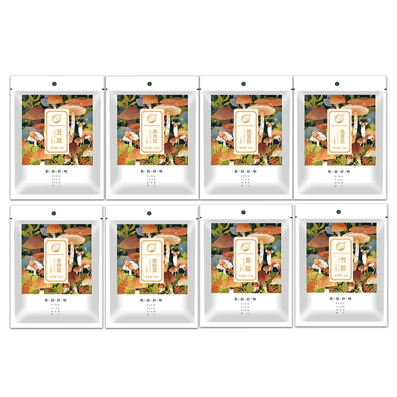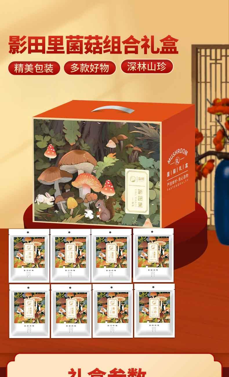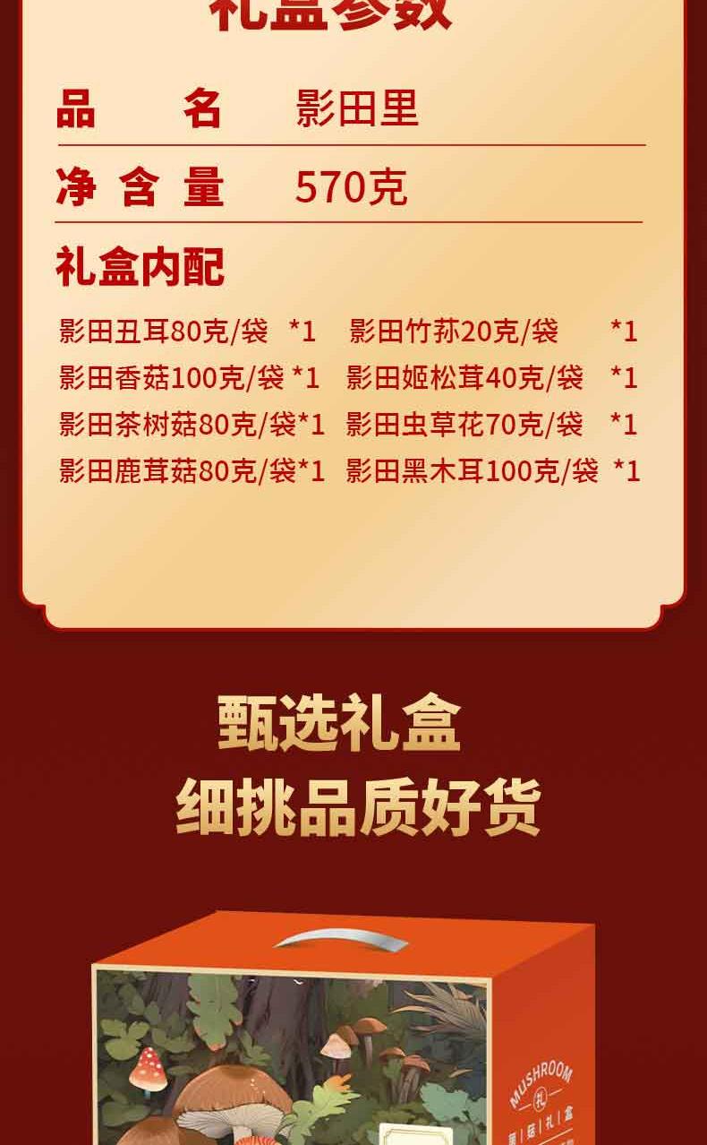 礼盒内配: 影田丑耳80g*1 影田竹荪20g*1 影田香菇100g*1 影田姬松茸40g*1 影田茶树菇80g*1 影田虫草花70g*1 影田鹿茸菇80g*1 影田黑木耳100g*1