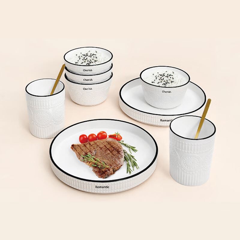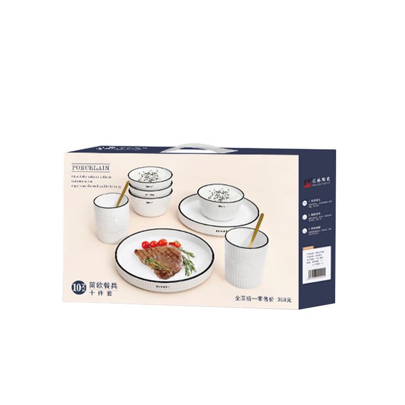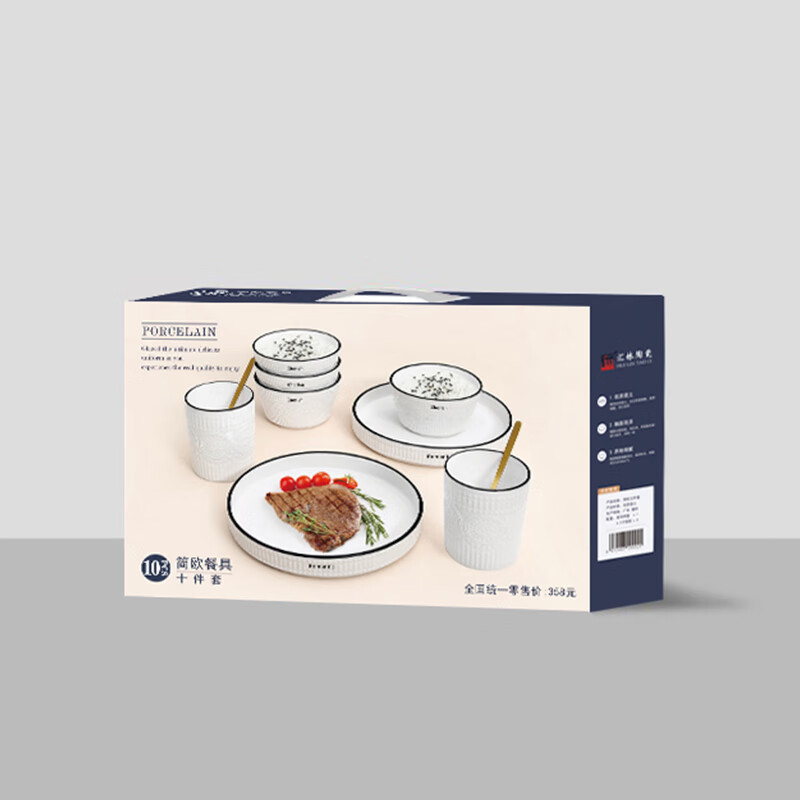 产品材质:陶瓷 产品规格:4.5寸饭碗 * 4 太阳花杯 * 2、8寸饭盘 * 2 不锈钢勺 * 2 彩盒尺寸:43.4x8.4x30
