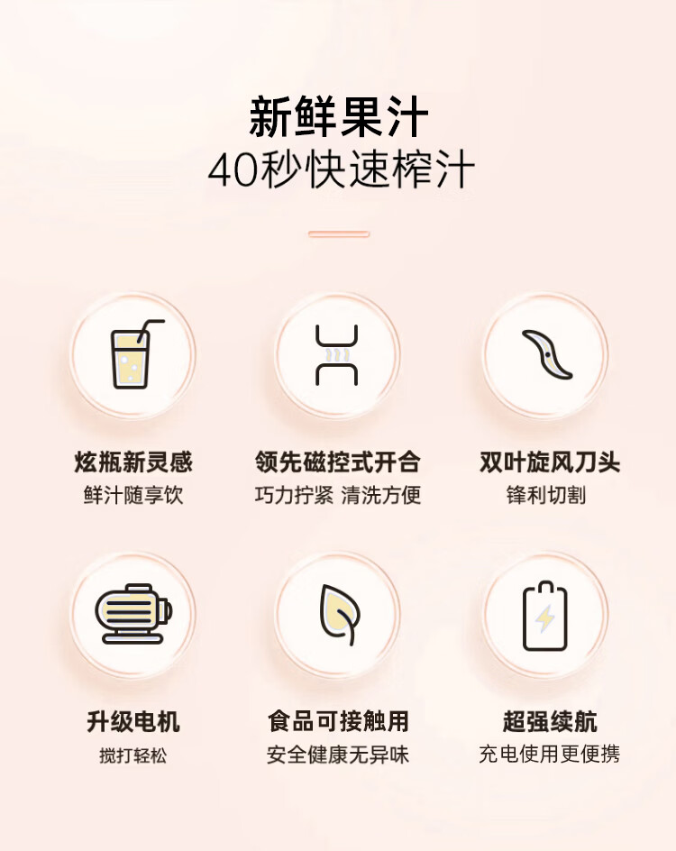 型号:EJJ3125WHT 功率:40W 电压:5V/1A 容量:300mL 毛重:0.45Kg 装 数:40台 /箱 材质:外壳AS+304不锈钢刀片 彩盒包装尺寸:102*102*219mm 外箱包装尺寸:50*460*460mm 商品条码:6943819198992
