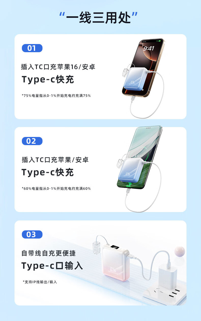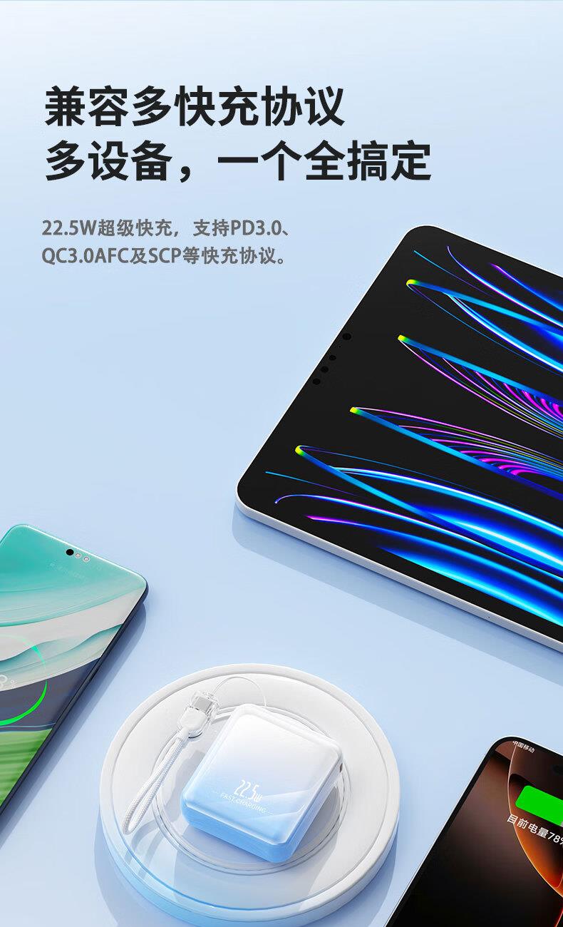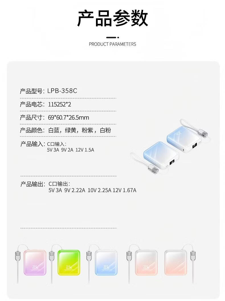 产品输入:C口输入:5V3A 9V 2A 12V 1.5A 产品输出:C口输出:5V 3A 9V 2.22A 10V 2.25A 12V 1.67A