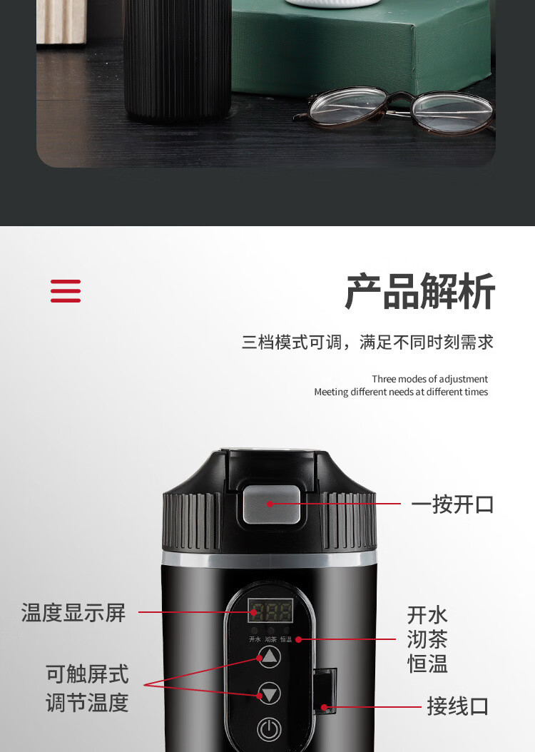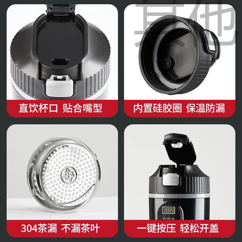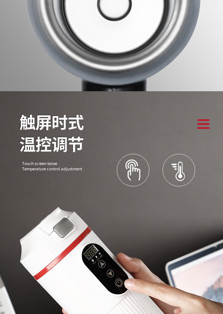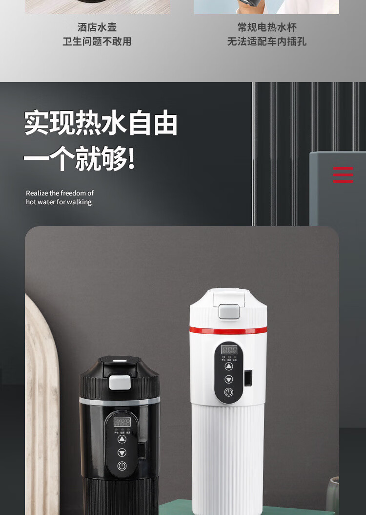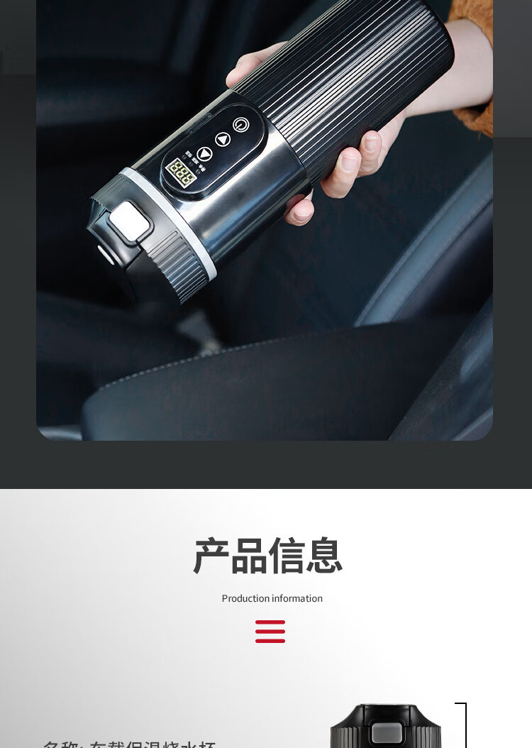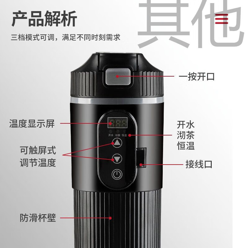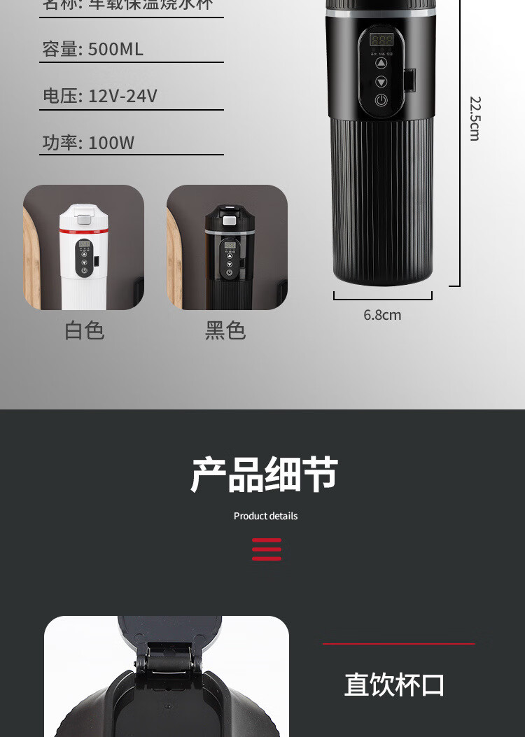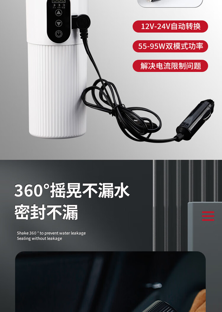 产品型号 2302 供电方式 DC12V-30V 电压 12V-24V 温度 30℃-100℃ 功率 100W 功能 DC 加热-100W 容量 400ml 材质 不锈钢304 产品颜色 黑色、白色 产品尺寸 235*76mm 产品净重 0.28kg