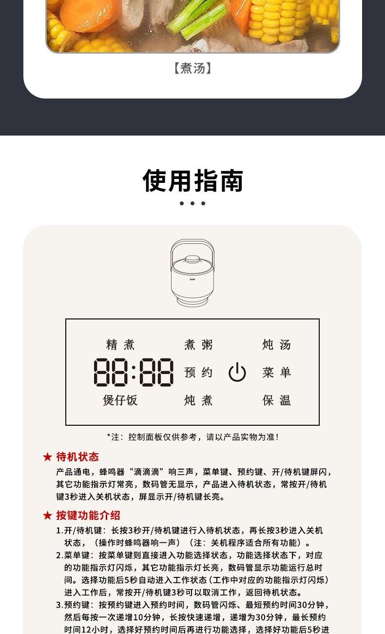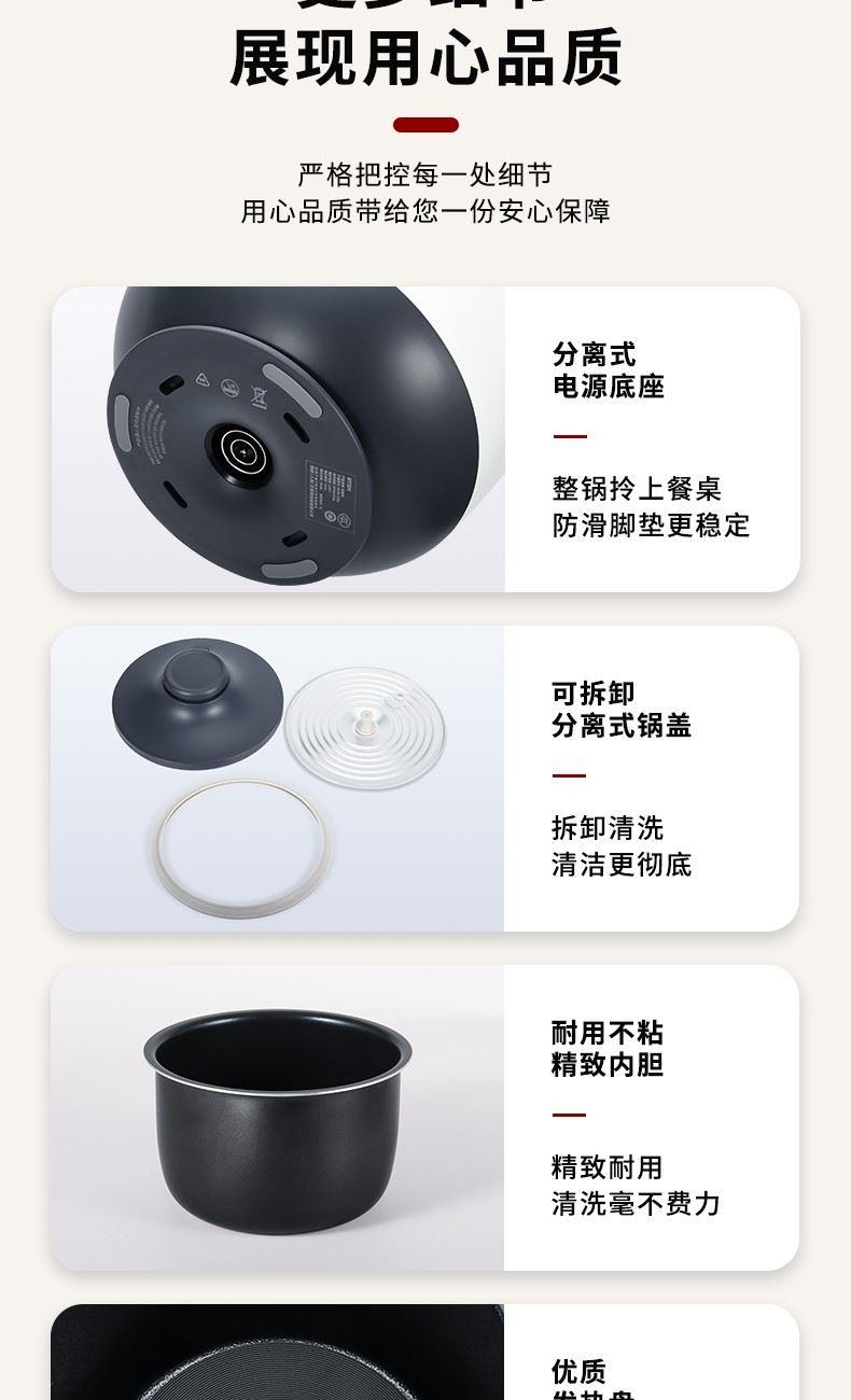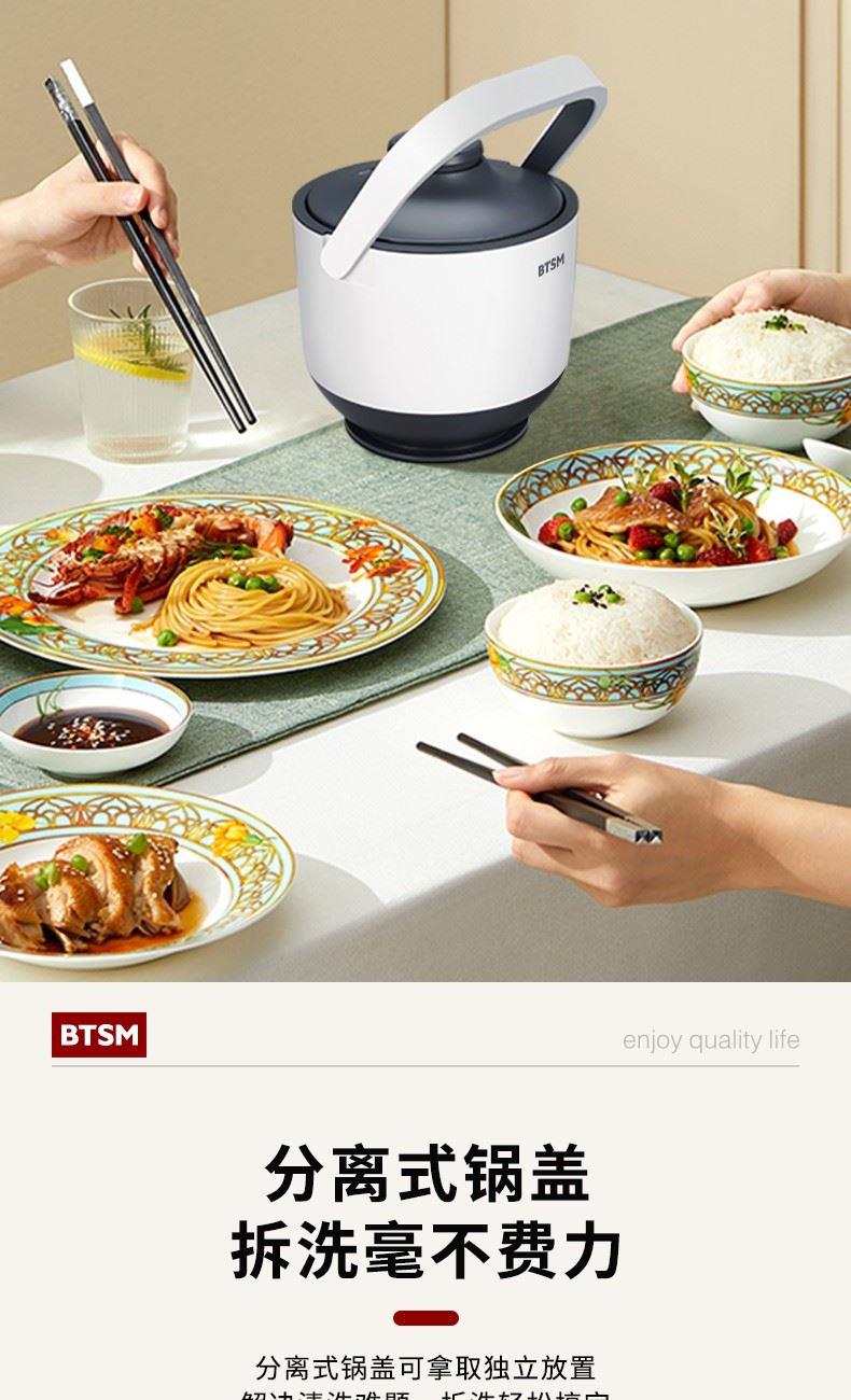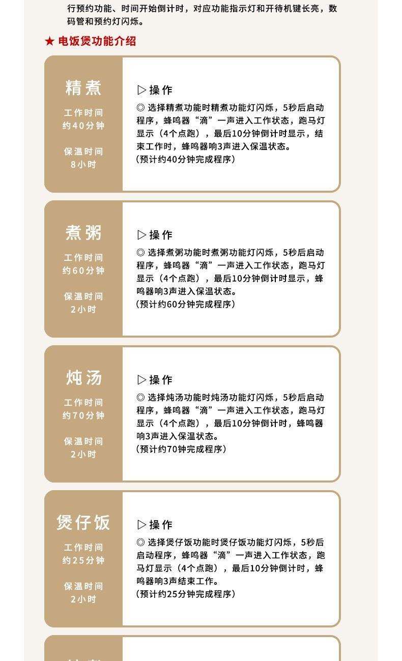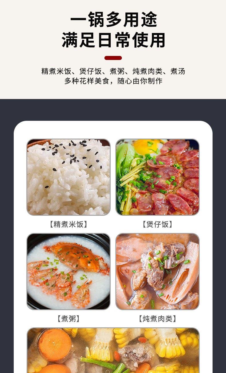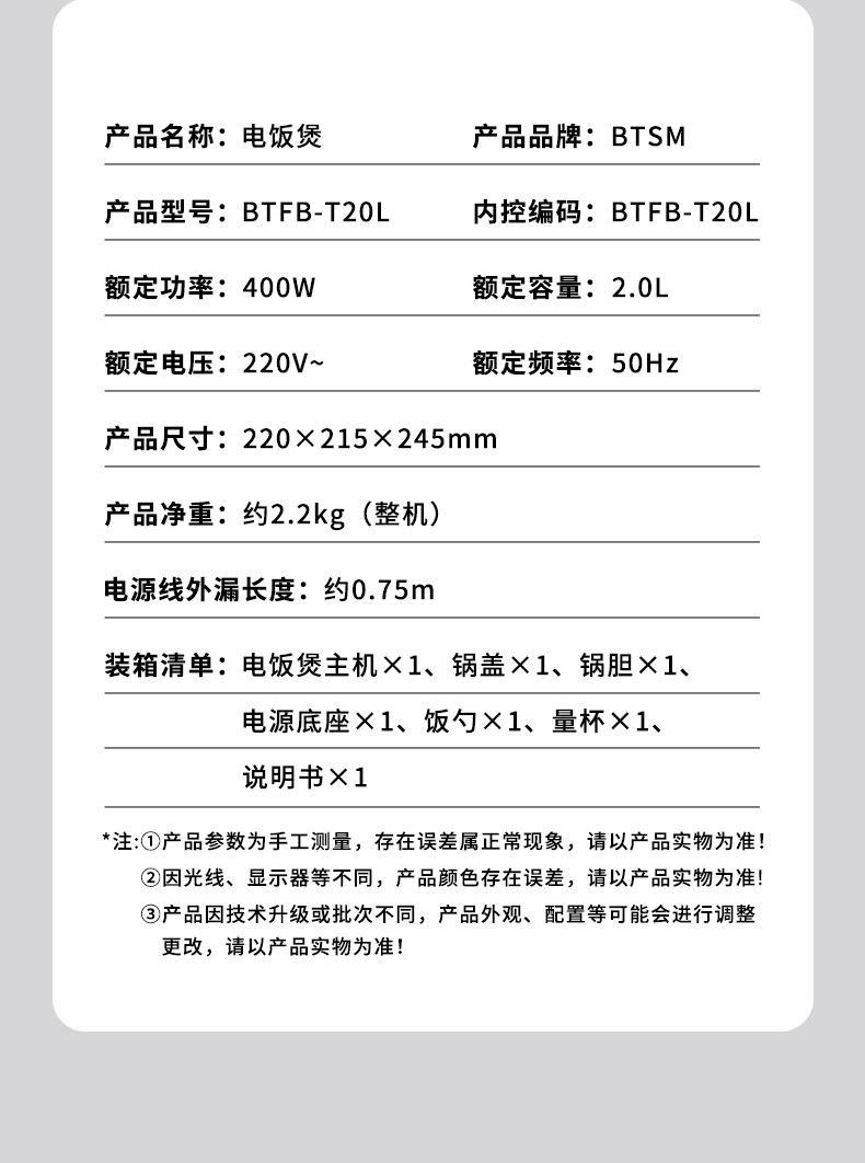 额定功率:400W 额定电压:220V~ 额定频率:50Hz 额定容量:2L 产品尺寸:260*210*320mm 产品材质:PP外壳 产品净重:约2.2kg(以产品实物为准) 加热方式:发热盘条 形 码:6971679081734 彩箱外尺寸:285*255*265mm 电源线外露长度:0.75m 装 箱清单:电饭煲*1、盖子*1、内胆*1、 电源底座*1、饭勺*1、量杯*1、 说明书*1
