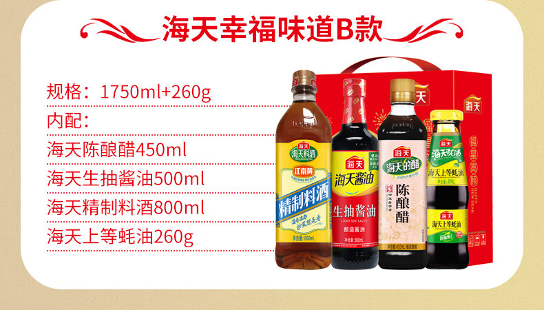 净含量:1750ml+260g 内配: 海天陈酿醋450ml*1 海天生抽酱油500ml*1 海天精制料酒800ml*1 海天上等蚝油260g*1 开门鸿运礼盒(小)*1