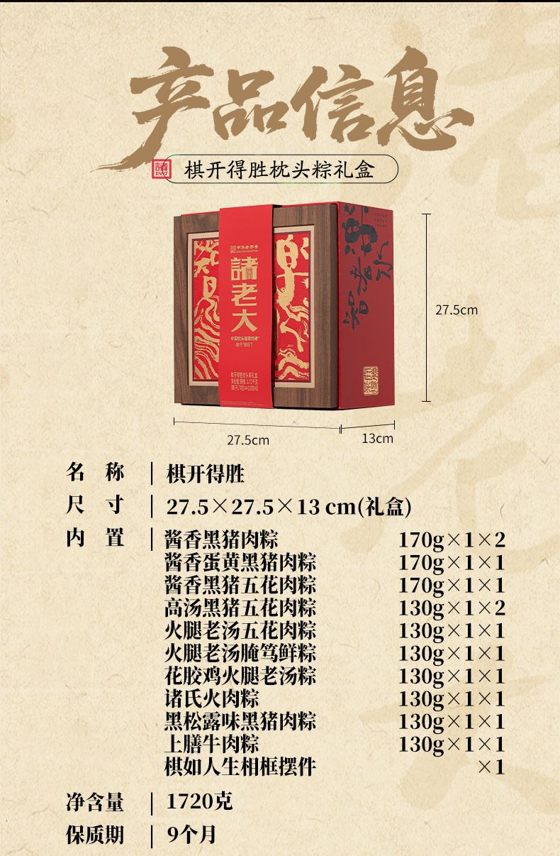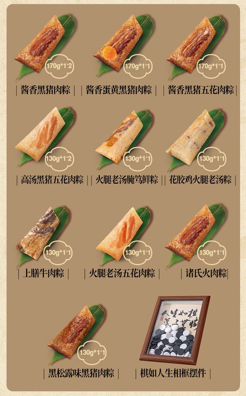 170克*2真空酱香黑猪肉粽 170克*1真空酱香蛋黄黑猪肉粽 170克*1真空酱香黑猪五花肉粽 130克*2真空高汤黑猪五花肉粽 130克*1真空火腿老汤五花肉粽 130克*1真空火腿老汤腌笃鲜粽 130克*1真空花胶鸡火腿老汤粽 130克*1真空诸氏火肉粽 130克*1真空黑松露味黑猪肉粽 130克*1真空上膳牛肉粽 棋如人生相框摆件