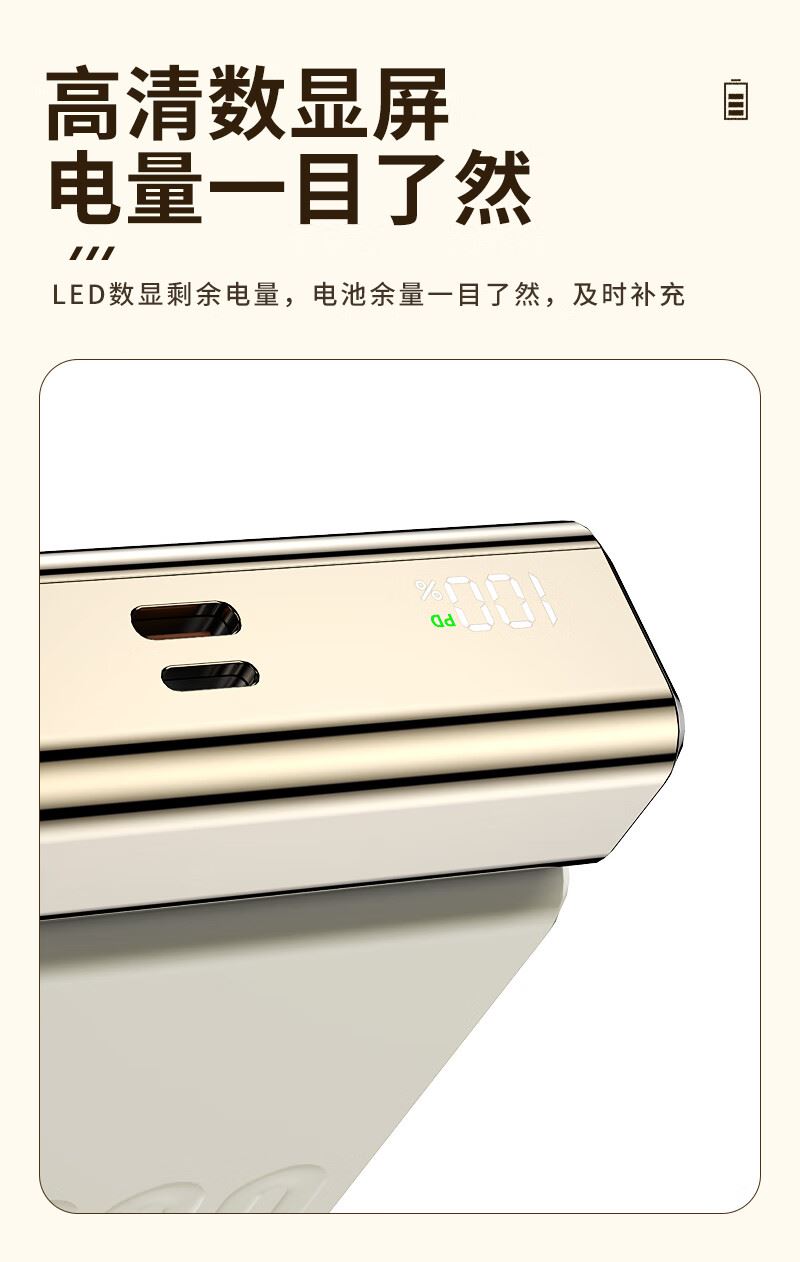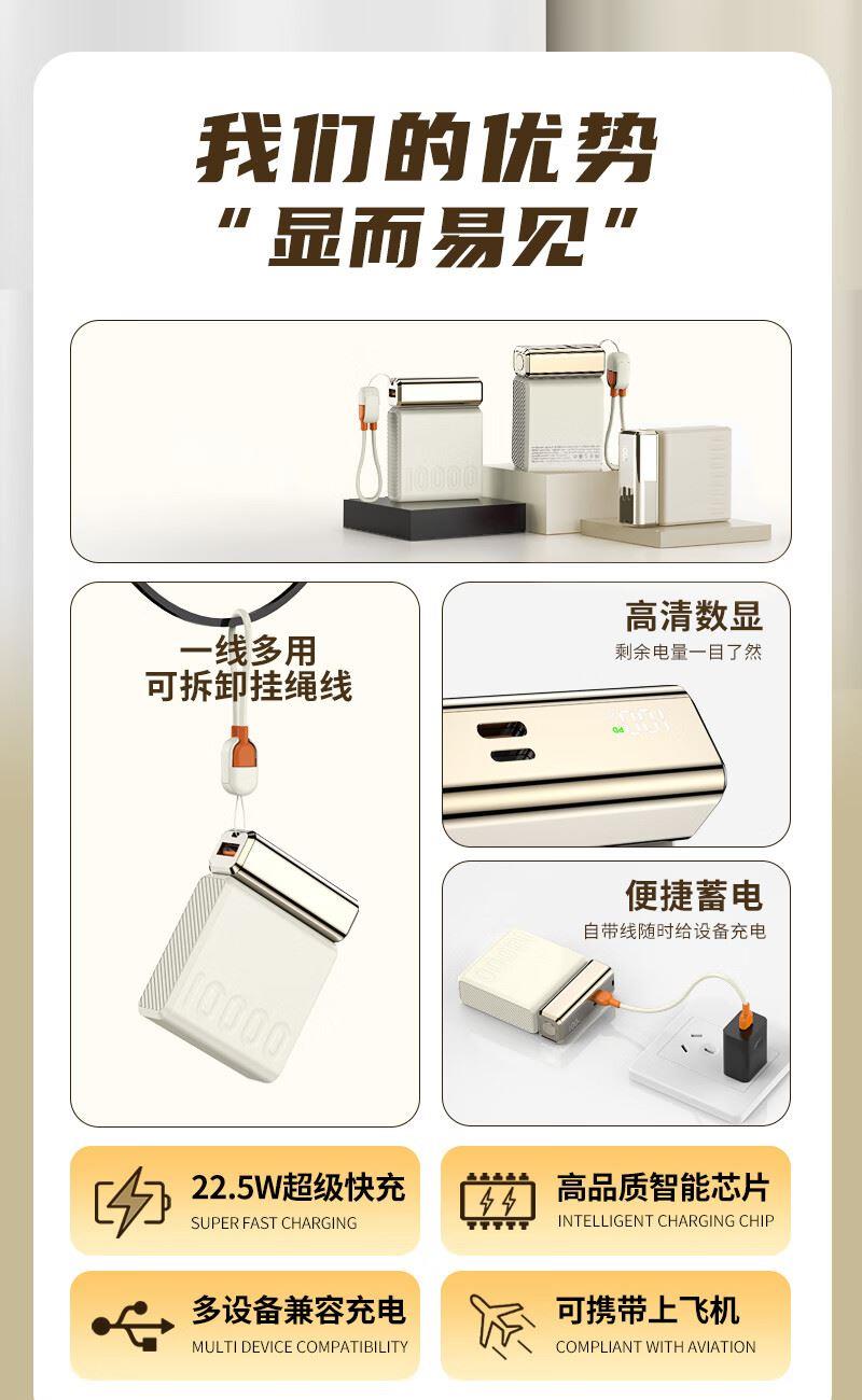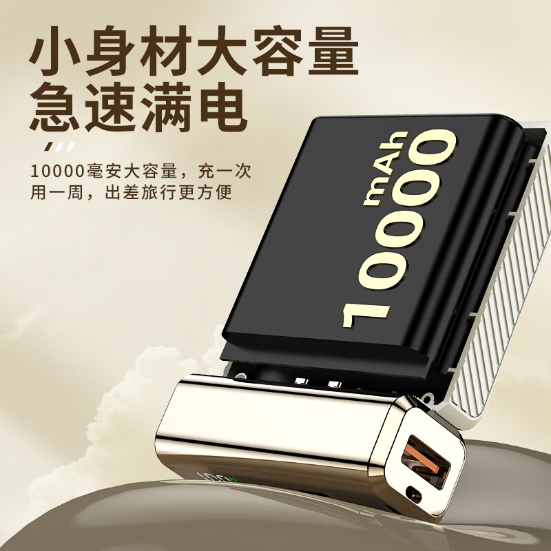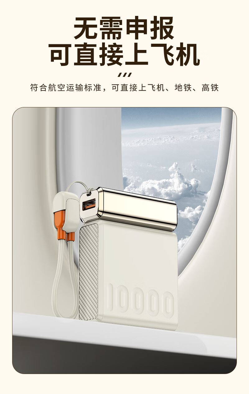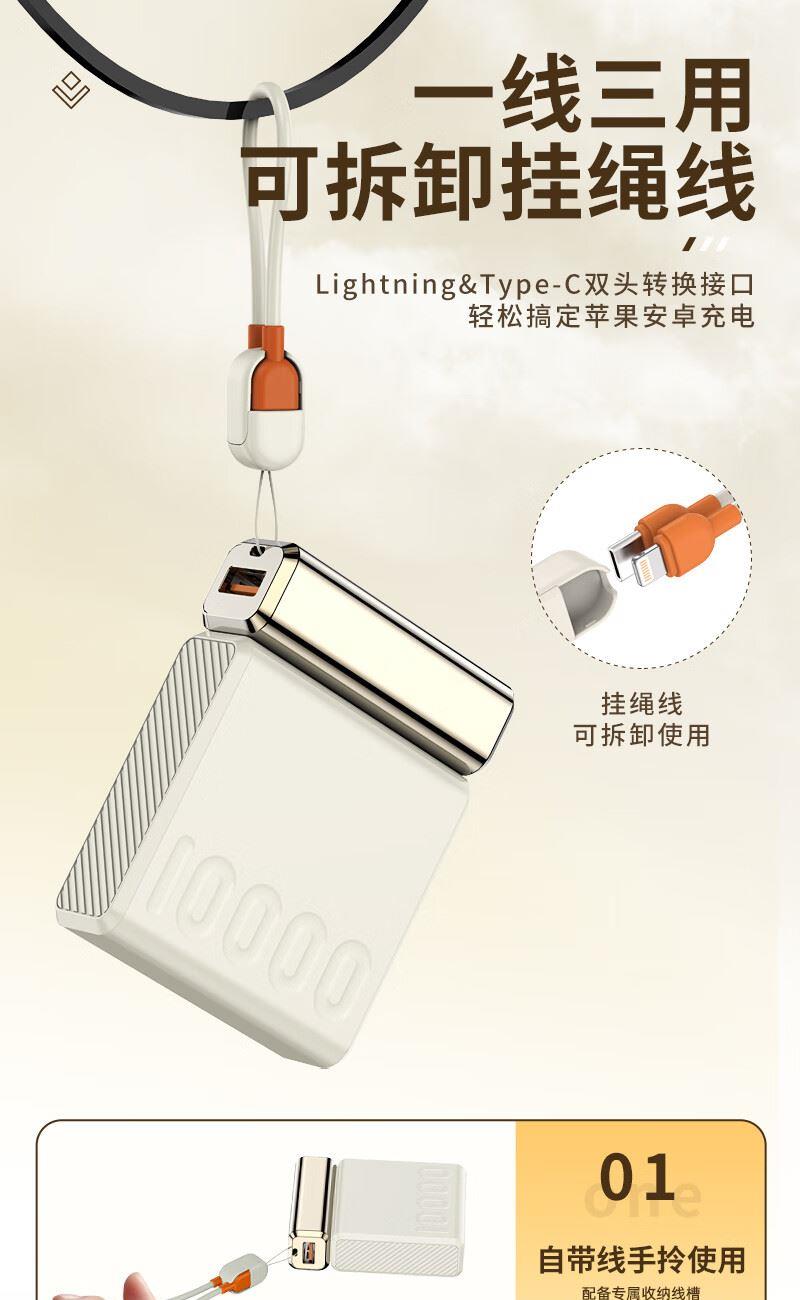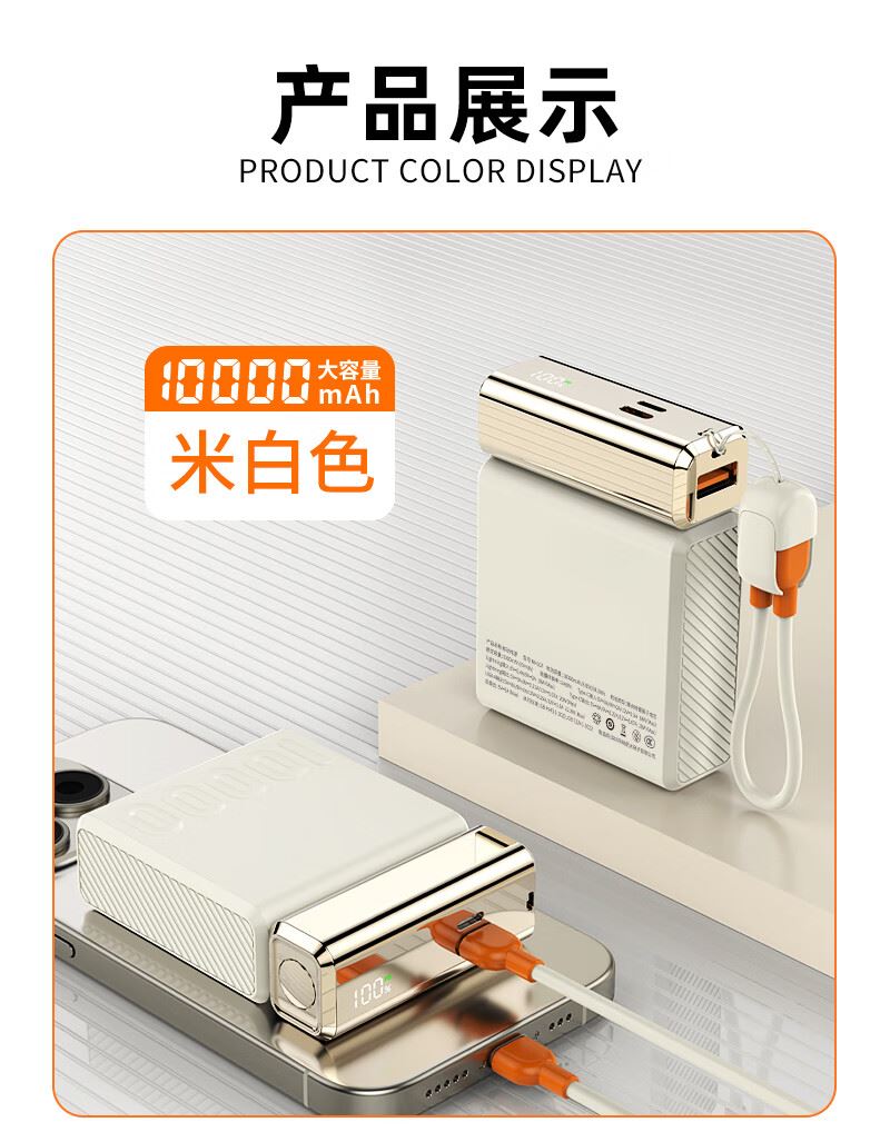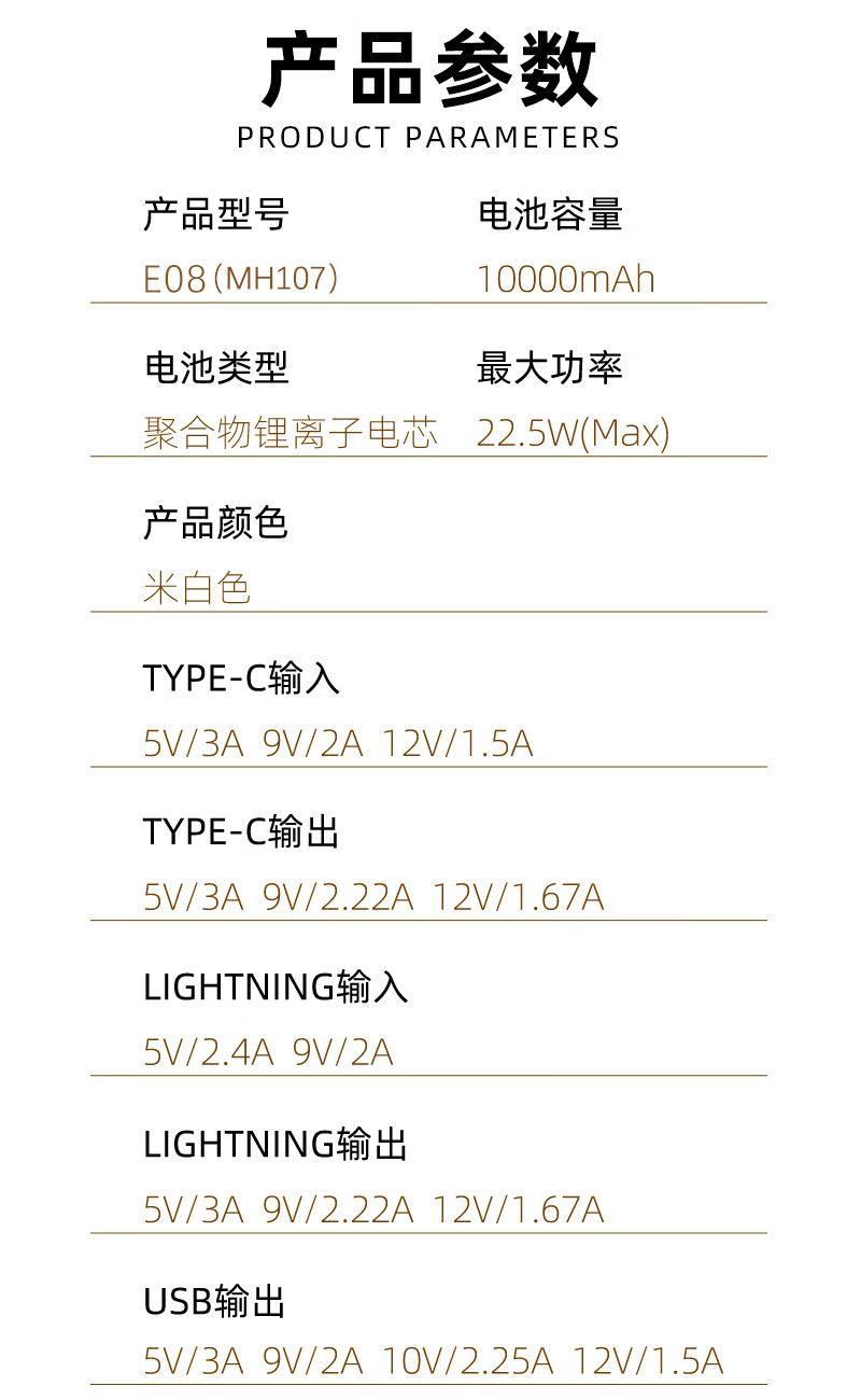 型号:MH107 容量:10000mAh(典型值) 颜色:米白色 材质:外壳ABS 线TPE 产品尺寸:83*62*23.8mm 包装尺寸:168*103*36mm 产品重量:183g