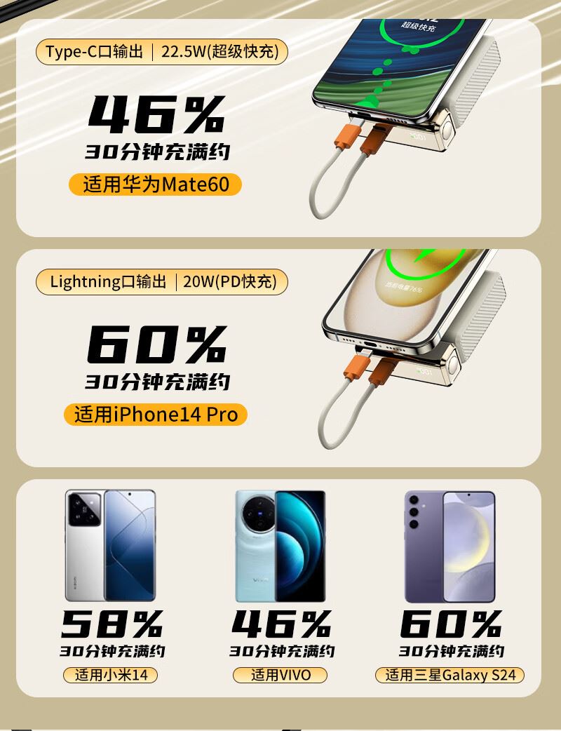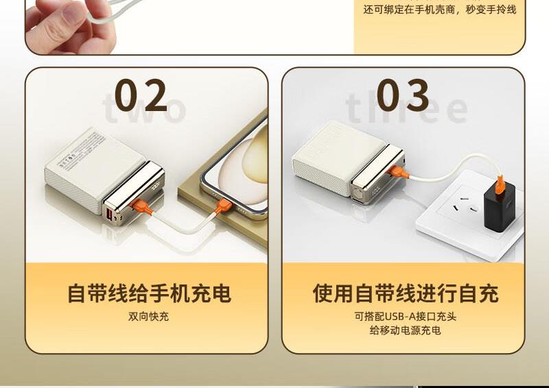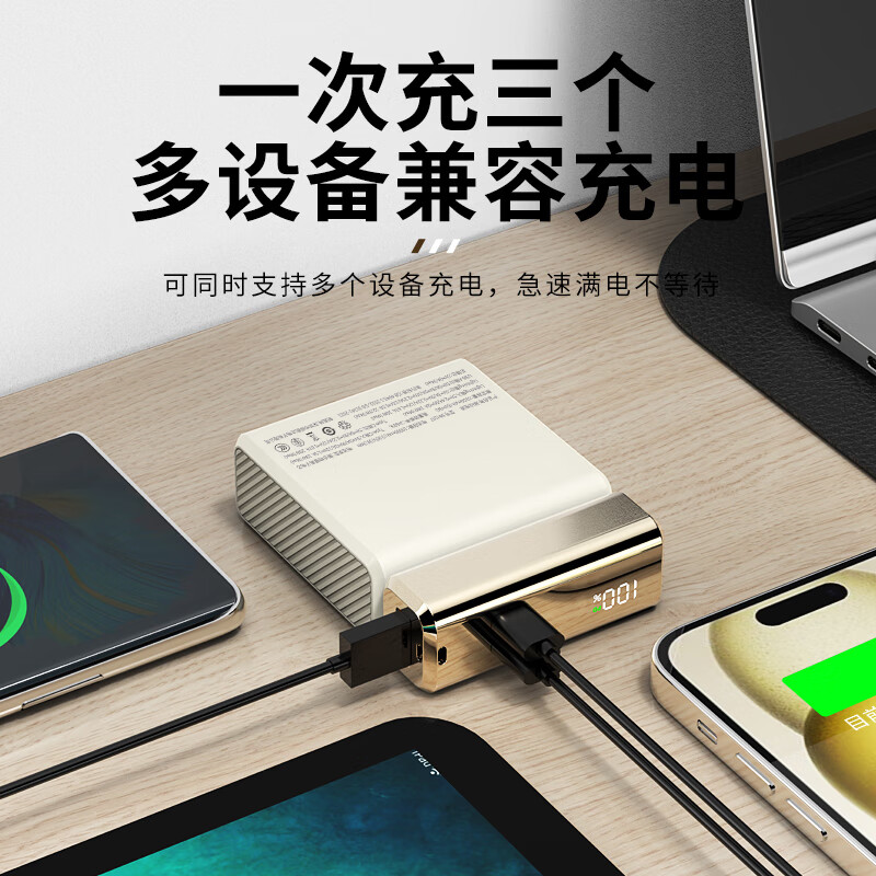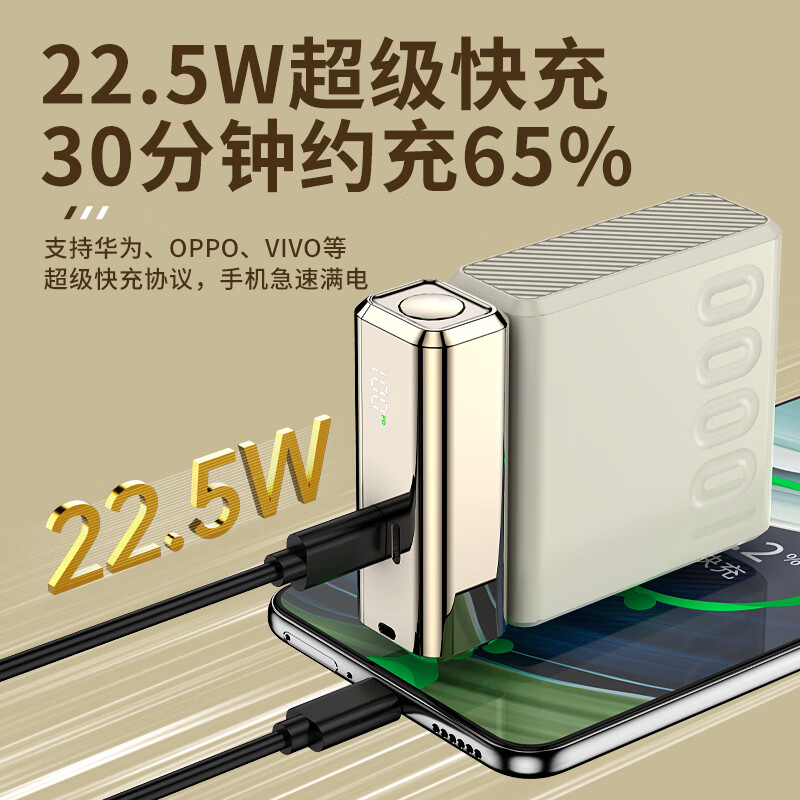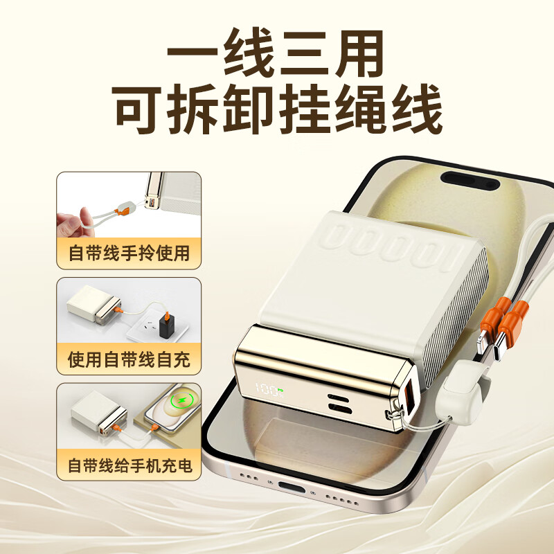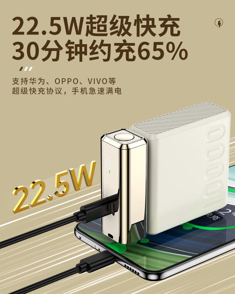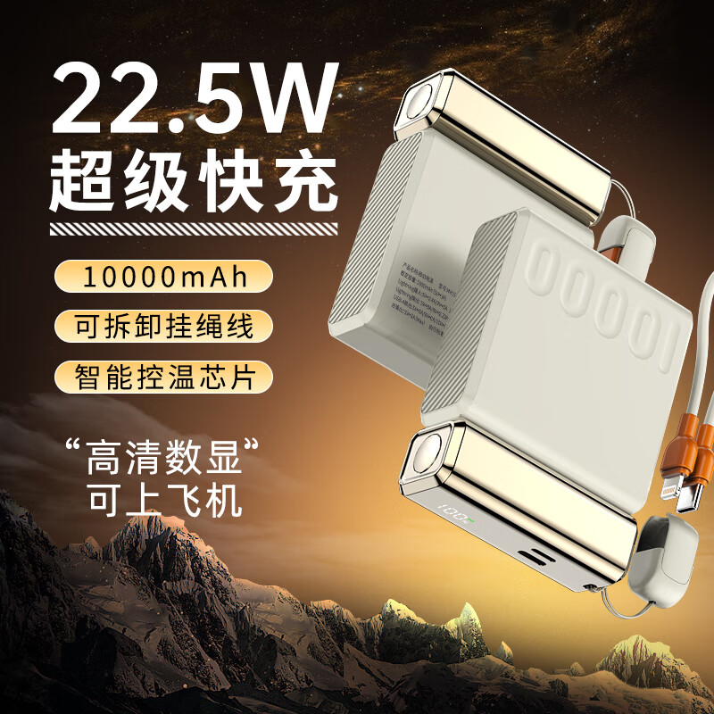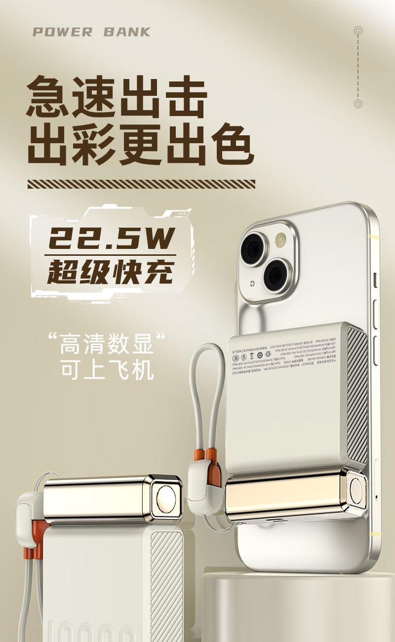 型号:MH107 容量:10000mAh(典型值) 颜色:米白色 材质:外壳ABS 线TPE 产品尺寸:83*62*23.8mm 包装尺寸:168*103*36mm 产品重量:183g