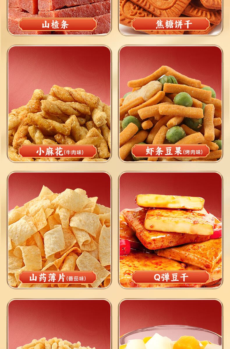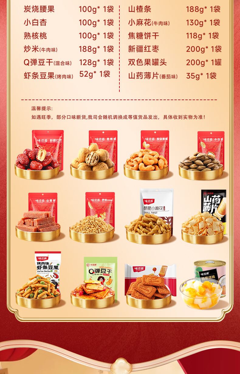 味滋源 Q弹豆干128g混合味 味滋源 山药薄片(农家番茄味) 35g 味滋源 虾条豆果 52g(烤肉味) 味滋源 小白杏 100g (红色款) 味滋源 熟核桃 100g (红色款) 味滋源 炭烧腰果 100g (红色款) 味滋源 山楂条 188g (红色款) 味滋源 炒米牛肉味 188g (红色款) 味滋源 新疆红枣 200g 味滋源 国潮坚果礼盒-手提绳款外盒 味滋源 小麻花130g(随机) 味滋源 焦糖饼干 118g 味滋源 双色果罐头200g