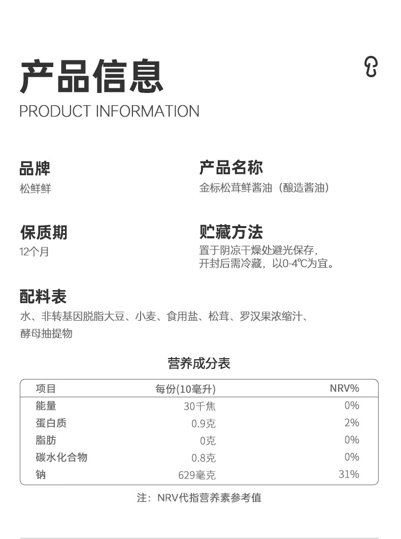 1、松茸调味料90g*2袋2、金 标松茸鲜酱油490ml*1瓶3、松茸油醋汁280g*1 瓶4、卤料汁55g*1 袋5、松鲜鲜零添加米醋105ml*1瓶 6、白色logo纸带*1