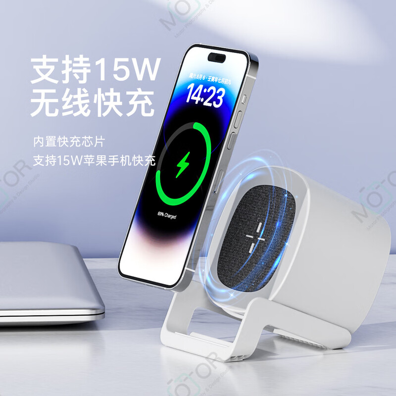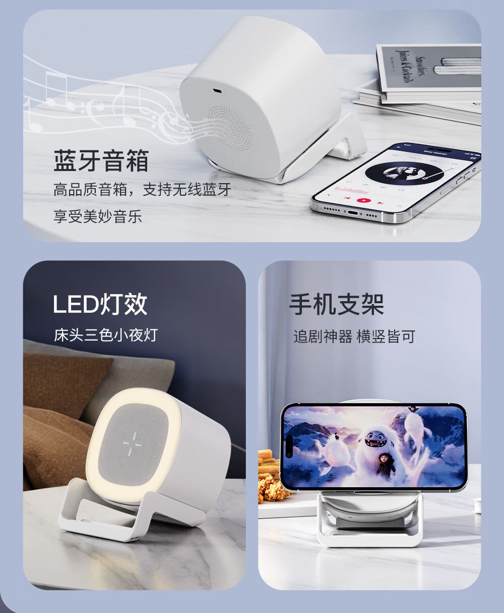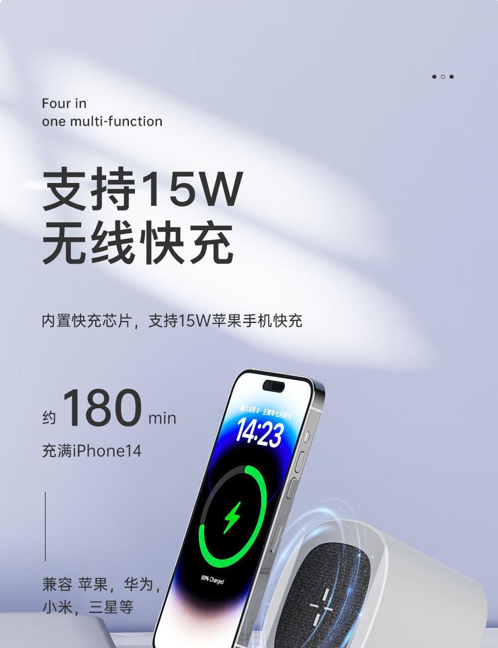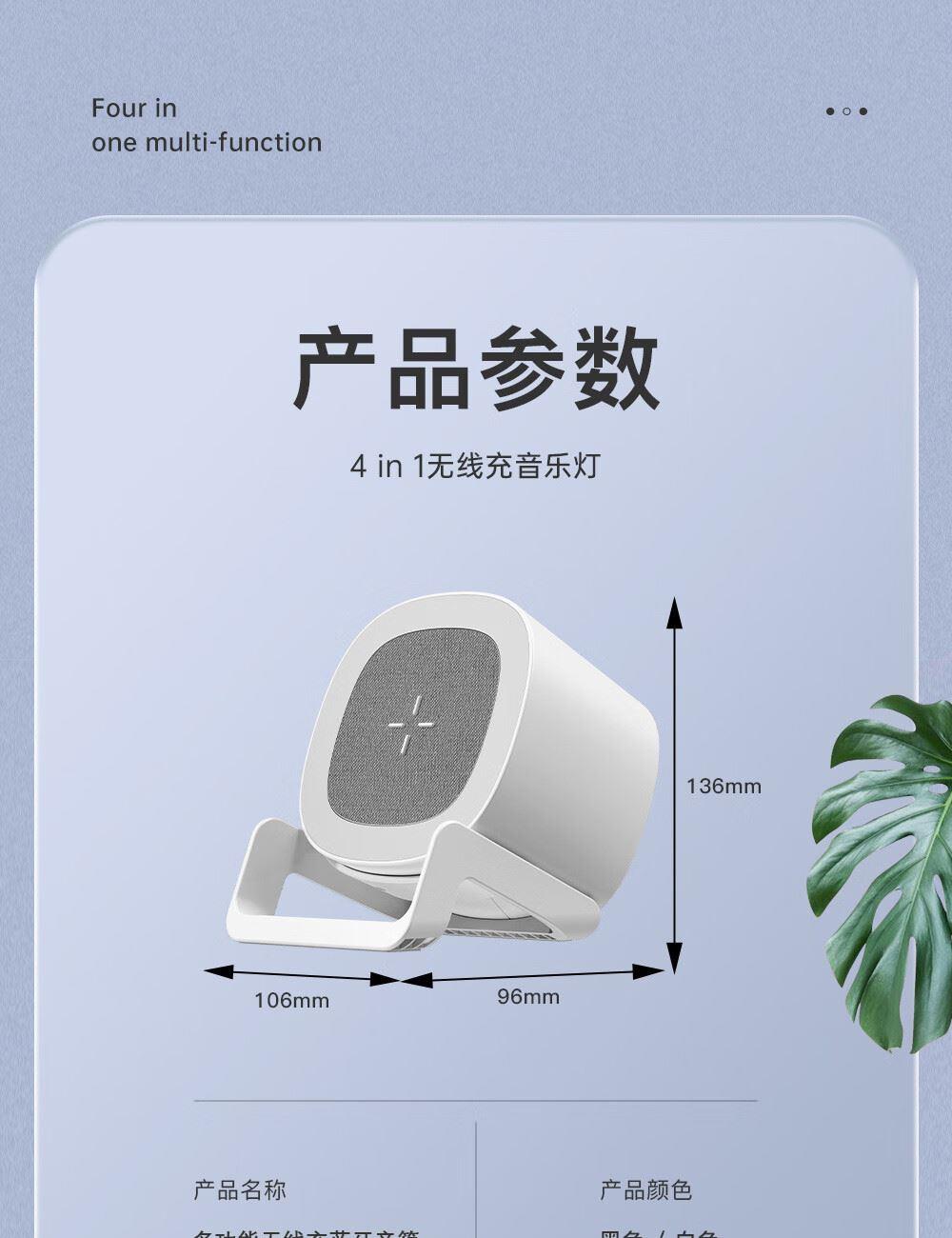 型号:T42 常规颜色: 白 材质工艺:ABS 供电方式:TYPE-C 蓝牙版本:5.3 无线充:15W 蓝牙距离: ≤10M 频率响应: 100Hz-20KHz 产品尺寸:136*106*98mm 产品净重:283g