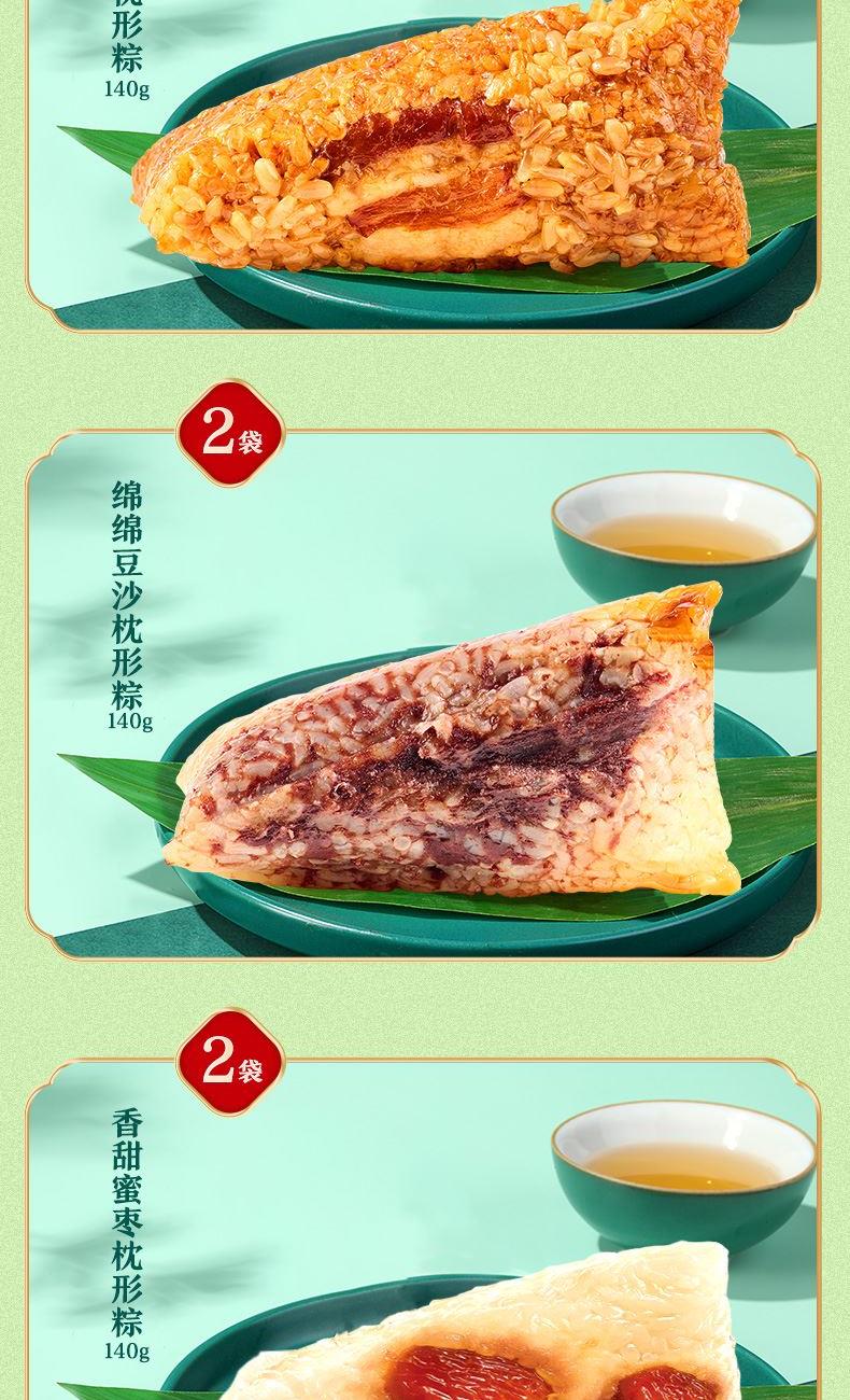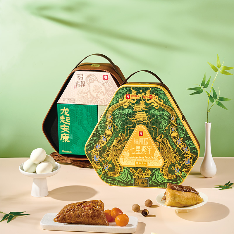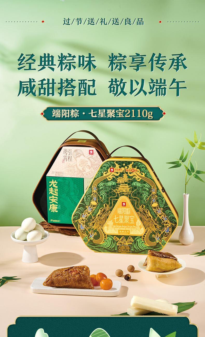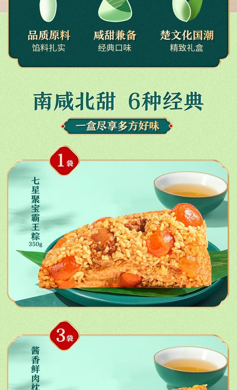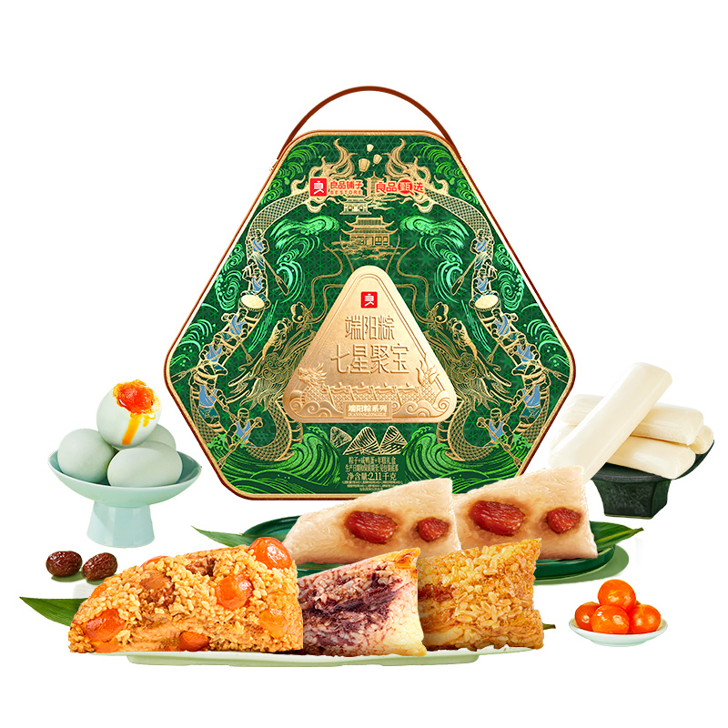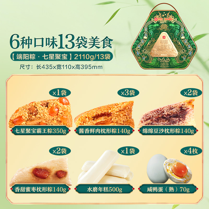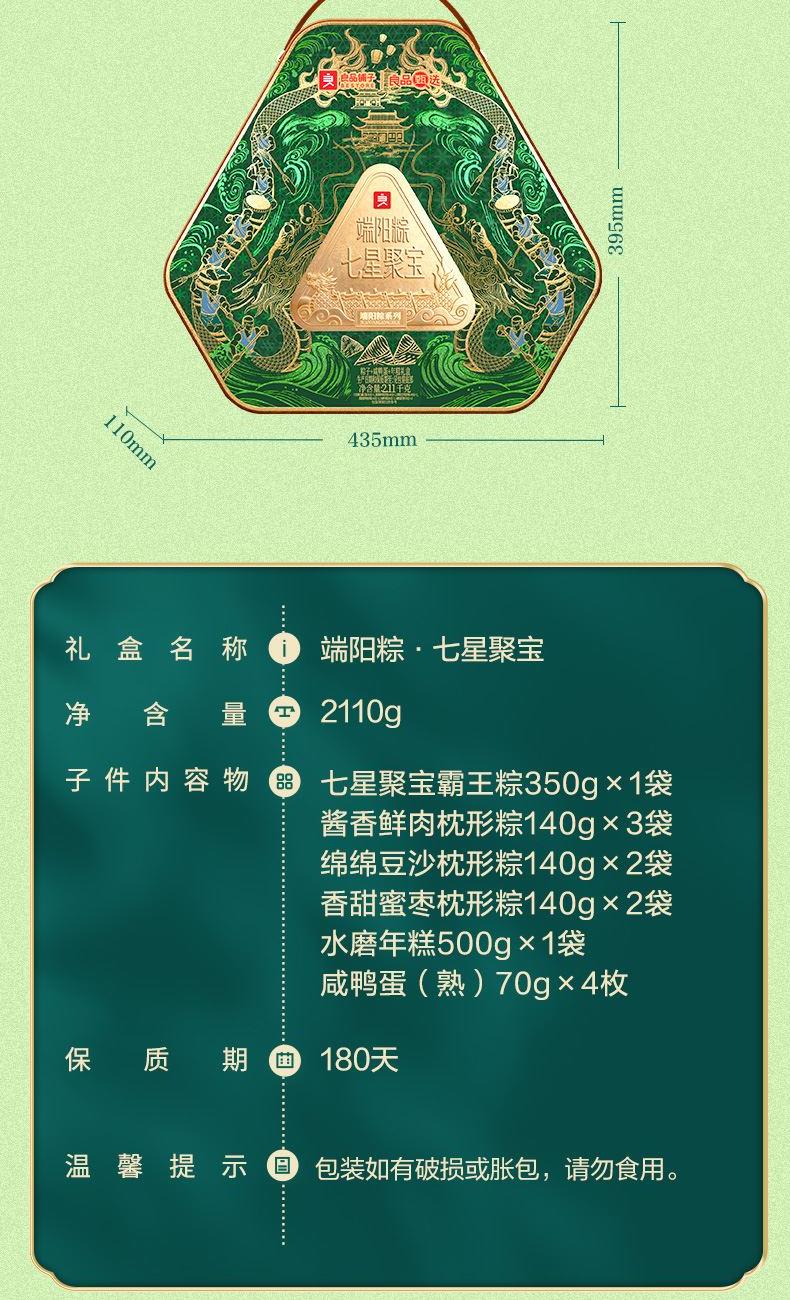 七星聚宝霸王粽350g*1 酱香鲜肉枕形粽140g*3 绵绵豆沙枕形粽140g*2 香甜蜜枣枕形粽140g*2 水磨年糕500g*1 咸鸭蛋(熟)70g*4