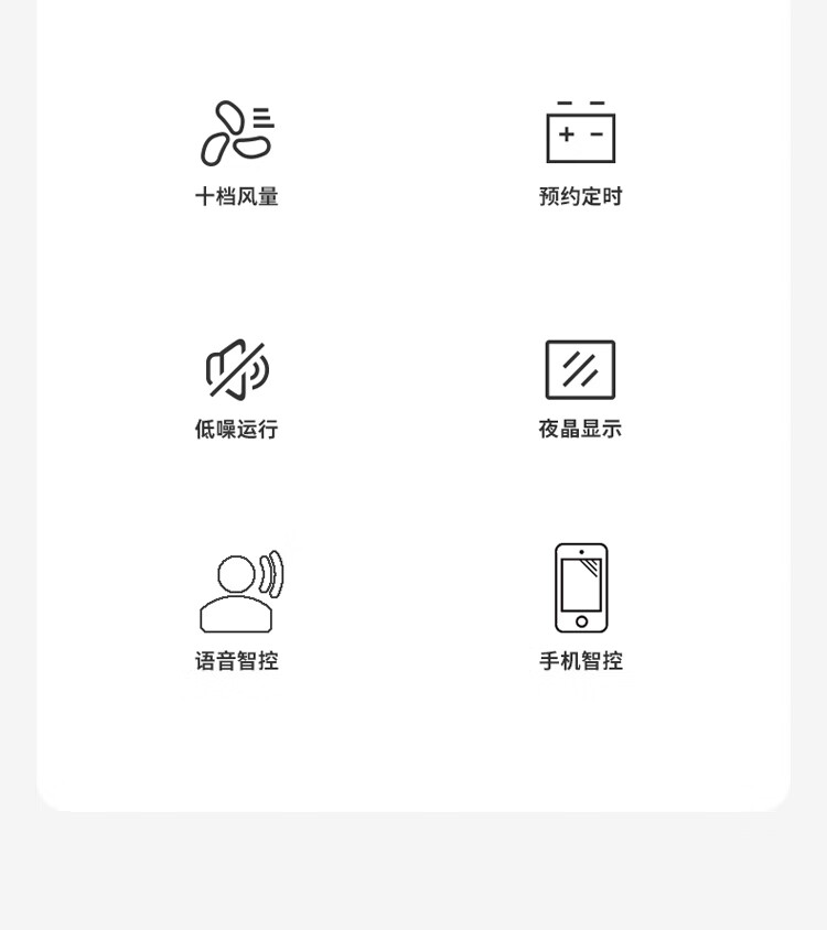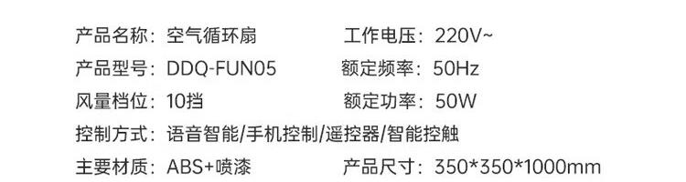 额定电压:220V~ 风罩尺寸:直径约27mm 额定频率:50Hz 主要材质:ABS+喷漆 额定功率:50W 风速调节:10档 控制方式:语音智控/手机智控/遥控器/智能触控 产品尺寸:350*350*1000mm 产品净重:约4.7kg 产品条码:6952020905831 装 箱 数:1台/箱-邮购盒