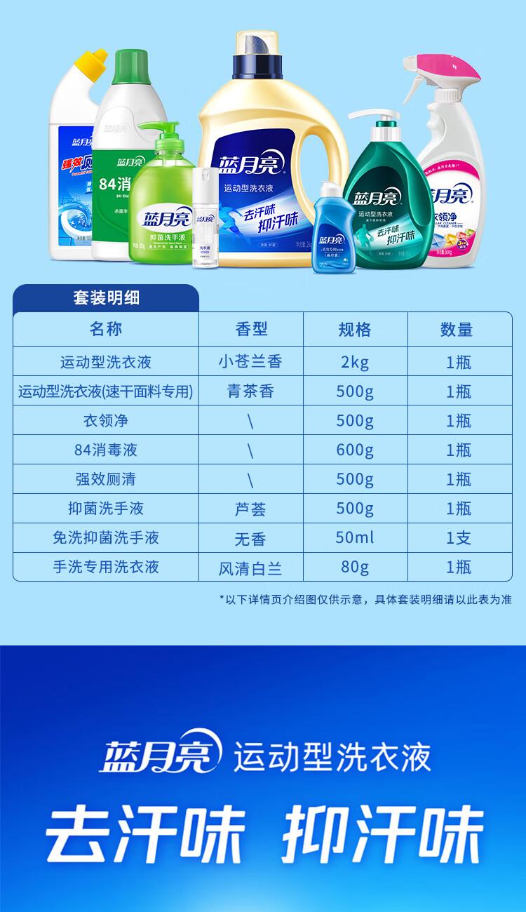 运动型洗衣液-小苍兰香2kg*1 运动型(速干面料)专用洗衣液泵装500g*1 喷雾型衣领净500g*1 84消毒液600g*1 强效厕清500g*1 芦荟抑 菌洗手液500g*1 免洗抑 菌洗手液-无香50ml*1 手洗神器旅行装80g*1