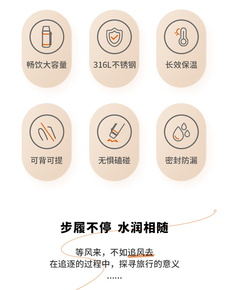 1.2L大容量,畅饮大容量,随心走,自由行。 2.48小时长效保温;快乐出行 3.316L不锈钢健康材质 4. 一键按压,顺畅出水 5.家用、户外旅行,车用 多场景使用均可。 6、规 格:9台 /件