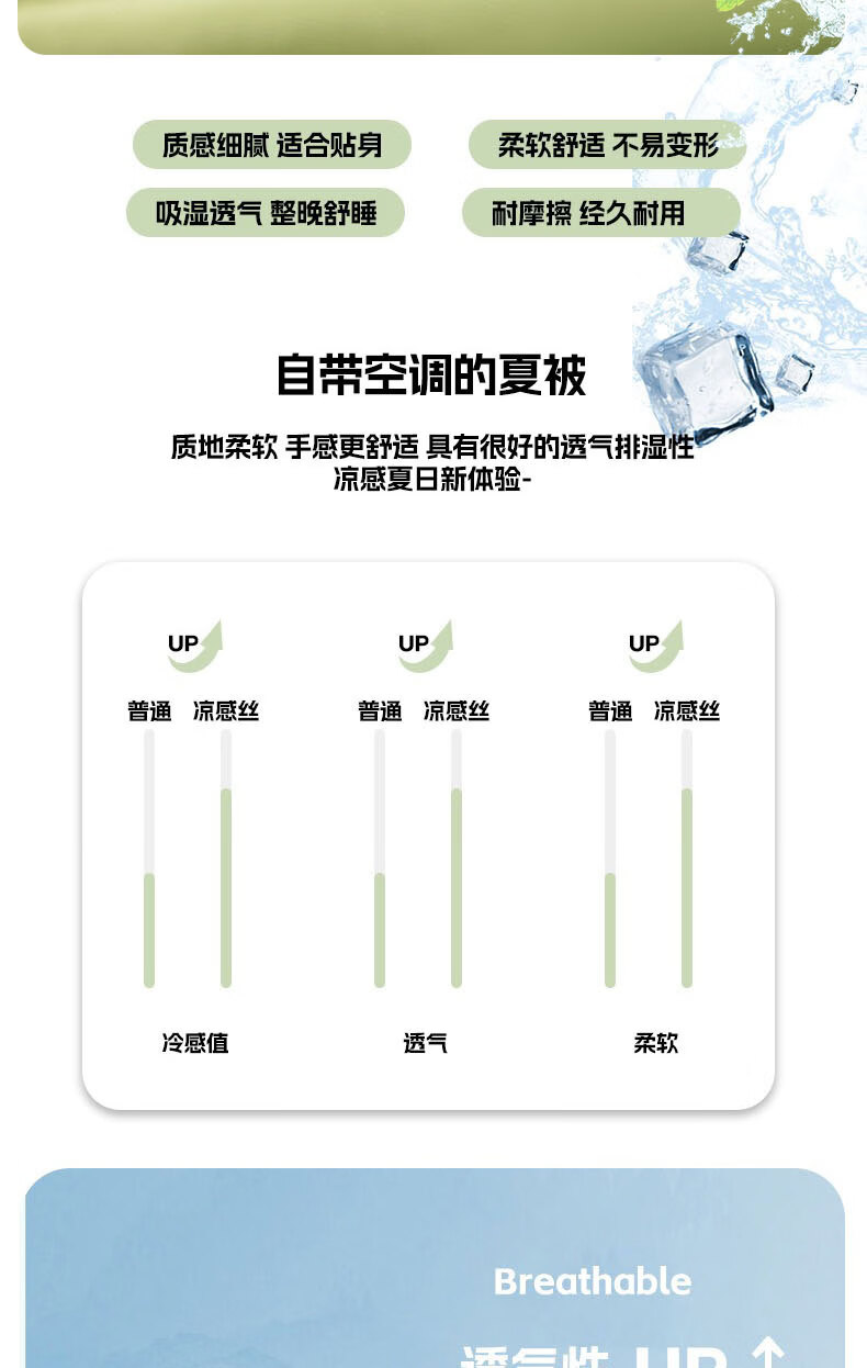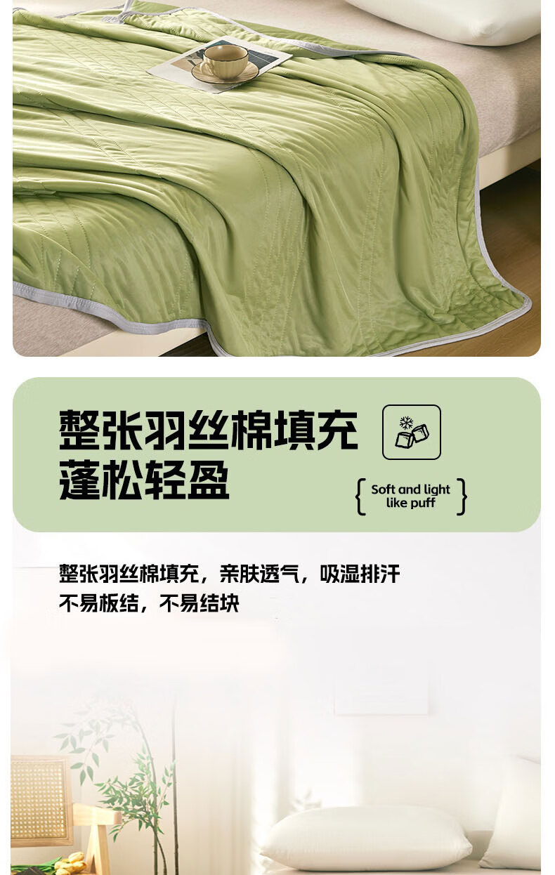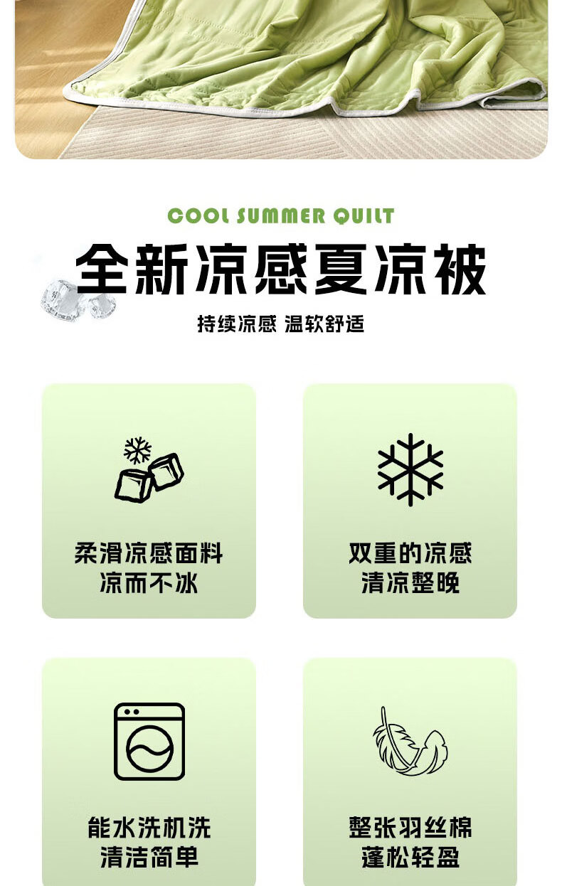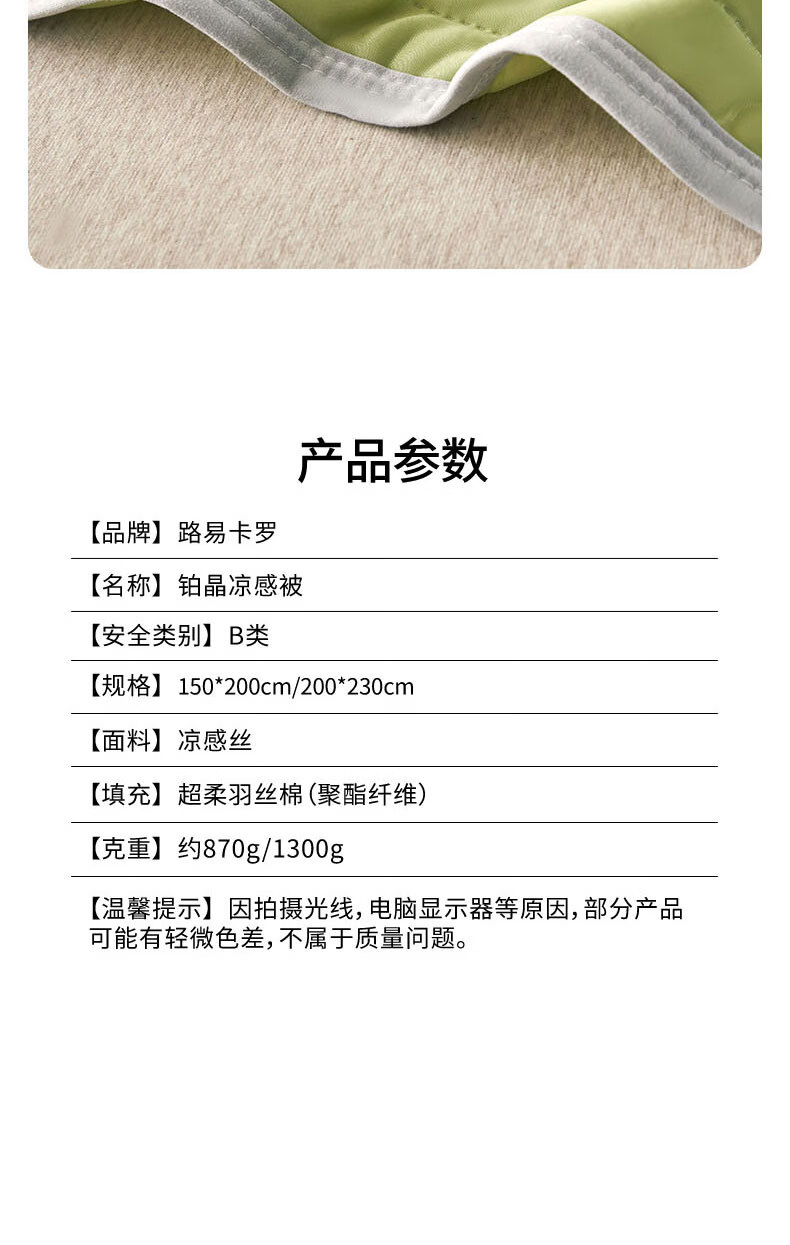 货 号:LK-8533 面 料:凉感丝 填 充:超柔羽丝棉(聚酯纤维) 规 格:200*230cm 克 重:1300g