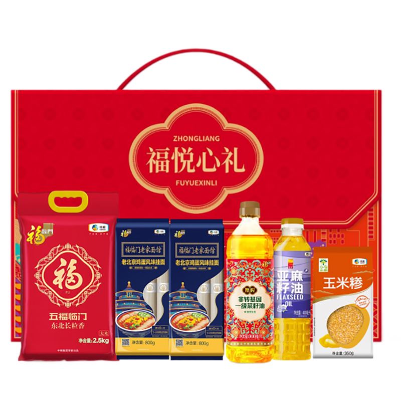 净含量:4450g+1300ml 内 配: 福临门五福临门长粒香米2.5kg 福临门凰榨非转基因一级菜籽油900ml 中粮亚麻籽油400ml 福临门老家面馆挂面800g*2 中粮金盈小米350g