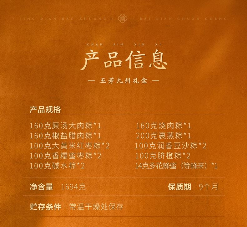 五芳斋五芳九州礼盒1694g(14只粽+14g蜂蜜)
