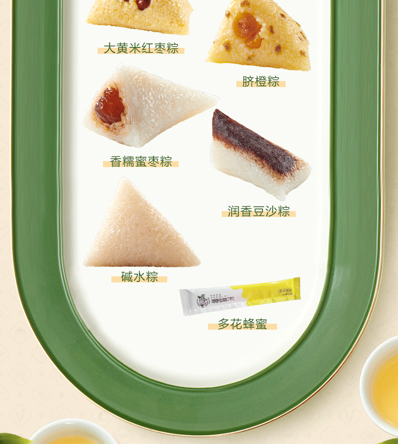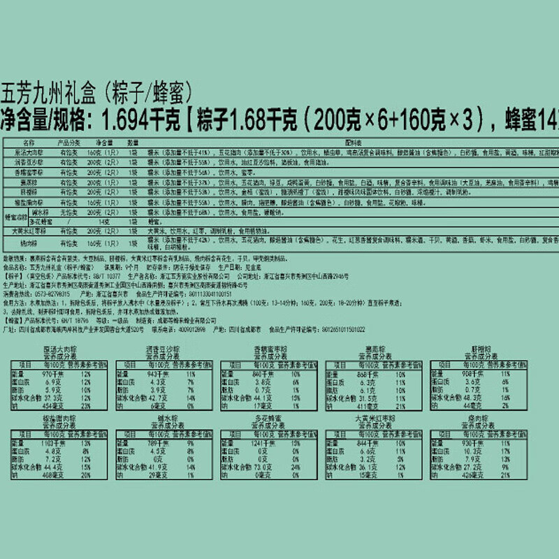 160克原汤大肉粽*1袋 100克*2润香豆沙粽*1袋 100克*2香糯蜜枣粽*1袋 200克裹蒸粽*1袋 100克*2脐橙粽*1袋 160克椒盐腊肉粽*1袋 100克*2碱水粽*1袋 160克烧肉粽*1袋 100克*2大黄米红枣粽*1袋 多花蜂蜜(等蜂来)14克*1袋