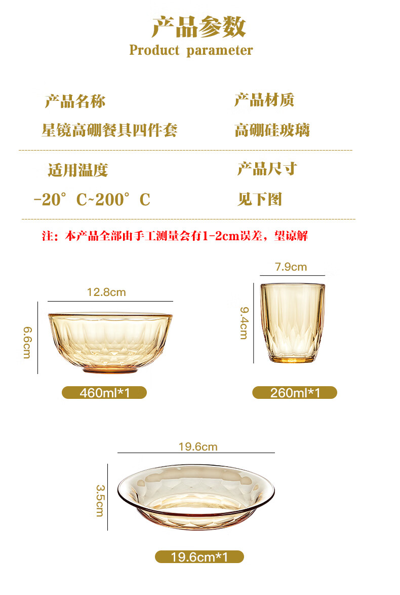 装 箱 规格:12套 /箱适用温度:-20°C-200°C材 质:高硼硅玻璃产品参数:小碗460ml*1、 杯260ml*1、 盘196mm*1 彩盒尺寸:343*91*215mm 外箱尺寸:57.3*35.5*44.9cm