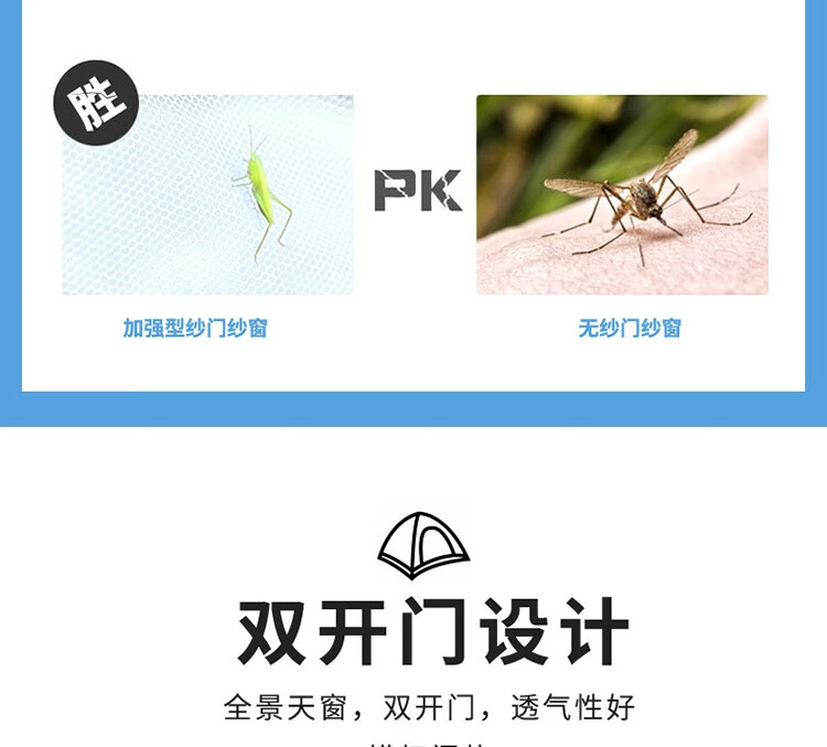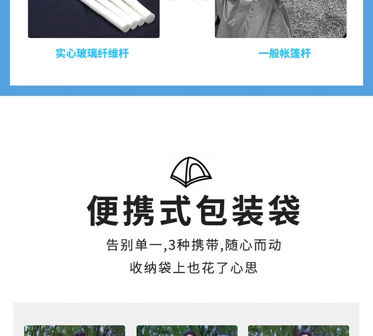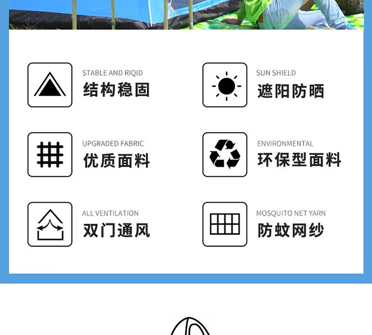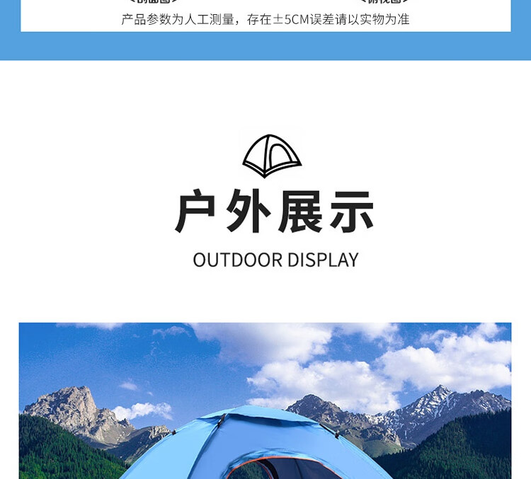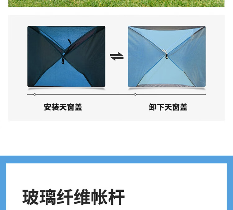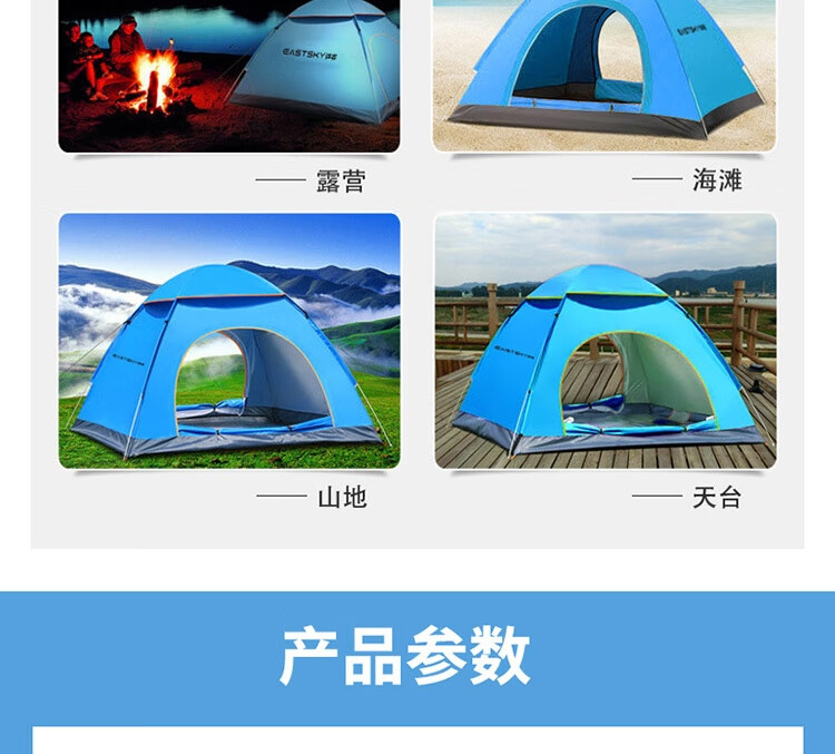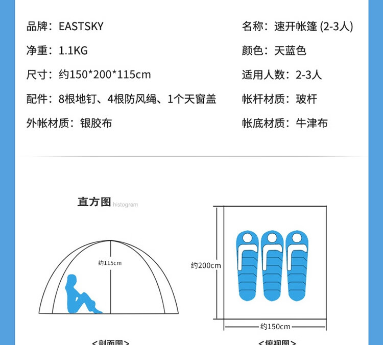 规格尺寸:150*200*125cm 外袋:53*53cm 配件:8根地钉(常规),4根防风绳,天窗盖1个 颜色:天蓝色 材质:面布:银胶布 底布:牛津布 支架:玻杆