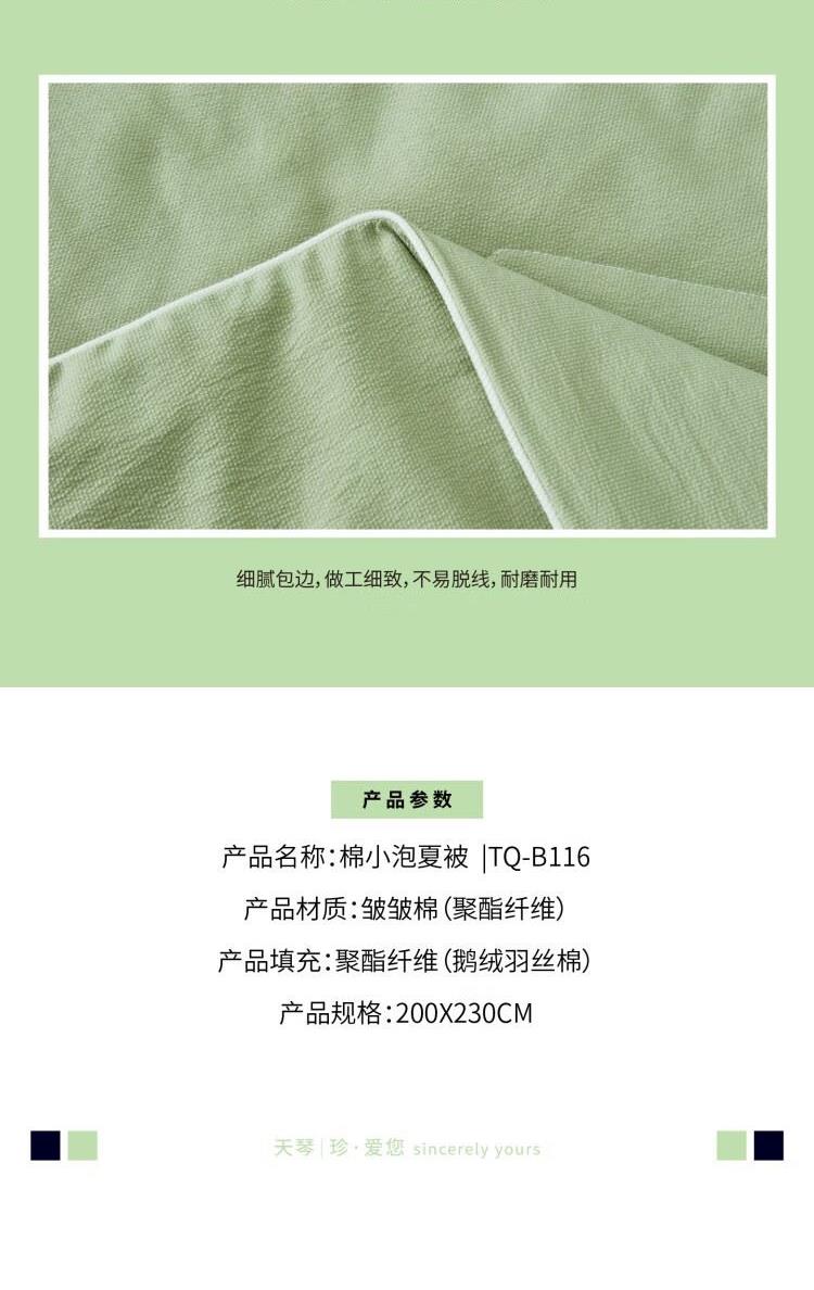 规格:200x230cm 材质:皱皱棉(聚酯纤维) 填充物:聚酯纤维(鹅绒羽丝棉) 填充物净重:500g
