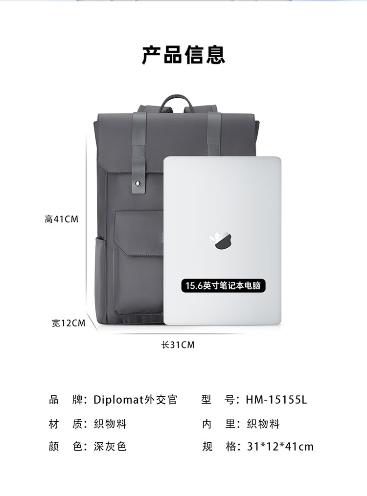 产品材质:织物料 产品颜色:深灰色 外观尺寸:310*120*410mm 产品容量:15L 产品条码:6958698326282 装 箱数量:10pc