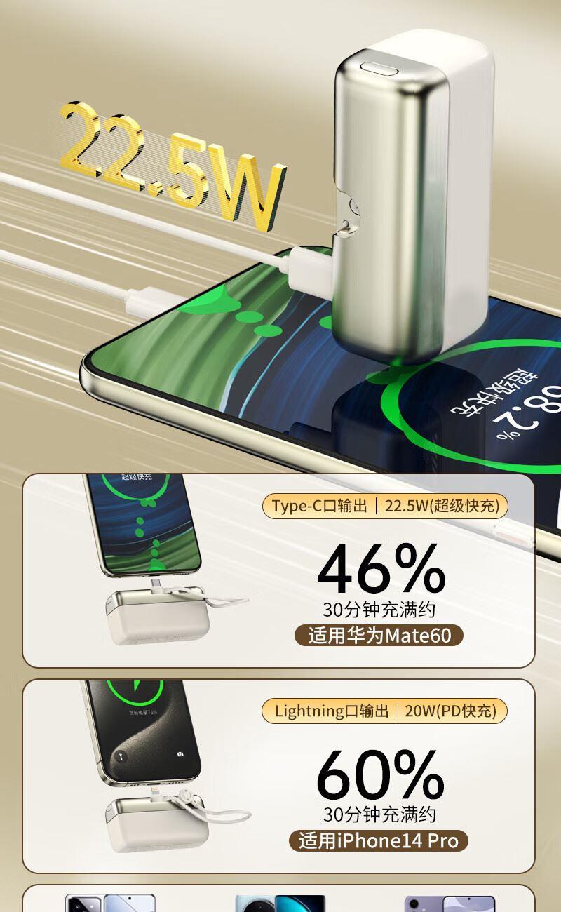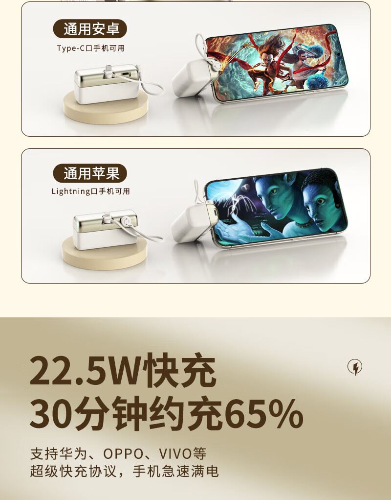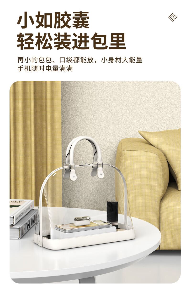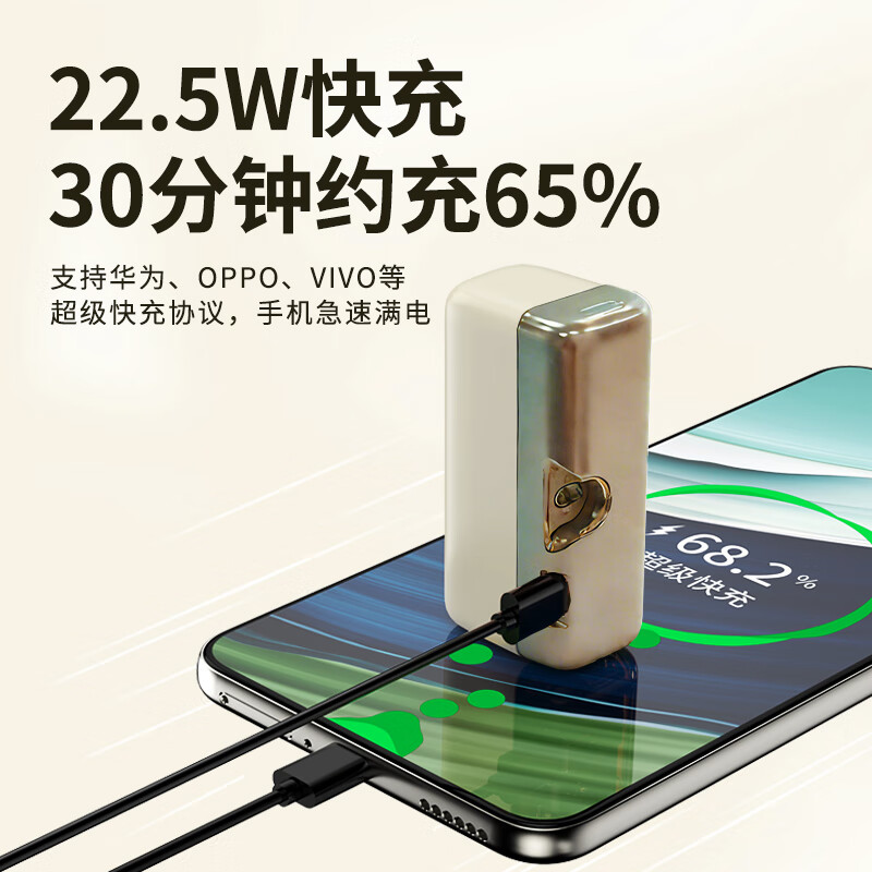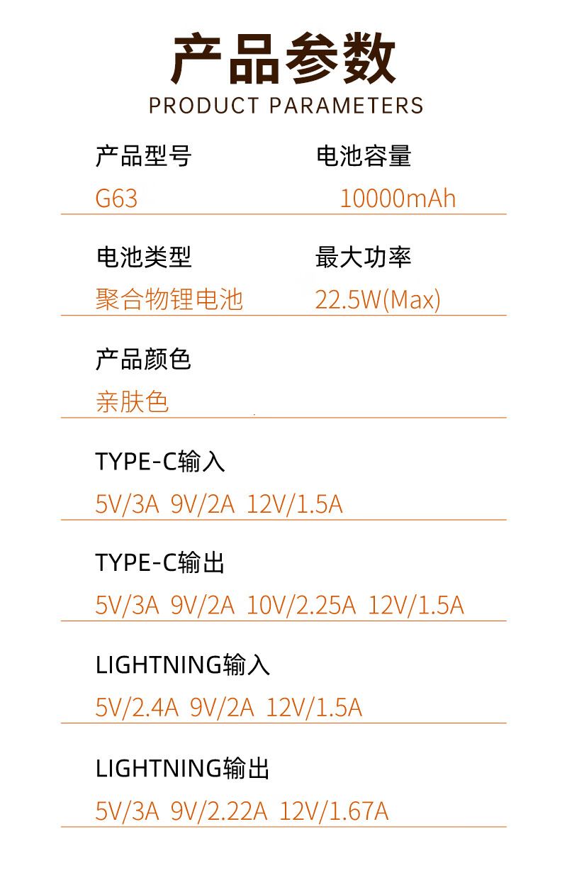 型号:G63 容量:10000mAh(典型值) 颜色:米白色 材质:外壳ABS 线TPE 产品尺寸:84*44.5*30.5mm 包装尺寸:168*103*36mm 产品重量:169g