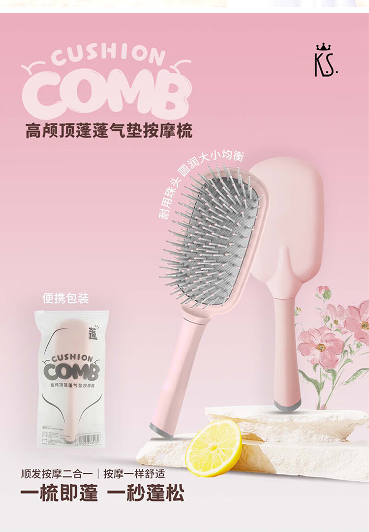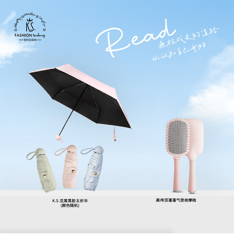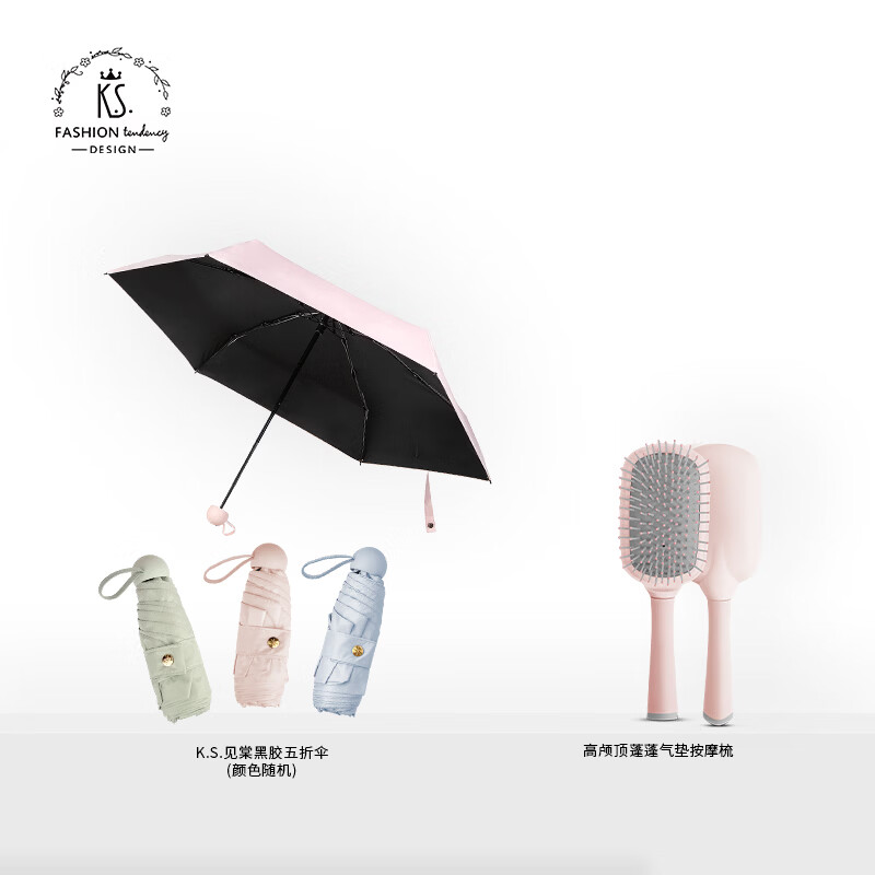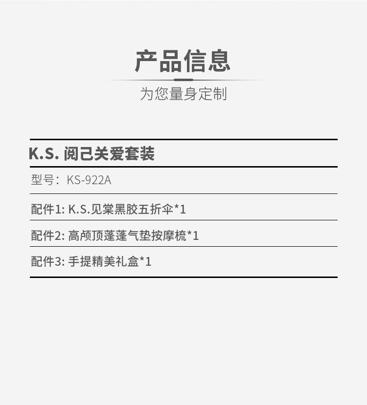 礼盒配置 1.高颅顶蓬蓬气垫按摩梳*1 2. K.S.见棠黑胶五折伞*1 3. 手提礼盒*1 彩盒尺寸: 145*75*235mm 装 箱数:48pcs