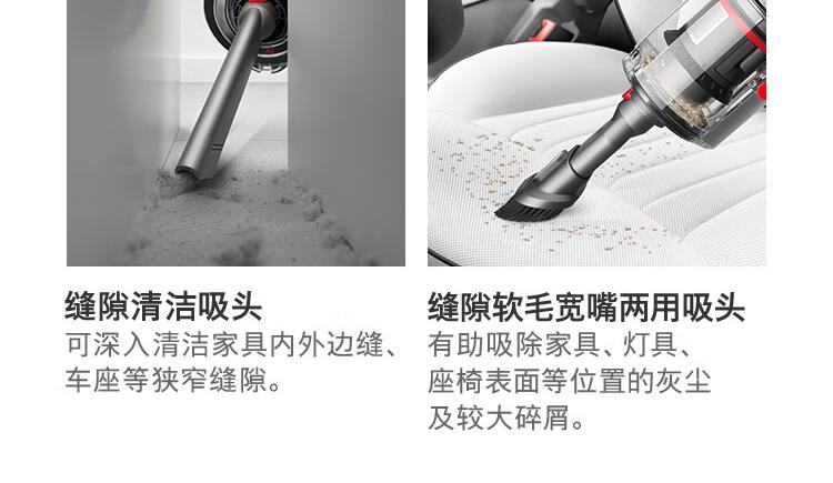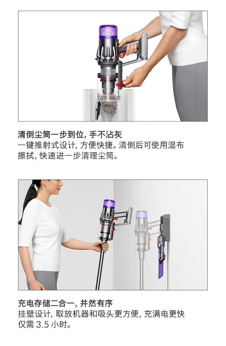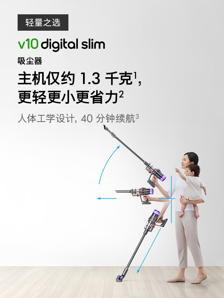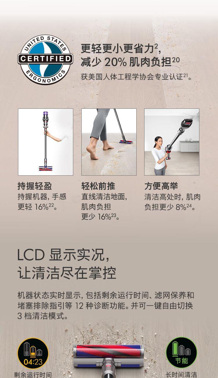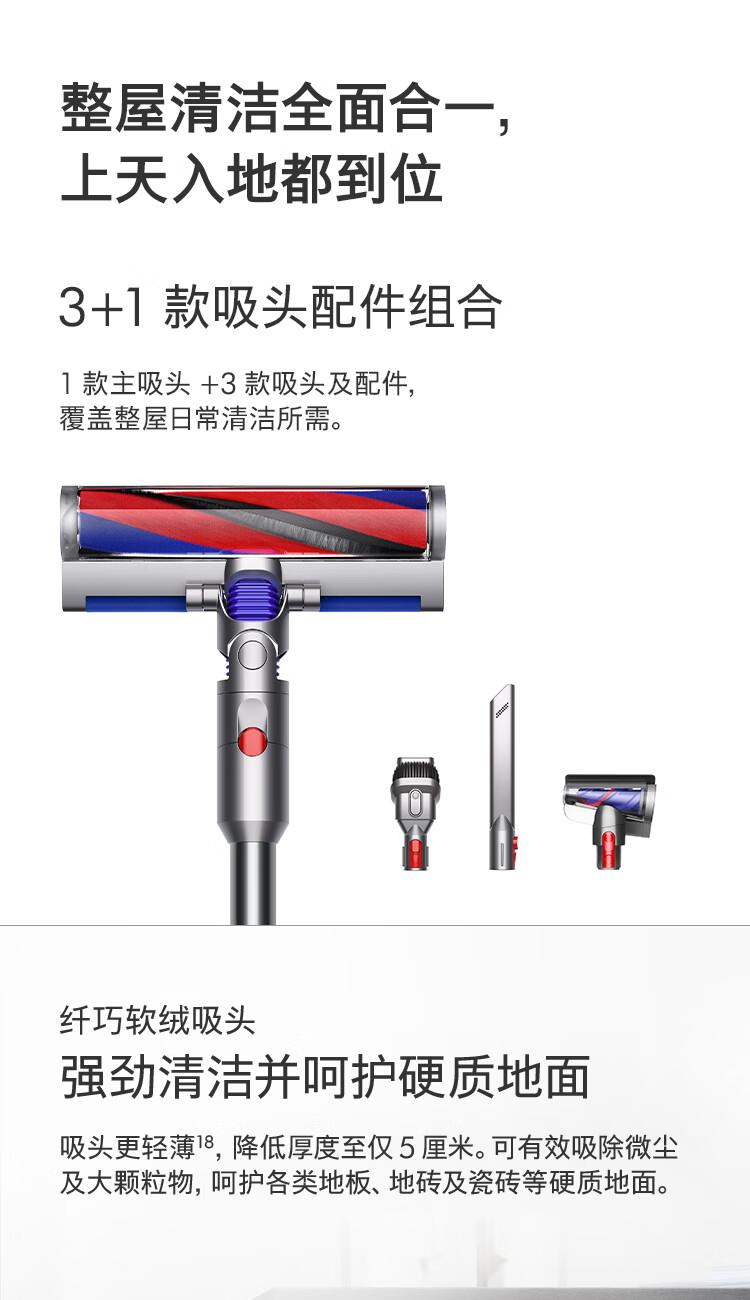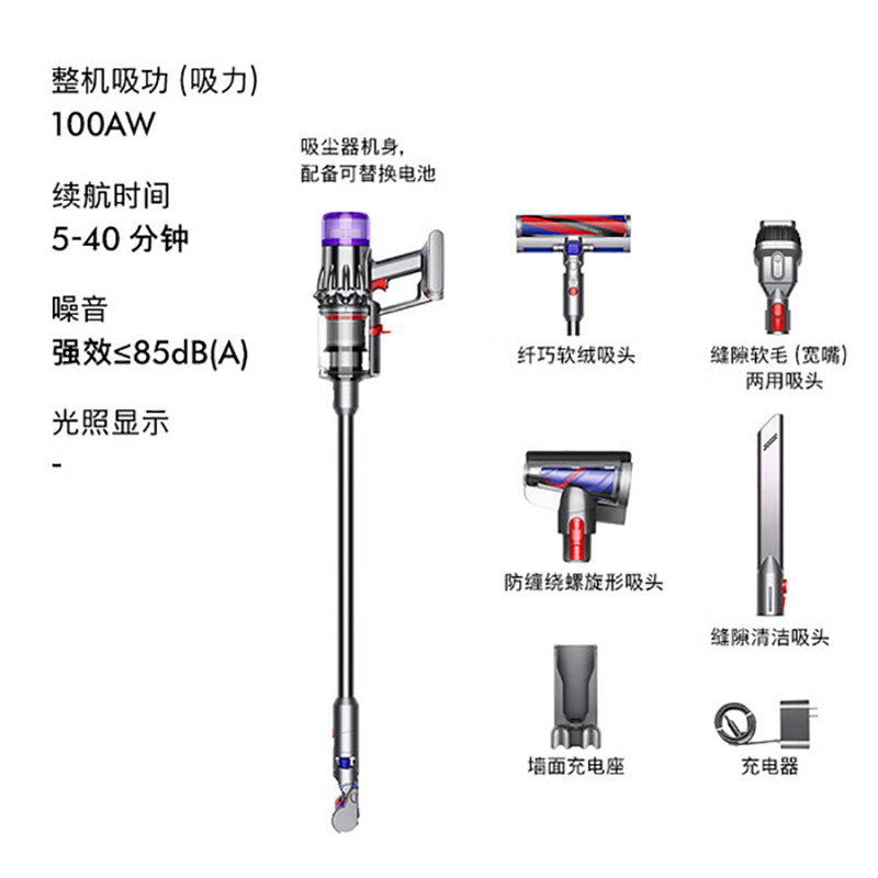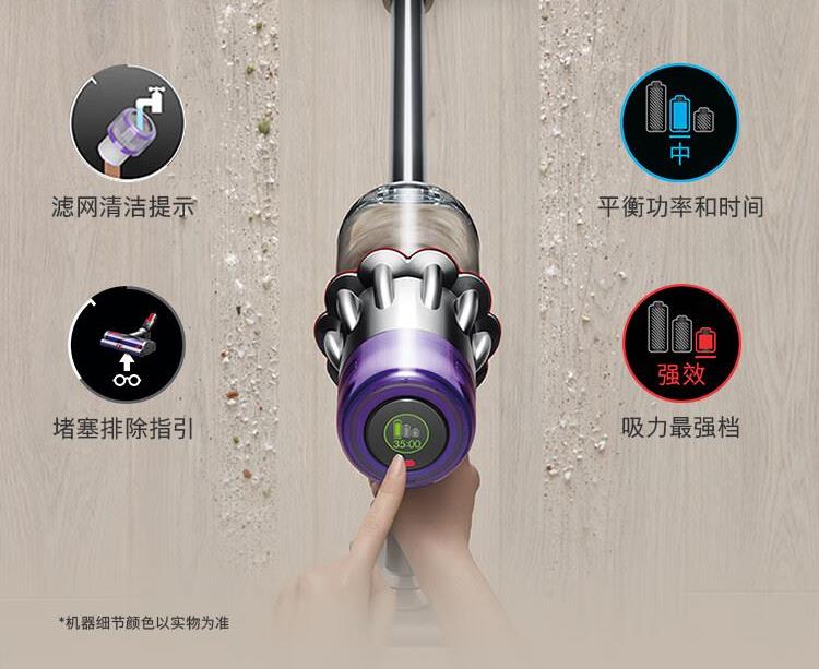 型号:HD15 商品毛重:3.0kg 功率:1600W-1999W 线长:1.8米 吹风机重量:560型号:VV10 Digital Slim 机身重量:1.3KG 集尘筒容量:0.3L 地面运行时间:40分钟 充满电时间:3.5小时 适合地板材质:木地板;地毯 吸头及配件数量:含1地板吸头及3个配件吸头克