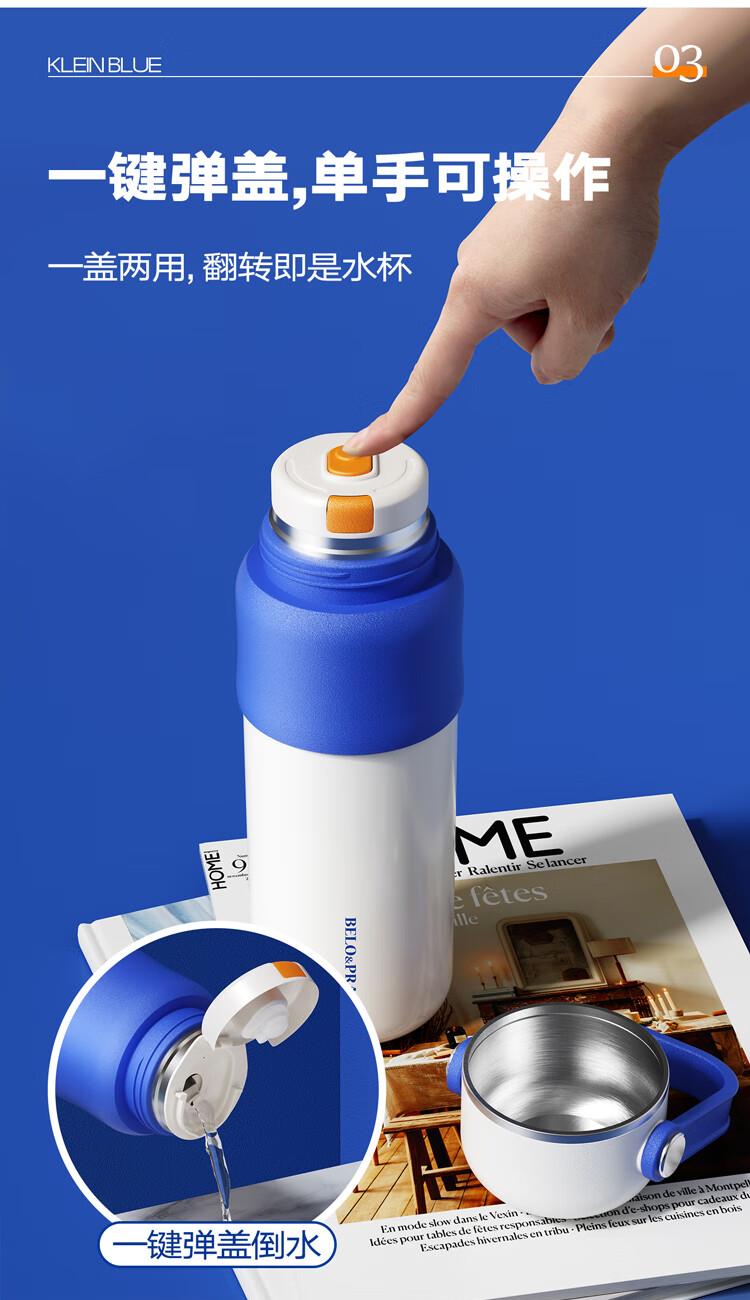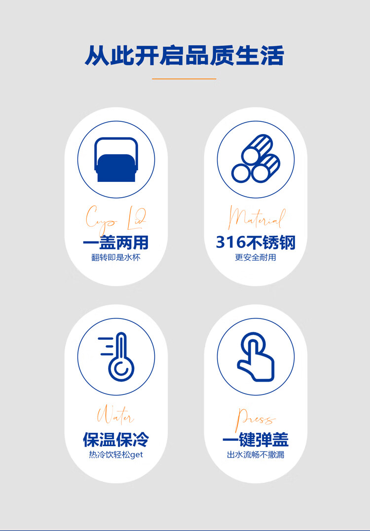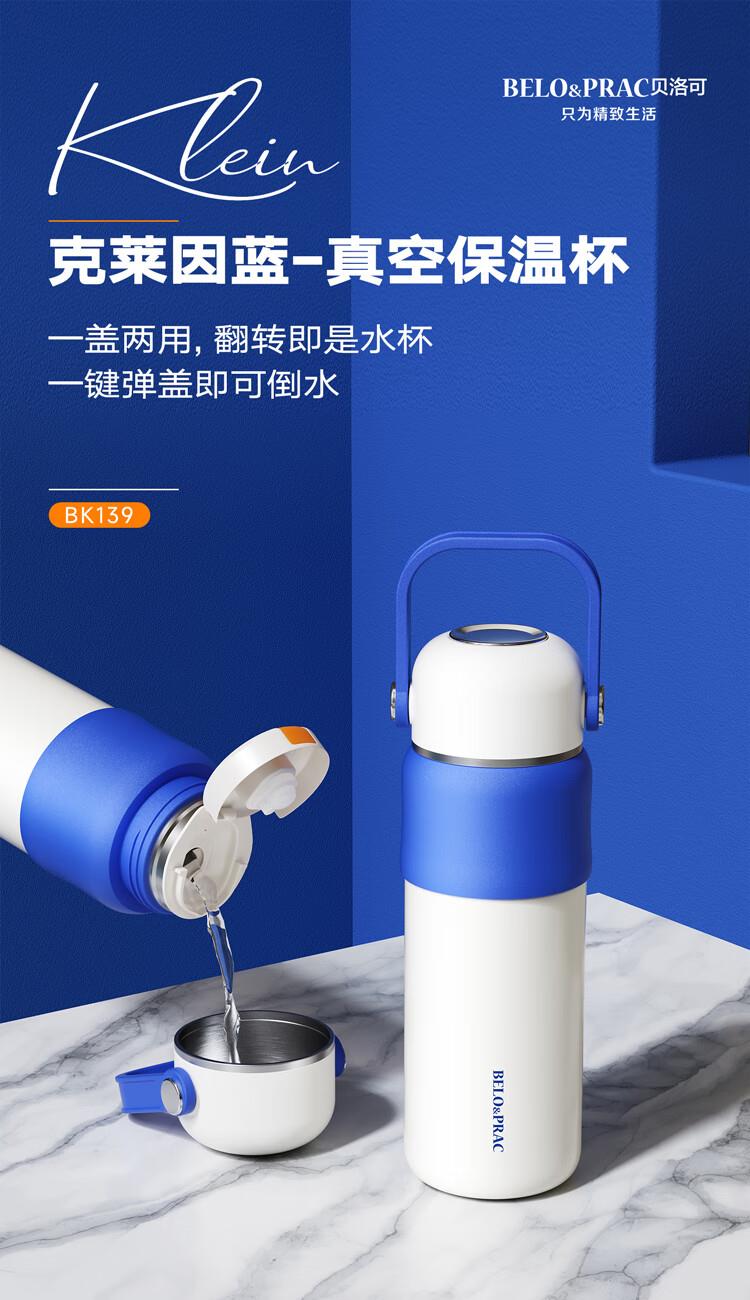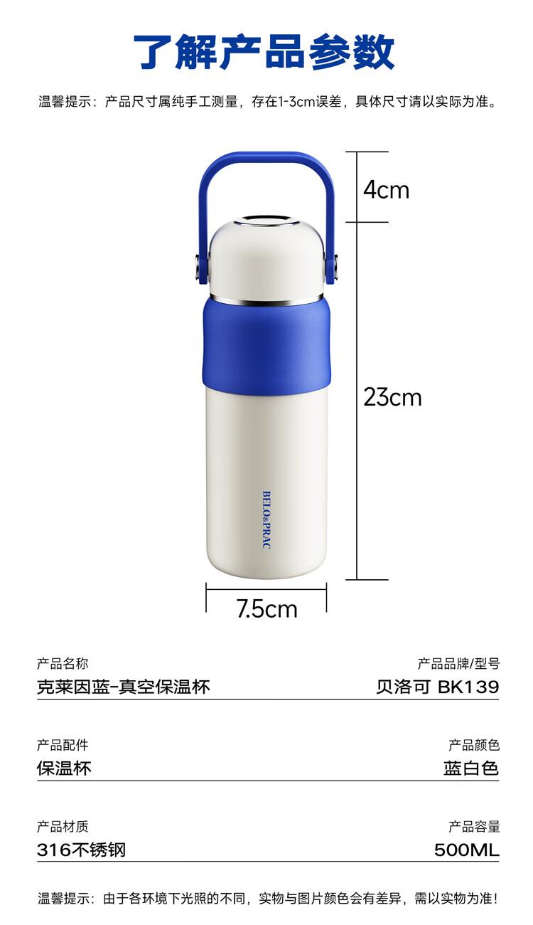 品 牌: 贝洛可 产品型号:BK139 产品容量:500ml 产品材质:316不锈钢 彩盒尺寸:9.6*8.7*23.5cm 外箱尺寸:60*55*25cm 装 箱数:36套 /箱 执行标准:GB4806.9-2016