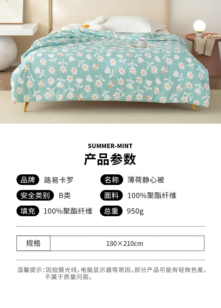 货 号:LK8510 规 格:180×210cm 面 料:100 %聚酯纤维 填 充:100 %聚酯纤维 总 重:950g