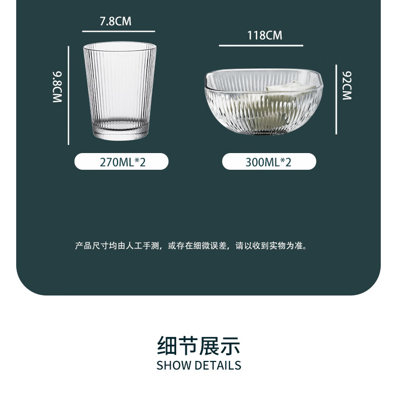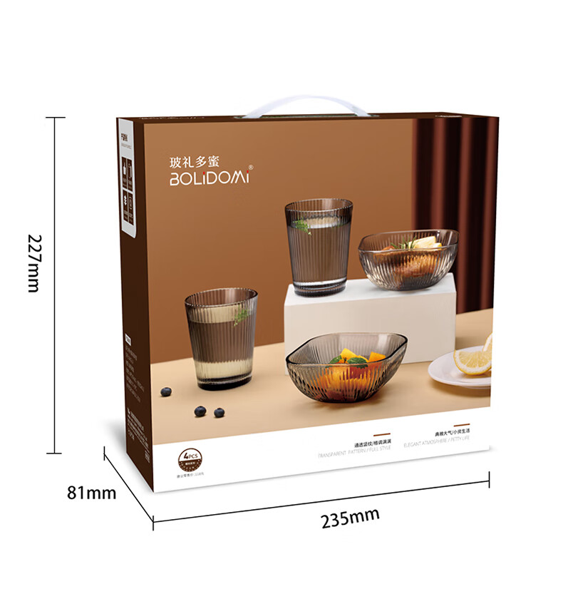 【规格】:16套 /箱 【组合】:小碗330ml*2、杯270ml*2 【材质】:钠钙玻璃0~60℃ 【彩盒尺寸】:235*81*227mm 【外箱尺寸】:48.6*34.2*47CM 【毛重】:17.3 KG