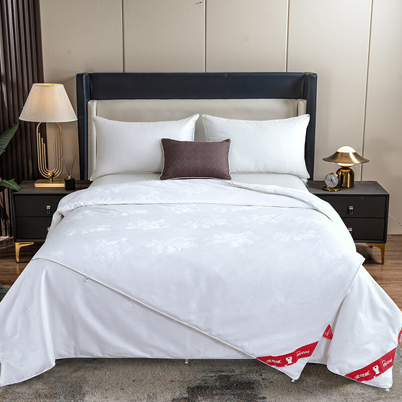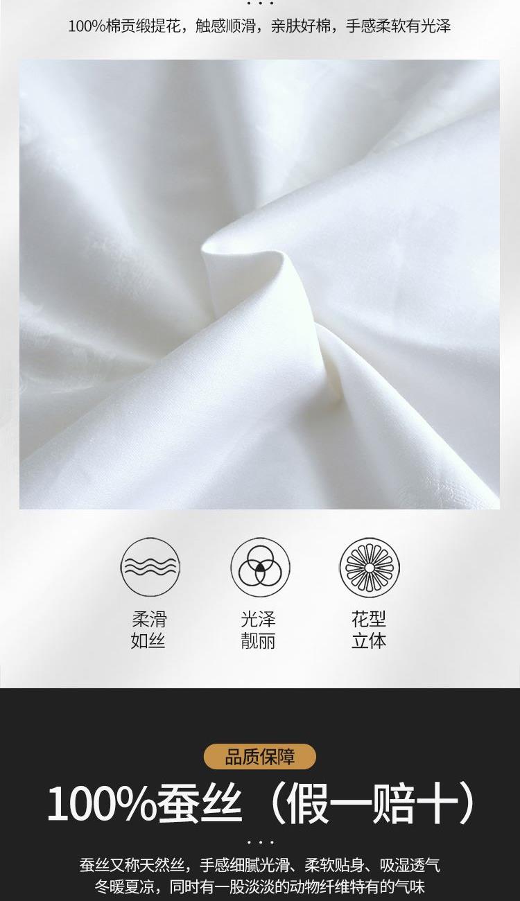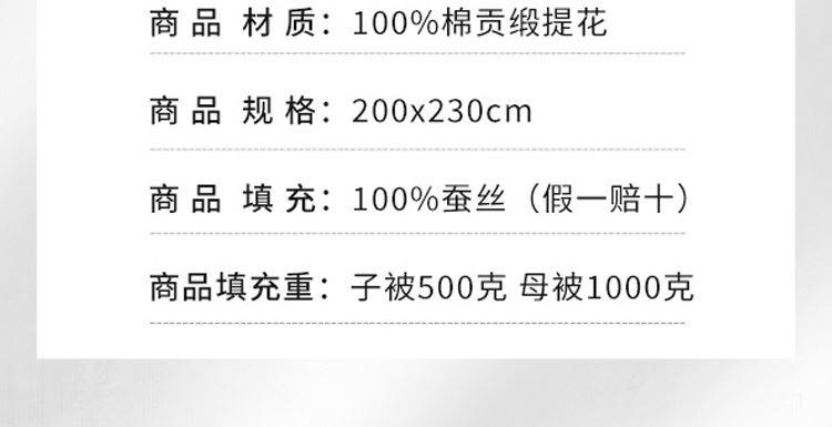 货 号:BJRB302 材 质:100 %棉贡缎提花 规 格:200x230cm 填 充:100 %蚕丝(假一赔十) 填充重:子被500克 母被1000克 包 装:北极绒精品软包/礼盒 装 箱 数:10套 /箱