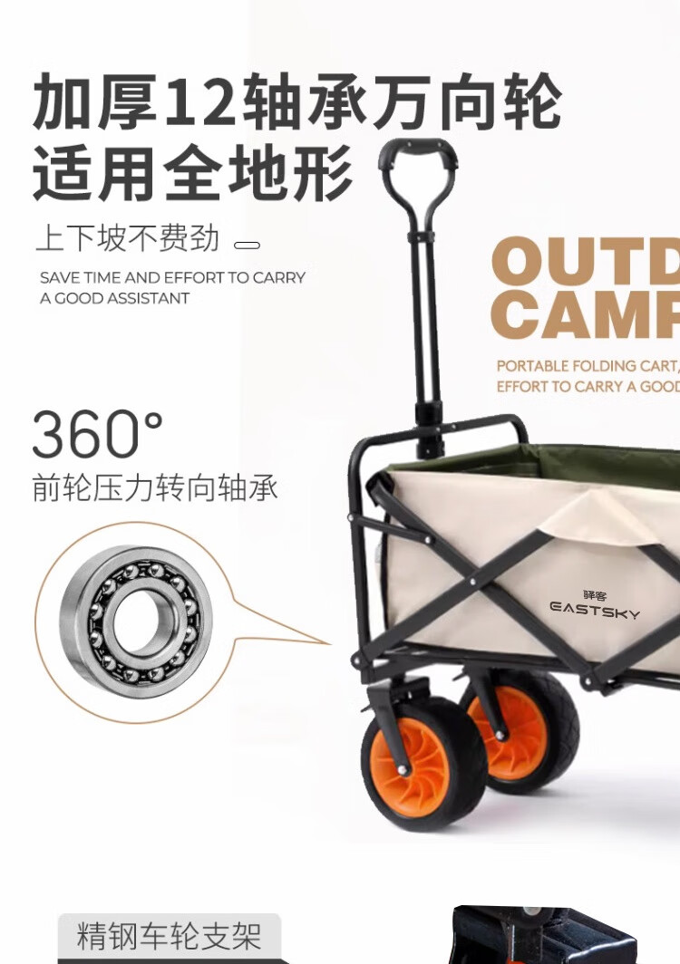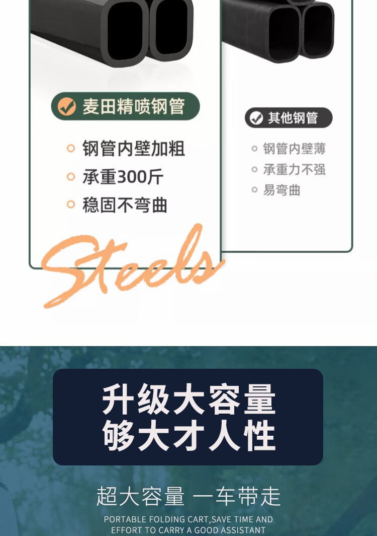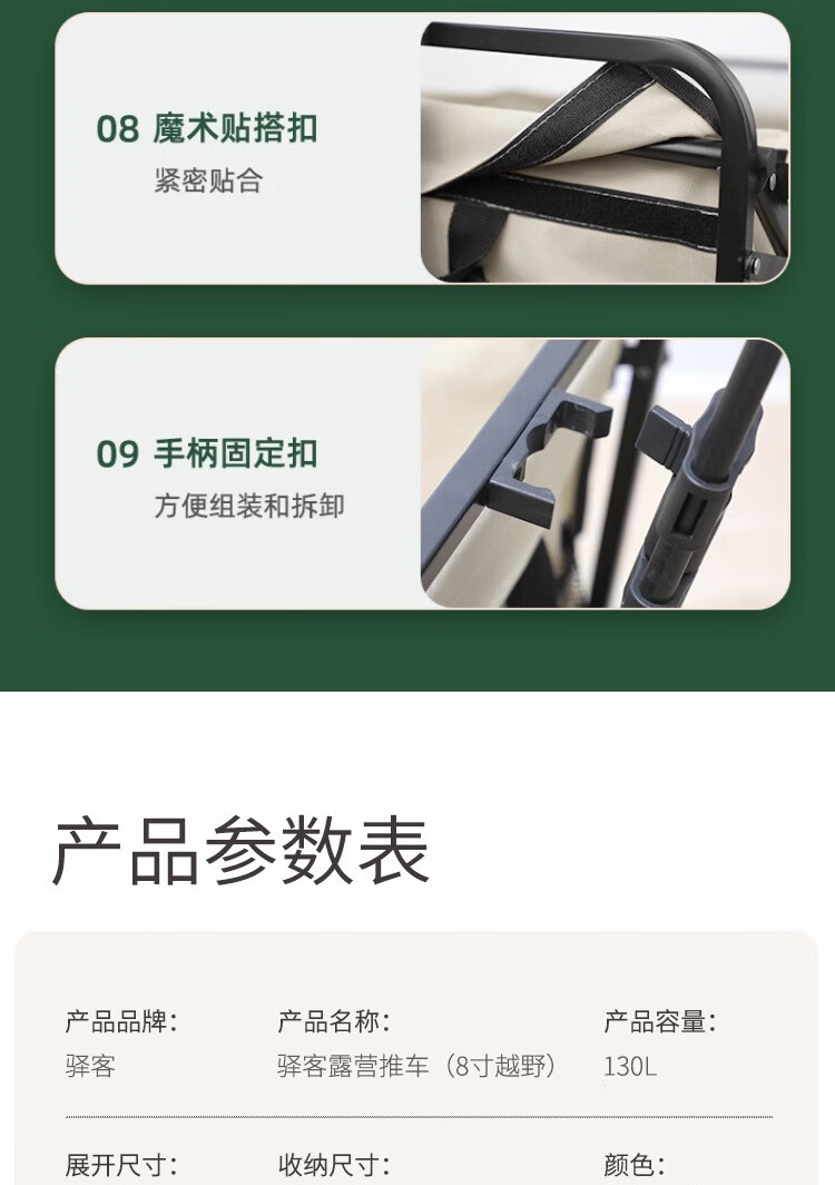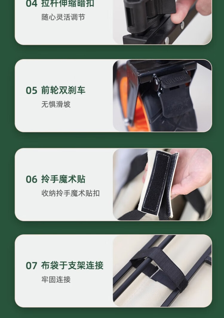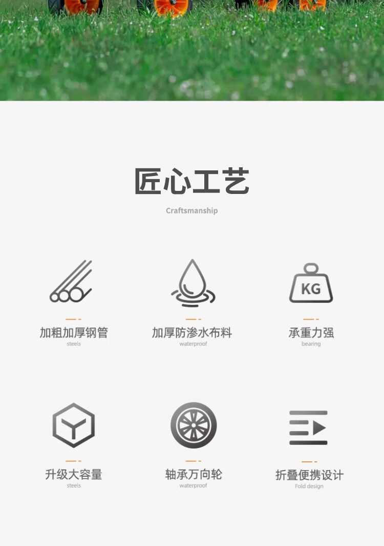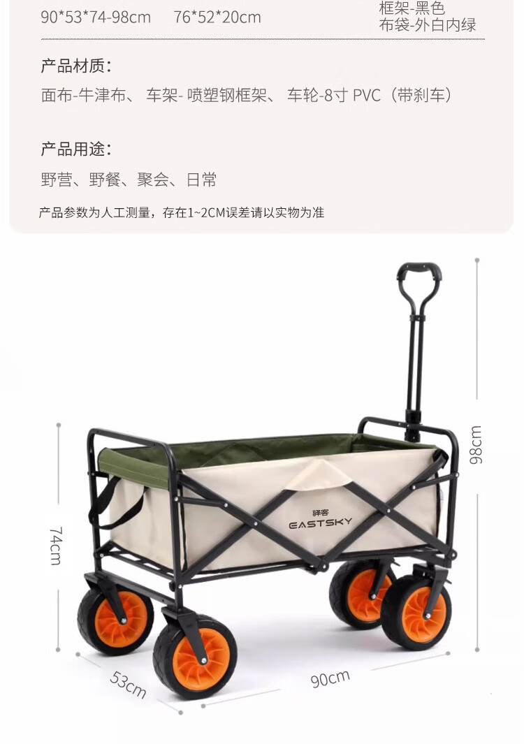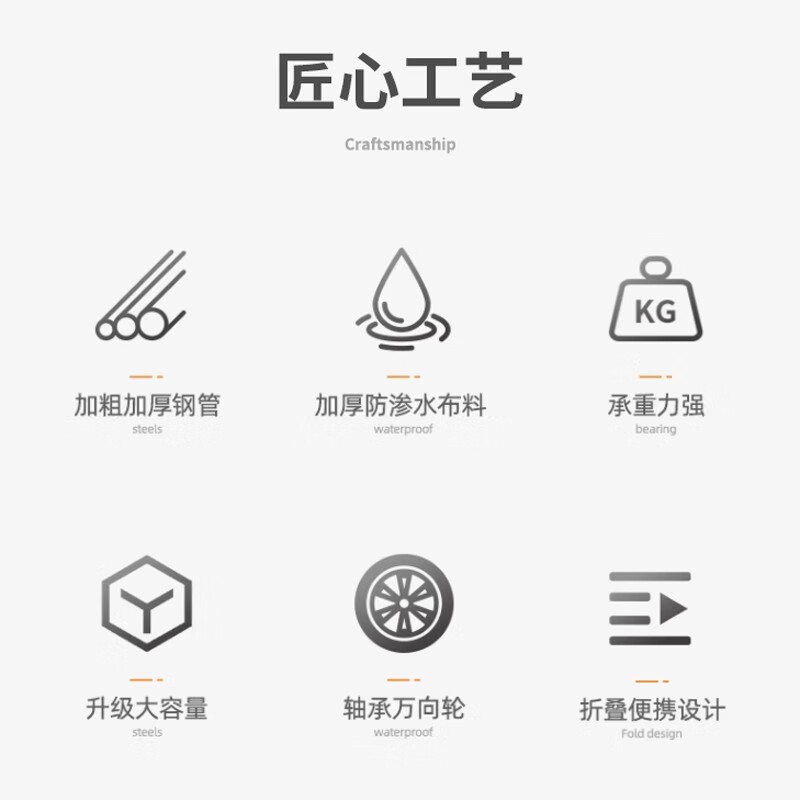 颜色:框架-黑色,布袋-外白内绿 材质:面布-牛津布 车架- 喷塑钢框架 车轮-8寸 PVC(带刹车) 规格尺寸:90*53*74—98cm(展开尺寸) 76*52*20cm(折叠尺寸) 容量:130L