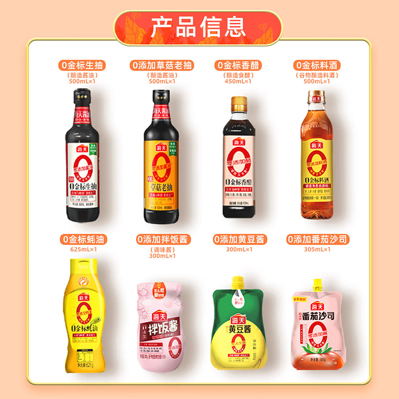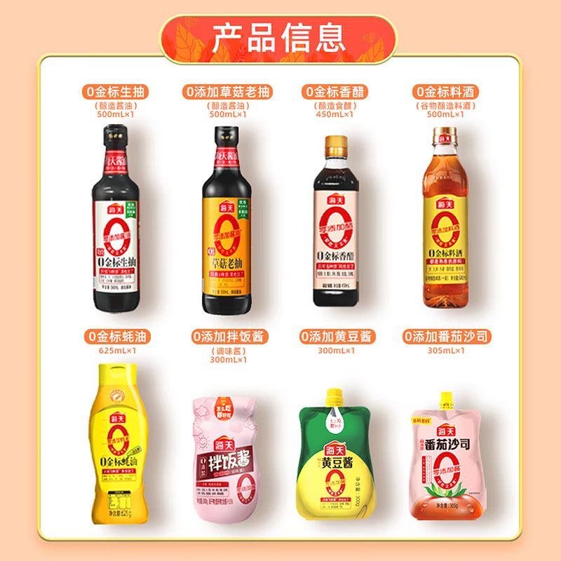 净含量:1950ml+1530g内配: 0金 标生抽(酿造酱油)500mL×1(PET) 0金 标香醋(酿造食醋)450mL×1(PET) 0金 标料酒(谷物酿造料酒)500mL×1(PET) 0添加拌饭酱(调味酱)300g×1(PET) 0添加番茄沙司305g×1(PET) 0添加黄豆酱300g×1(PET) 0添加 草菇老抽(酿造酱油)500mL×1(PET) 0金 标蚝油625g×1(PET)