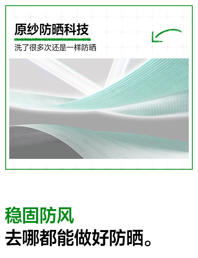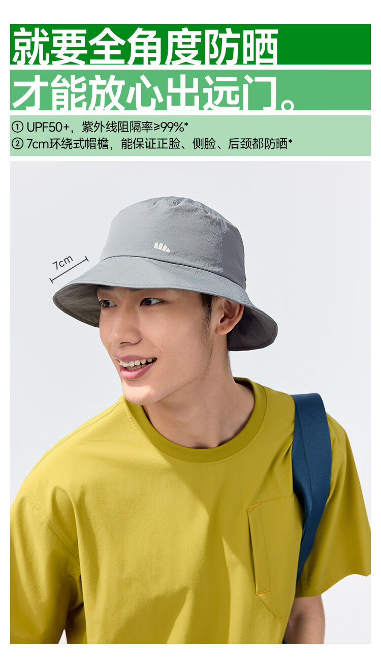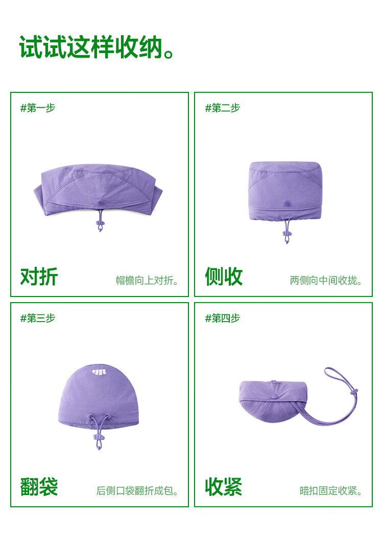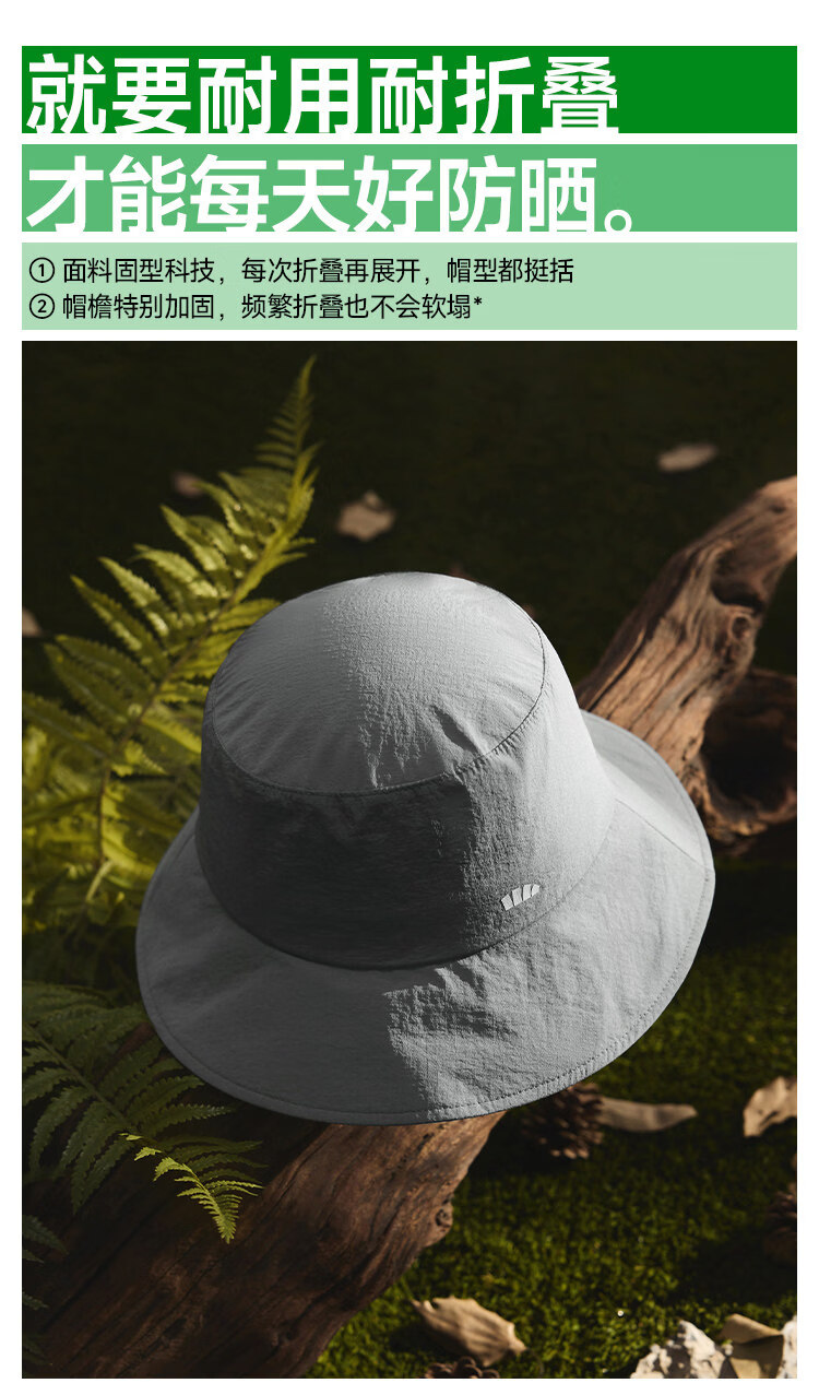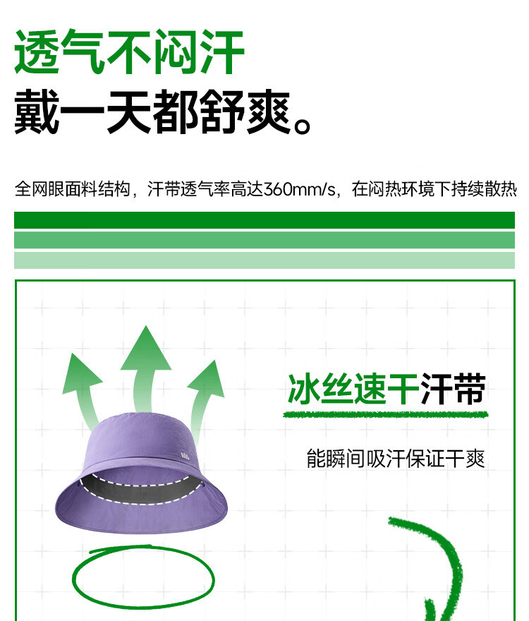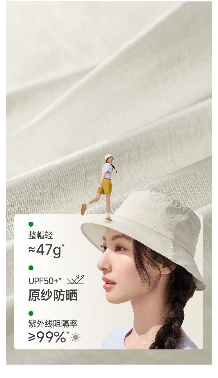 透气率高达360mm/s、持久防晒不闷热 帽顶自带收纳口、3秒收成掌心大小、小巧携带不占空间 UPF50+、环绕式全脸防晒、紫外线阻隔率>99%
