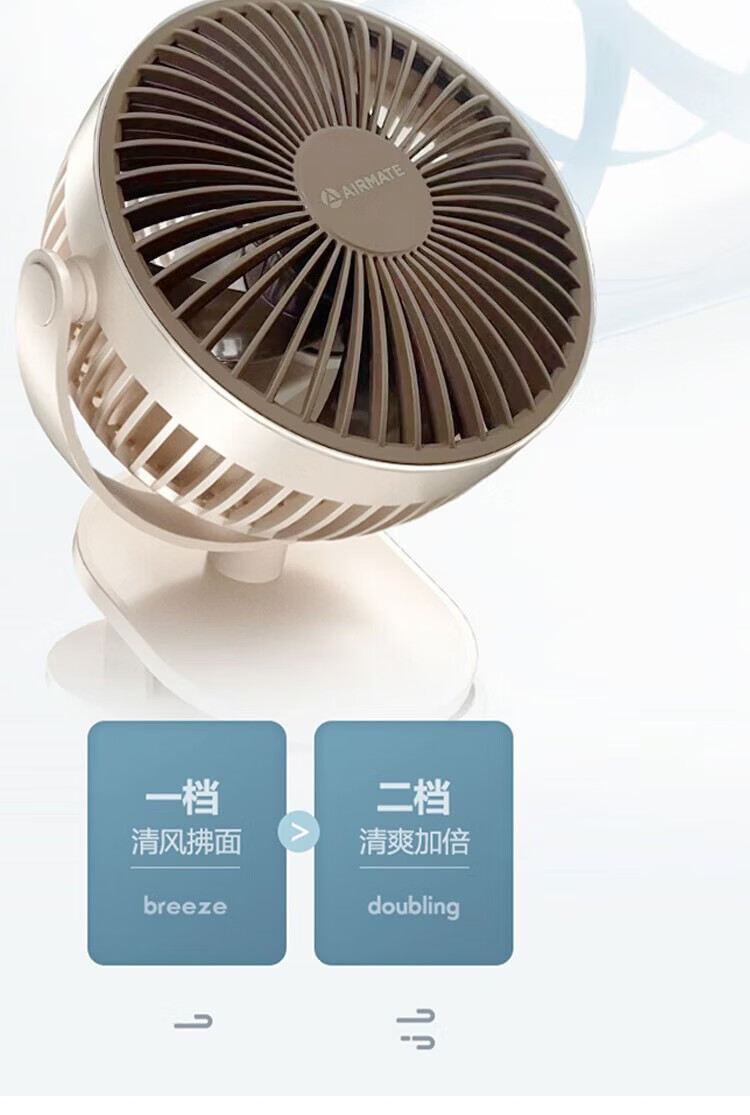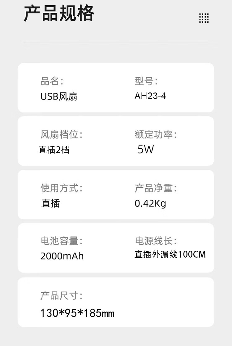 风扇档位:直插2档 额定功率:5W 产品净量:0.42kg 电源线长:直插约120cm(含机内部) 产品尺寸:130*95*185mm 69码:6914621250932