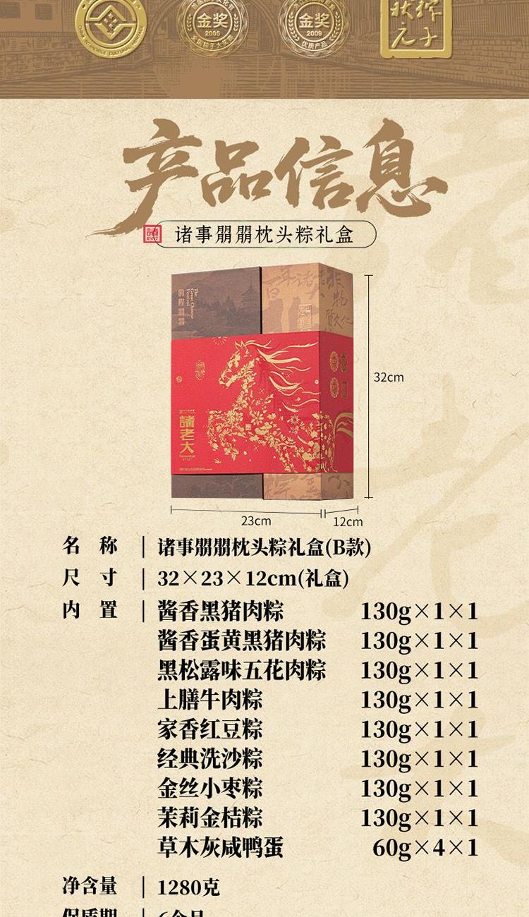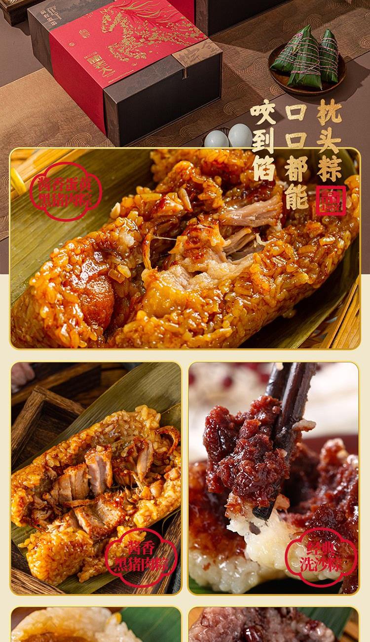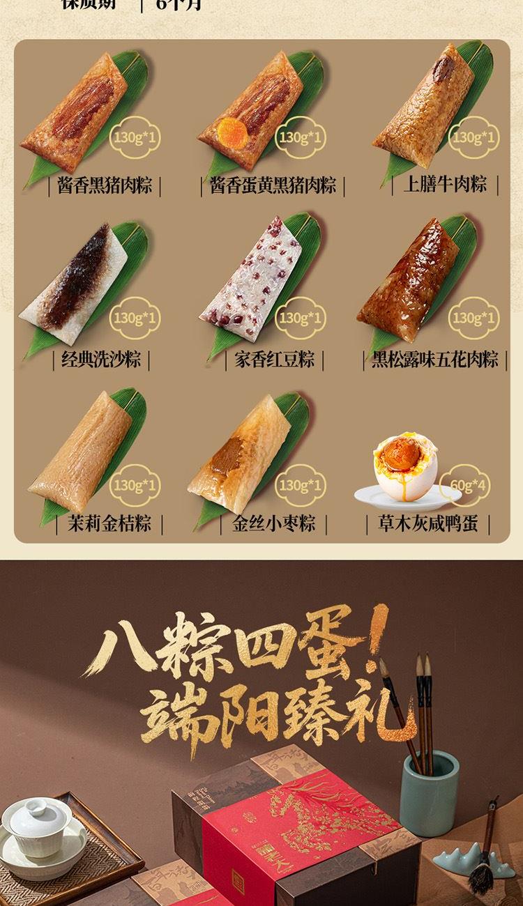 130克*1真空酱香黑猪肉粽 130克*1真空酱香蛋黄黑猪肉粽 130克*1真空黑松露味五花肉粽 130克*1真空上膳牛肉粽 130克*1真空经典洗沙粽 130克*1真空家香红豆粽 130克*1真空金丝小枣粽 130克*1真空茉莉金桔粽 60克*4真空草木灰咸鸭蛋