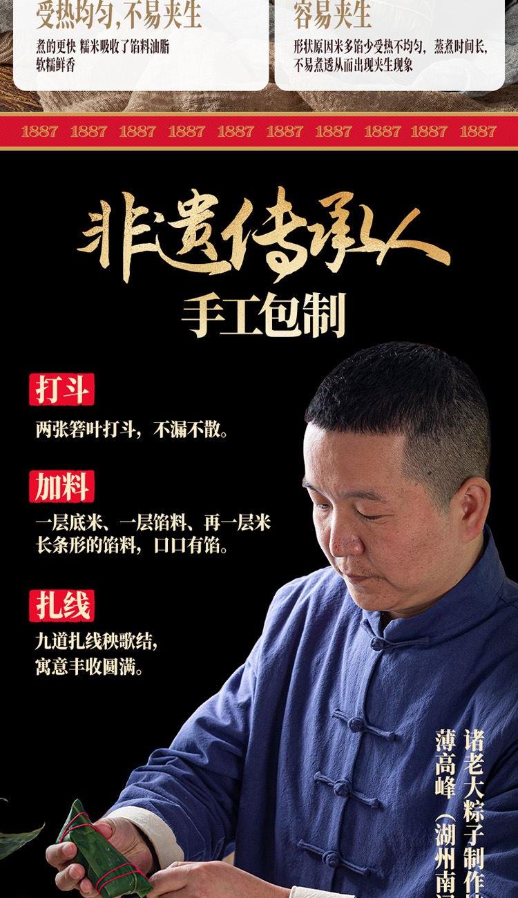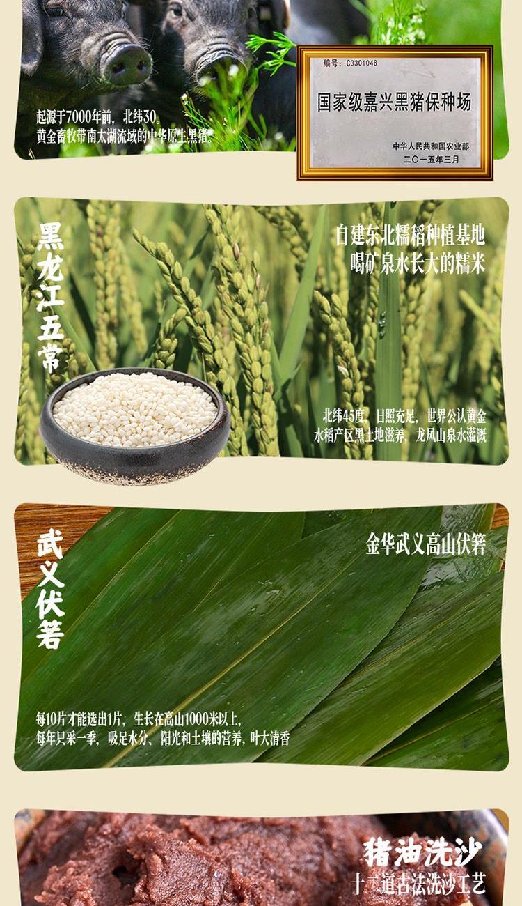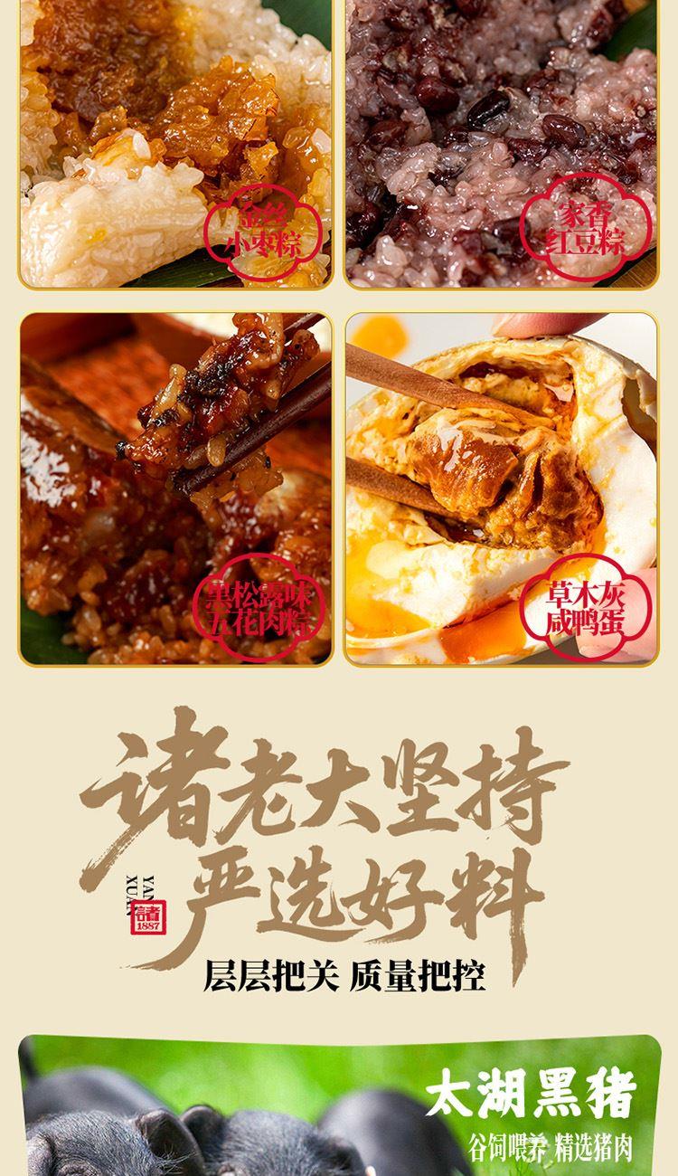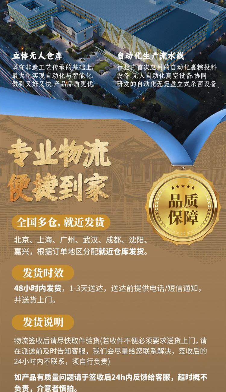 130克*1真空酱香黑猪肉粽 130克*1真空酱香蛋黄黑猪肉粽 130克*1真空黑松露味五花肉粽 130克*1真空上膳牛肉粽 130克*1真空经典洗沙粽 130克*1真空家香红豆粽 130克*1真空金丝小枣粽 130克*1真空茉莉金桔粽 60克*4真空草木灰咸鸭蛋