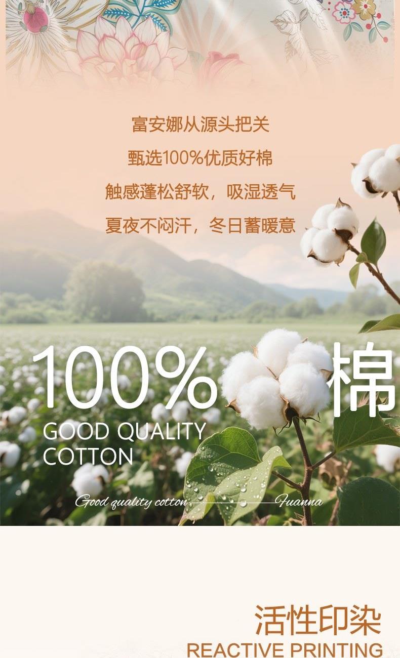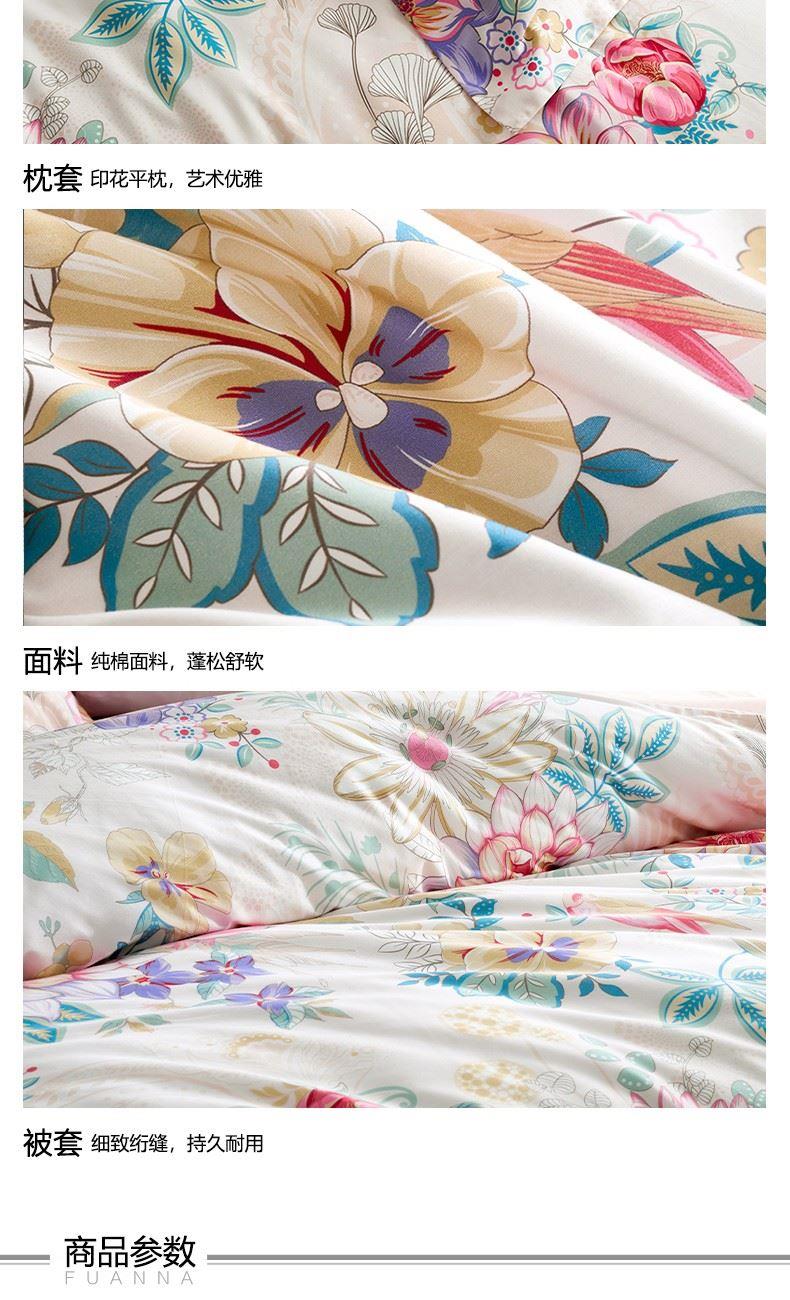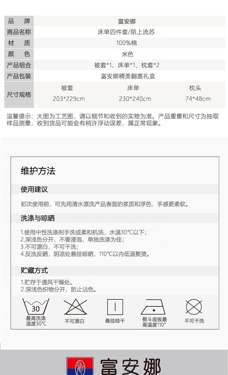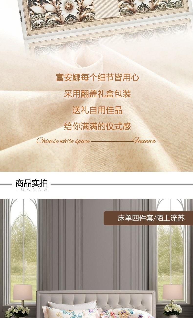 【产品 品 牌】富安娜 【产品材质】纯棉【产品规格】1.5/1.8m床 被套203*229cm*1件 床单230*240cm*1件 枕套74*48cm*2件【产品重量】毛重约2.8kg 净重约2.5kg【包装尺寸】翻盖礼盒55x35x8cm【每 箱 数量】5套
