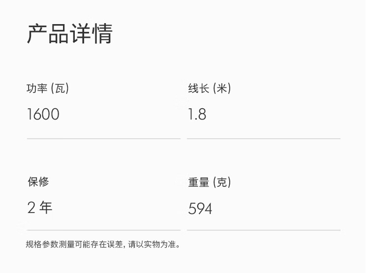 商 品型号:HD16 商品毛重:2.37kg 产品尺寸:长245mm;宽97mm;高78mm 功率:1600W 线长:1.8米 吹风机重量:0.59kg