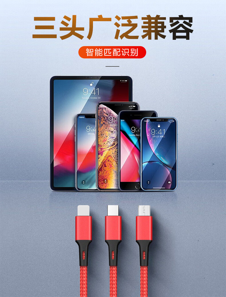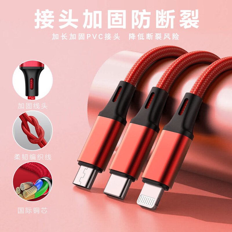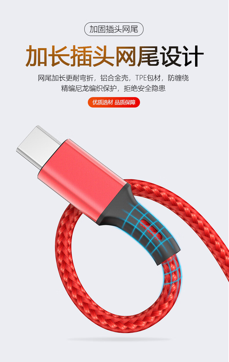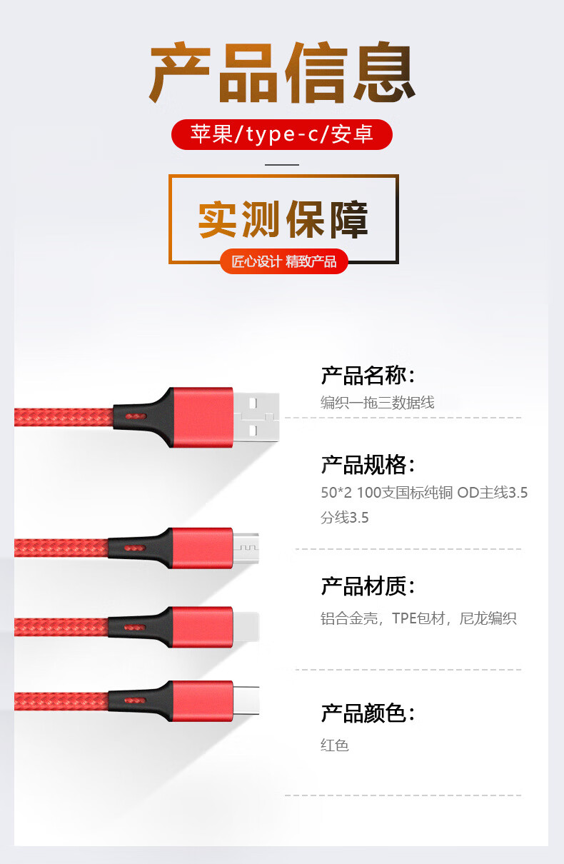 型号:C01 颜色:红色(黑色500起订) 长度:120CM 电流:Type-c 12W,苹果12W,Micro 10W 材质:铝合金+TPE+尼龙 表面工艺:尼龙编织 包装尺寸:170*68*25mm 产品重量:60g